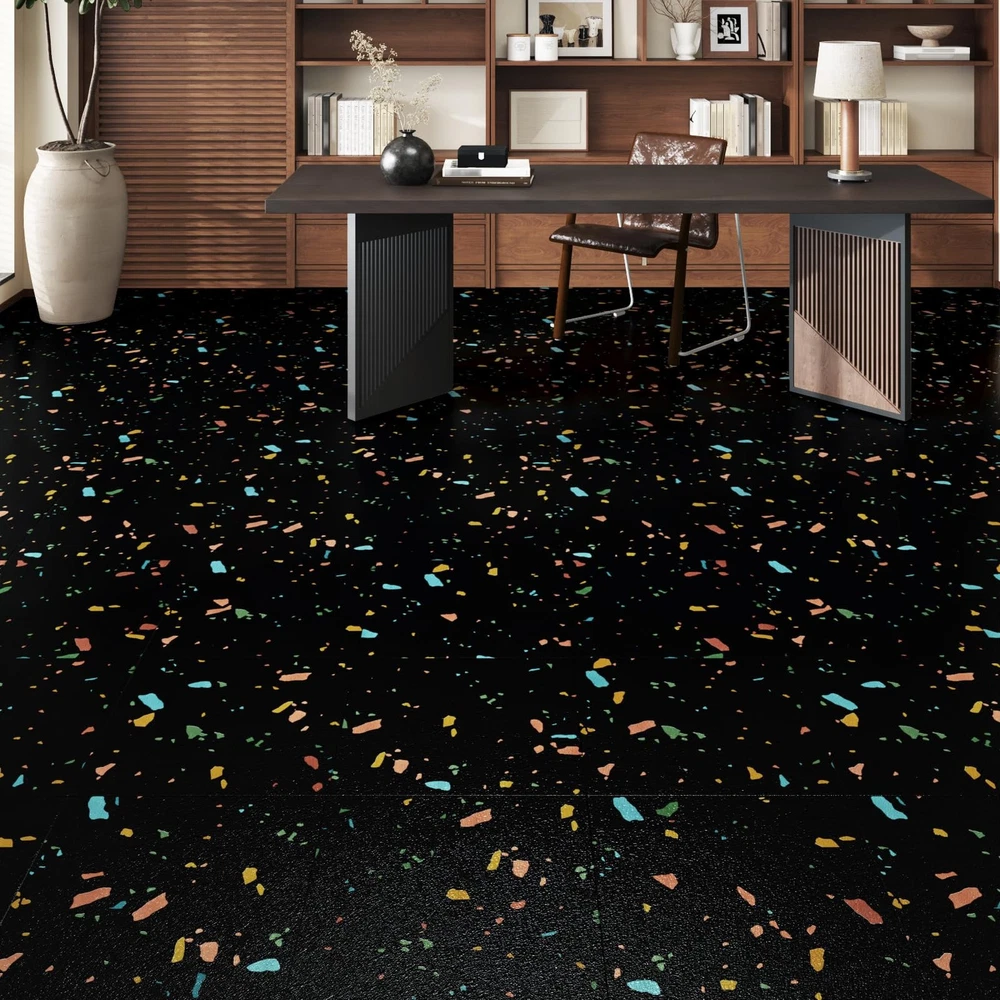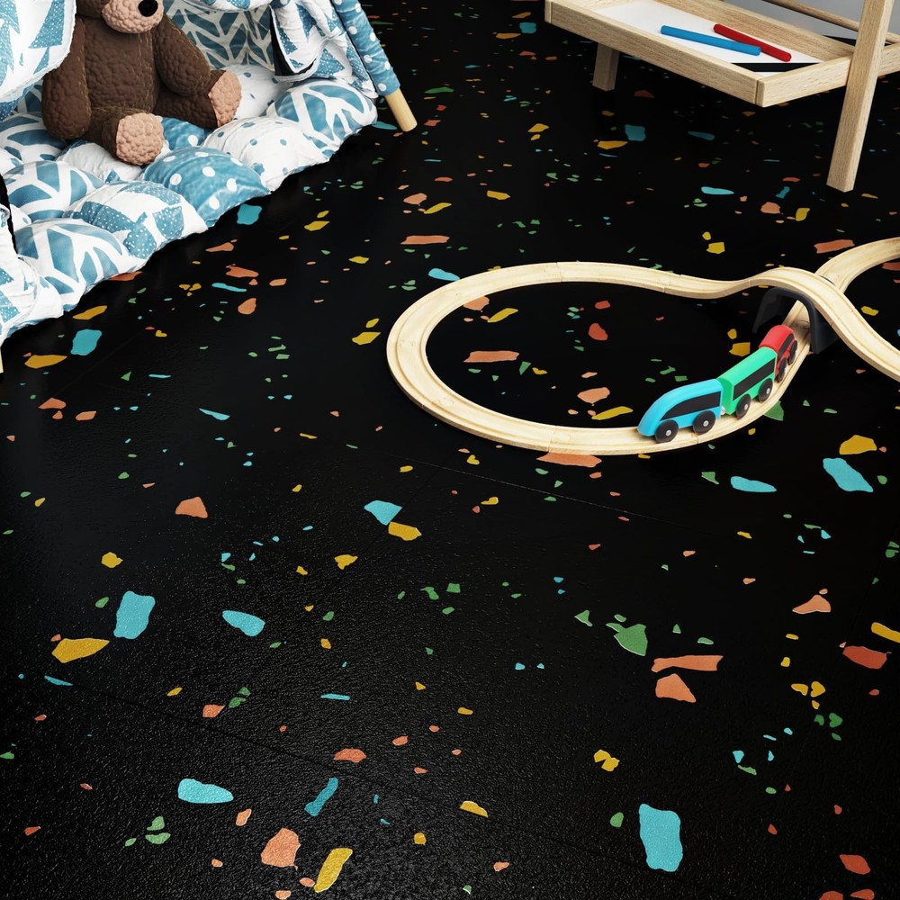 Introducing our versatile and stylish peel and stick floor tile, the perfect solution for quick and easy flooring updates! Our vinyl peel and stick flooring offers a hassle-free way to transform any space with minimal effort and maximum impact. Made with high quality materials, our vinyl flooring are durable, waterproof, and scratch-resistant, making them ideal for high-traffic areas like kitchens, bathrooms, and even garages. The black peel and stick tile design adds a touch of sophistication and modern elegance to your floors, enhancing the aesthetic appeal of any room. With the convenience of self-adhesive technology, our tile sticker can be easily installed without the need for messy glue or special tools. Simply peel off the backing and stick the tiles onto any clean, flat surface for a seamless and professional finish. These marble floor tile are perfect for renters looking for a temporary flooring solution that is easy to remove and won't damage the existing floors. The 12x12 inch size of our peel and stick vinyl flooring allows for easy customization and trimming to fit any space, making them suitable for various applications such as kitchen flooring, bathroom floors, flooring for bedroom, dance floors, and more. The kitchen tile floor can also be used to update garage waterproof flooring, creating a clean and modern look in your workspace. Not only are our floor covering practical and functional, but they are also easy to maintain and clean. The waterproof vinyl flooring is resistant to water, oil, and scratches, ensuring long-lasting durability and a beautiful finish for years to come. Say goodbye to sticky floor tiles that peel or bubble. Our self adhesive stick on flooring are designed to stay in place and withstand daily wear and tear. Convenient Size Options: Peel and stick floor tile are made of vinyl and the thickness is 1.5 mm. Available in convenient 12" x 12" tiles, we offer two versatile packs to suit your needs: A box containing 4 tiles (4 sq ft) for smaller projects or 20 tiles (20 sq ft) for larger transformations. Perfect for DIY enthusiasts seeking flexibility Premium colorful textured peel and stick flooring: Elevate your living space with our sophisticated terrazzo peel and stick floor tile that boast terrazzo textured. These vinyl flooring not only exude elegance in any room but are also remarkably durable. Black brings timeless versatility and bright style Multi-Purpose: Floor tiles peel and stick waterproof is an affordable solution for a quick and stylish floor upgrade. Floor tiles is incredibly easy to install and cut to fit, allowing for seamless integration into any layout. Peel and stick tile floor can be used in kitchen flooring, bathroom, bedroom, living room, office, garage floor, kids room, camper, warehouse, hallway, gym, dance studio, laundry room, farmhouse, etc Simple Clean & Long-Lasting Durability: Say goodbye to cumbersome floor care. With bathroom floor tile water and oil resistance, heat and scratch resistance, our stick on floor tiles are a breeze to clean. Simply wipe them down with a damp cloth or mop for effortless maintenance Self Adhesive & Removable: Please clean the surface before use and make sure to apply the floor sticker on a flat, dry and clean floor. No grouting or special tools needed for install. To remove waterproof flooring, soften the glue with a hair dryer, you can easily lift it off by inserting a pry bar or chisel into the edge of the renter friendly floor peel and stick. Suitable for renters and apartments