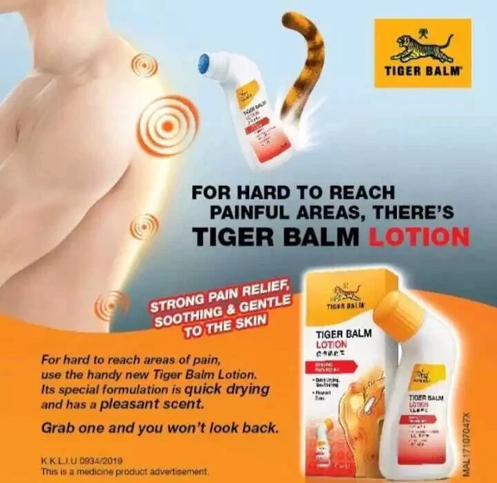 product description Leave pain behind with new Tiger Balm Lotion. Made with a unique Tiger Balm formulation, its quick drying, has a pleasant scent and comes in a handy bottle that can be applied directly to harder to reach places. Grab one and you wont look back. - Extra-strength pain relieving lotion - Convenient applicator for hard to reach areas - Pleasant scent, quick drying and non-staining liquid formulation - 80ml