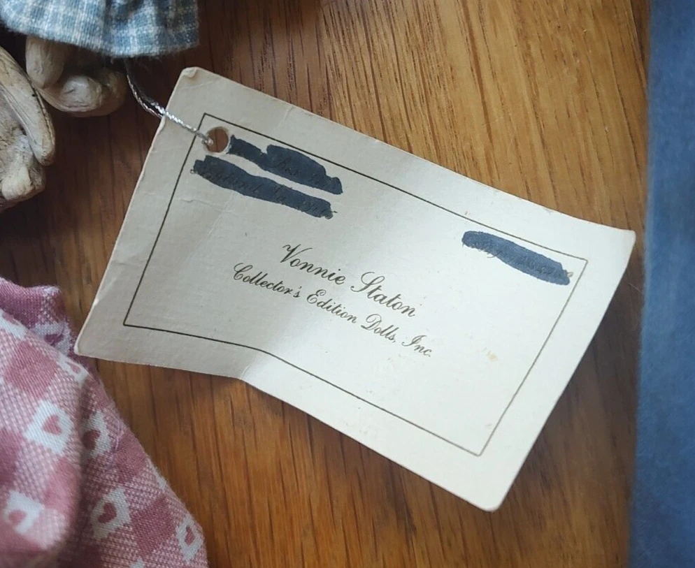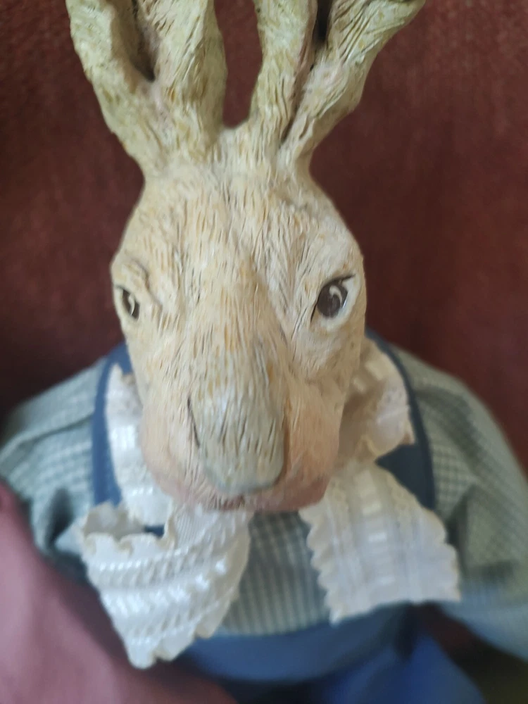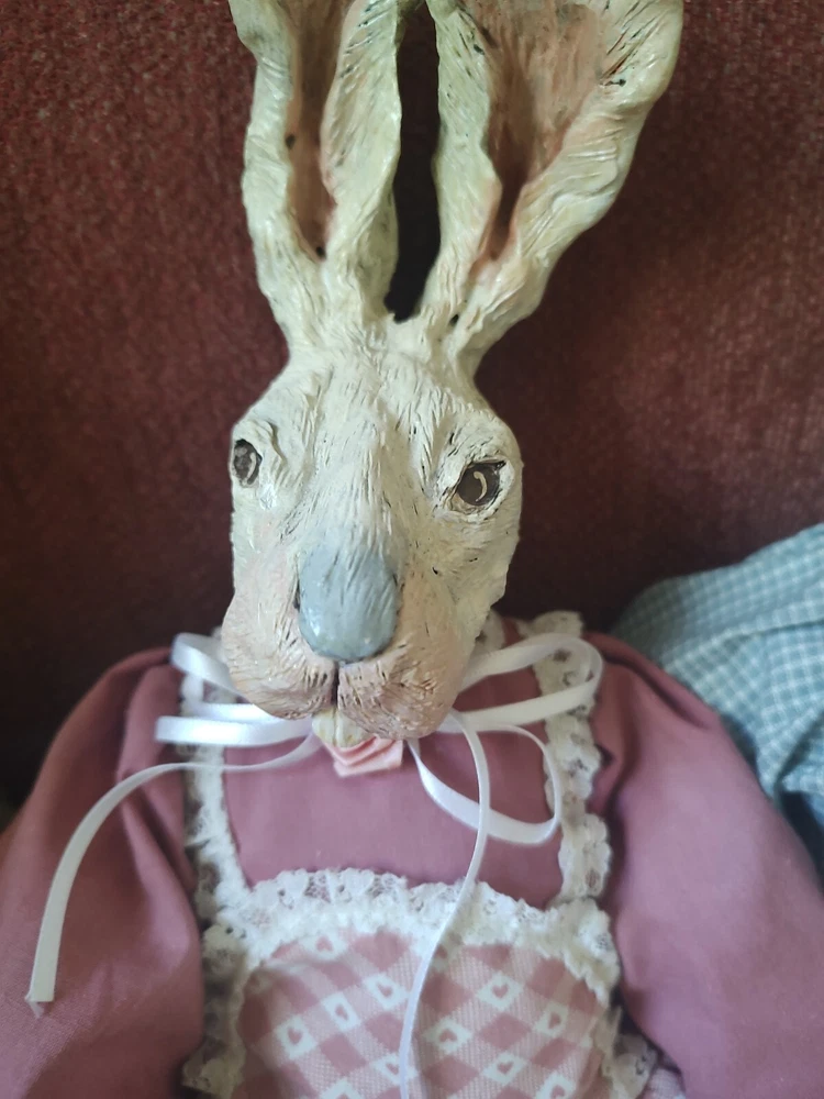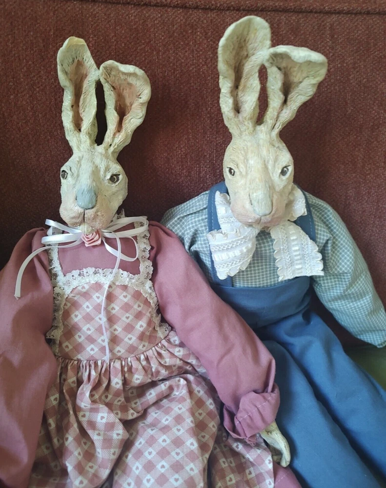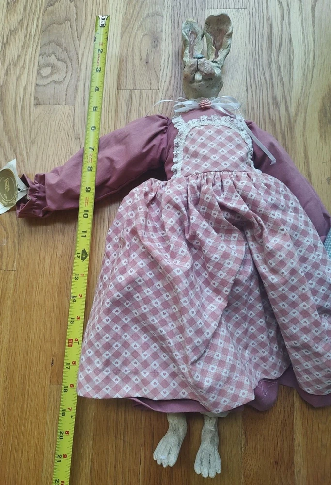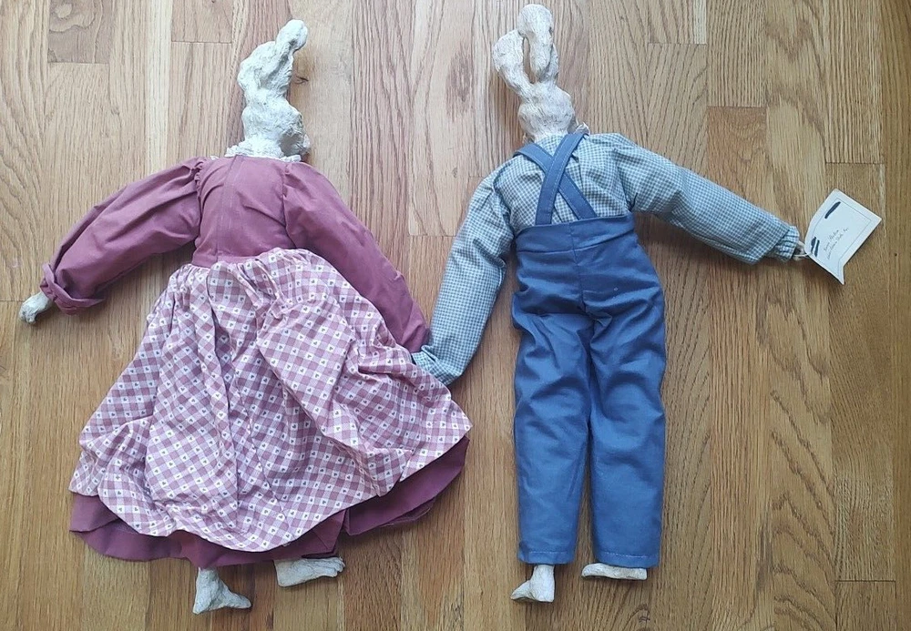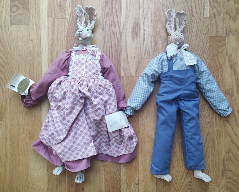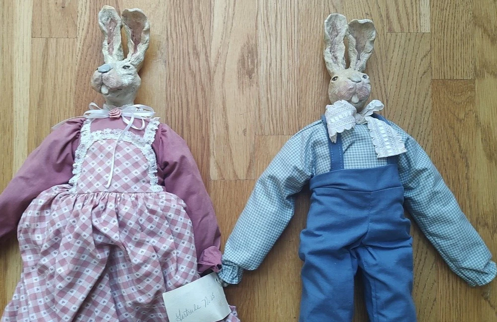 20 inch Mr and Mrs Rabbit Couple Hand Crafted Resin Cloth Artist Vonnie Staton. Easter. Condition is preowned. Shipped with Ground Advantage. This wonderful hand crafted rabbit couple is in very good condition. The faces and hands and feet are made from resin and the bodies are made from cloth. They stand 20 inches tall. Thanks for looking at these items and Happy Shopping!