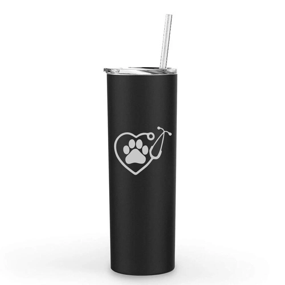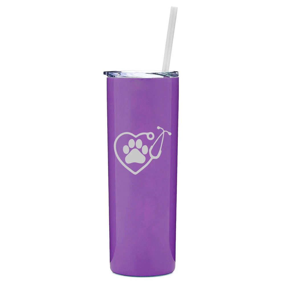 20 oz Skinny Tumbler Travel Mug w Straw Heart Stethoscope Vet Tech Veterinarian