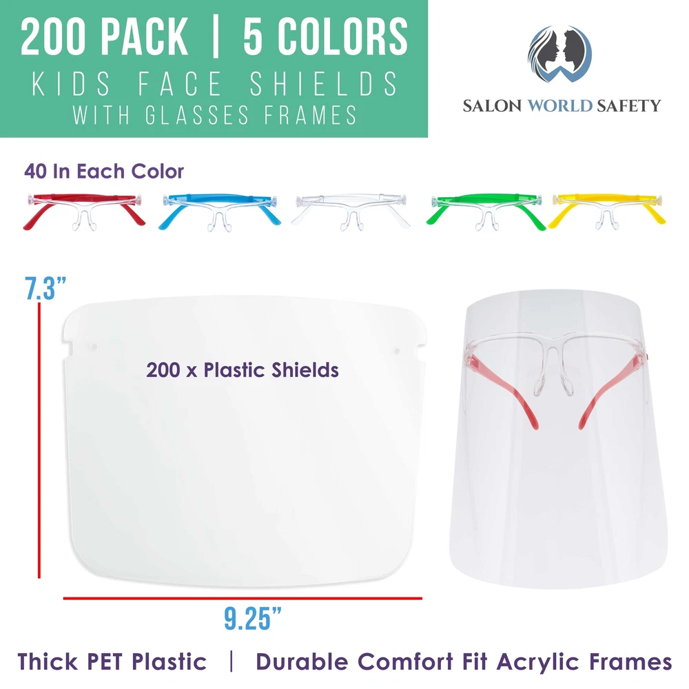 TCP Global Ebay Storefront Ordering | Shipping | Returns | International Product Information SWS FS-CG200200 200 Kids Face Shields with Glasses Frames (20 Packs of 10) - 5 Colors, 40 Each - Protective Children's Full Face Shields - Anti-Fog PET Plastic CASE of 200 KIDS FACE SHIELDS with GLASSES FRAMES (20 Packs of 10): Includes 200 kids face shields, 40 each of 5 colors (green, yellow, blue, red and clear) internally mounted comfort fit acrylic glasses frames that kids will love! Sanitary, durable, lightweight, and comfortable premium protective face shields made with ultra-clear thick PET plastic. Wear the face shields just like you would when wearing glasses over your ears and on your nose bridge. Wear your eyeglasses underneath. FULL FACE PROTECTION while AVOIDING the HEADBAND: Safety full-length face shield with a flexible wrap-around design that provides side and front face protection. The shields have 180 degrees of protection and provide full coverage of the eyes, nose, and mouth to help prevent droplets of saliva, coughs, sneezes, and other foreign substances from reaching your face. Shield dimensions: 7.3" high x 9.25" wide. ULTRA-CLEAR and ANTI-FOGGING: Face shields provide super clear visibility and have superior optics that let in the maximum amount of light, while the anti-fogging material resists fog under extended use. The shield is crystal clear, after peeling off both layers of the protective film. Reusable after disinfecting. Some assembly required. IDEAL KIDS WEAR: Used by kids at home, school, child care, playing indoor or outdoor, and other fun activities. Face shields not intended to be used as toys and also not intended for use by children less than 5 years of age. Perfect for ages 5-14 with adult supervision. FACE SHIELDS SHIP FROM THE USA: Salon World Safety Brand is a division of TCP Global Corporation, a trusted worldwide company that has been in business for over 45 years. View all categories Warehouse Locations San Diego, California South Carolina