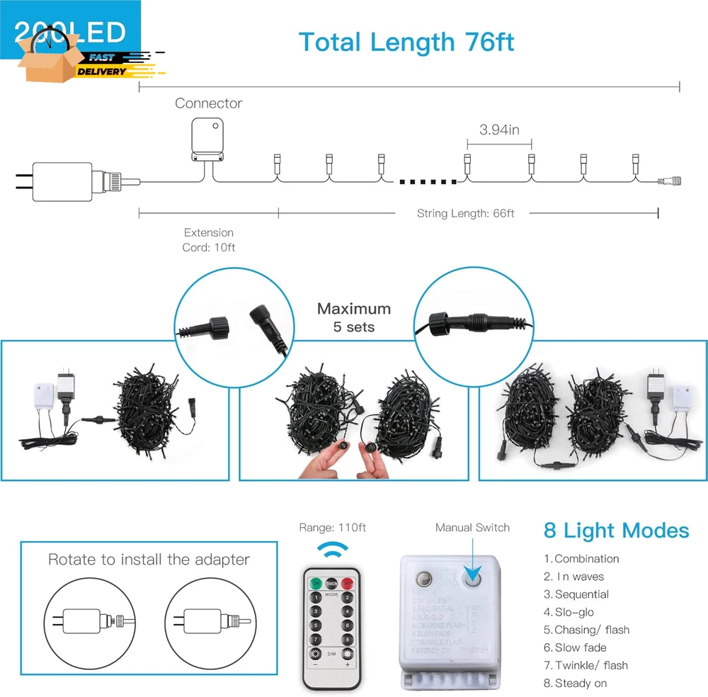 200 LED Multicolor Christmas Lights, 8 Modes Blinking Christmas Tree Lights with