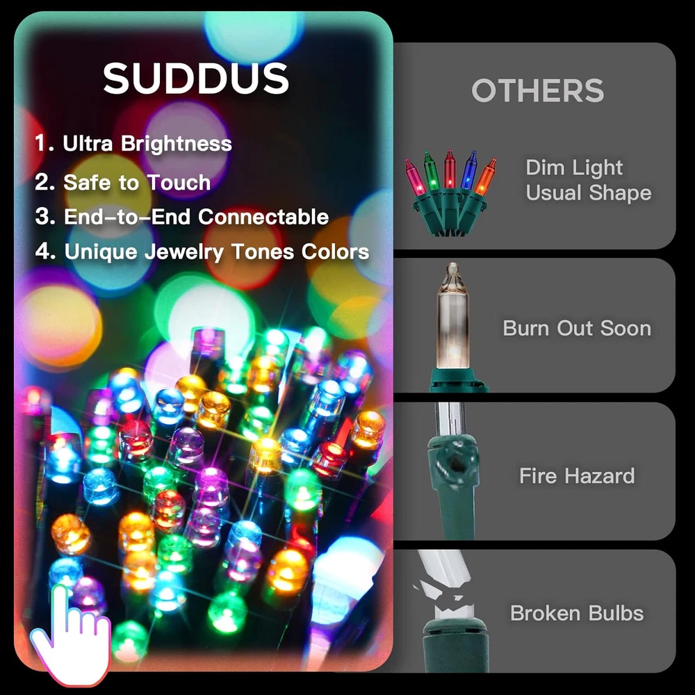 Store New Arrivals Add to Favorite View Feedback Contact Fast deliveries to the customer's home Quality customer service John Make the customers happy! 200 LED Multicolor Christmas Lights, 8 Modes Blinking Christmas Tree Lights with Remote, Colored Christmas String Lights for Outdoor Indoor Party Decoration Description πŸŽ„[Long Length and END-TO-END]: 200 LED multi colored Christmas Lights 66ft long, plus a 10ft extension cord. The updated mini outdoor Christmas lights are end-to-end connectable. It could be extended to a maximum of 6 light strings (total 396ft/1200led). Choose more than one, these extra-long strings of lights can be used to decorate any big scene you want. Just need 1 remote to control all lights and 1 socket for electricity. πŸŽ„[Super Bright and 4 Brightness Levels]: Super brightness Christmas tree lights to give your Christmas decoration icing on the cake. Both day and night, it is particularly conspicuous. The Christmas lights have 4 brightness levels, you just need to press the dim +/- button on the remote for settings of 100%, 75%, 50%, or 25%. πŸŽ„[5 Gorgeous Colors and 8 Modes]: SUDDUS blinking christmas lights have five unique colors: lime green, aquamarine, rose, ruby, and orange. SUDDUS exclusive multi-color Christmas lights have 5 superior jewelry tones colors, and higher quality. This 200led colored Christmas lights have 8 lighting modes: steady on and 7 flashing modes (comb, in waves, sequential, slo-glo, chasing/ flash, slow fade, and twinkle/ flash). Creating a colorful and twinkling dream world for you. πŸŽ„[Waterproof and Safety]: IP44 Christmas string light is waterproof (Both the plugs and end-to-end connectors have caps to block the ingress of water), suitable for indoor and outdoor decorations, including trees, pathways, garlands, houses, roofs, balcony, party, porch, garden and anywhere. UL588 safety-certified Christmas lights come with 3 strands of wires, which can withstand long working times. So it will be more durable. It will not have an overheating problem. Save to touch any time. πŸŽ„[Remote Control and Timer Function]: The range of the remote control is 32ft. With a wireless remote, you don’t need to walk across your yard to control the lights. The updated XMAS lights have 3 different Timer Functions to meet your various needs. When you press this button, you can free your hands and it will work functionally. Product Description Holiday Joy Shines Brightest with Festive Christmas Lights! The video showcases the product in use. The video guides you through product setup. The video compares multiple products. The video shows the product being unpacked. The colorful and twinkling lights bring joy to children and families, often becoming a source of wonder and excitement. Christmas lights are not just decorations; they become a backdrop for family photos and cherished memories. A Tree Filled with Kids' Holiday Delight Christmas Comfort Begins at the Fireplace's Glow Make Your Home's Yard the Talk of the Town From lawn to porch, create a merry winter wonderland with SUDDUS Christmas Lights! A well-decorated Christmas yard becomes a visual focal point in the community, drawing the attention of neighbors and passersby. It becomes a beacon of holiday cheer and celebration. IP44 Waterproof No matter what the weather, this Christmas light can work normally. Perfect for Christmas trees, garden decorations, balconies, shrubs, and fences. Safe to Touch It is safe to touch it at any time, do not worry about overheating. The light comes with 3 strands of wires, which can withstand a long working time. 8 Modes Christmas lights have 8 lighting modes: 1 steady on and 7 flashings. The memory function of the remote control can remember the last mode you set. 3 Timer 6: 6hr on, 18hr off. 8: 8hr on, 16hr off. 6639: 6hr on, 6hr off, 3hr on, 9hr off, every 24 hours Limitless Creativity with Connectable Christmas Lights! Whether you're decorating a vast garden, an expansive front yard, or creating a breathtaking holiday scene within your home, connectable Christmas string lights provide the flexibility and adaptability you need to bring your creative ideas to life. SUDDUS CHRISTMAS LIGHTS Add to Cart Add to Cart Add to Cart Add to Cart Add to Cart Add to Cart Add to Cart Customer Reviews 4.5 out of 5 stars 458 4.4 out of 5 stars 582 4.5 out of 5 stars 700 4.4 out of 5 stars 6,517 4.3 out of 5 stars 683 4.3 out of 5 stars 3,151 4.4 out of 5 stars 6,517 Price $29.99 $ 29 . 99 $27.99 $ 27 . 99 $24.99 $ 24 . 99 $14.99 $ 14 . 99 $18.99 $ 18 . 99 $15.98 $ 15 . 98 $14.99 $ 14 . 99 Power Source Plug in Plug in Plug in Battery Battery USB Battery Color Multicolor Warm White Warm White Warm White Warm White Warm White Multicolor LED Quantity 200 LED 200 LED 100 LED 200 LED 100 LED 200 LED 200 LED Connectable YES YES YES NO NO NO NO Special Features Unique Light Color Diamond-Shape Led Bulbs Clear Wired Strand Flexible Copper Wire Globe Shape Bulb Vertical Waterfall Lights Flexible Copper Wire Item model number SDSW-200MC Light Source Type LED Style Modern Number of Items 1 Power Source Corded Electric Number of Light Sources 200 Control Method Remote Switch Style Touch Theme Jewelry,Christmas Batteries Included? No Controller Type button,remote Batteries Required? No Wireless Communication Technology Infrared Material Plastic, Rubber Seasons winter Package Dimensions 7.13 x 4.06 x 3.74 inches Included Components Remote Indoor/Outdoor Usage Outdoor, Indoor Light Color Multicolor Water Resistance Level Waterproof Item Weight 1.1 pounds Occasion Easter, Wedding, Christmas, Halloween, Thanksgiving Special Features Corded Special Feature Corded Part Number EXS-S-0200-R Shade Color Multicolor Color Multicolor Voltage 120 Volts Size 200 LED ABOUT US We offer the best prices around on high quality products. Our E-store includes media such as books, movies, music and games while offering electronics, toys, sporting apparel, clothing, tools, general home, 