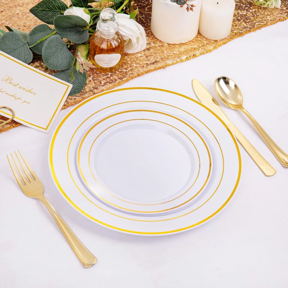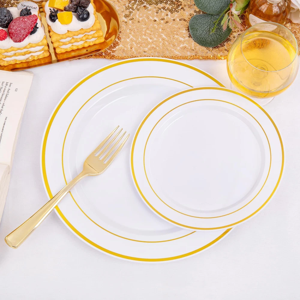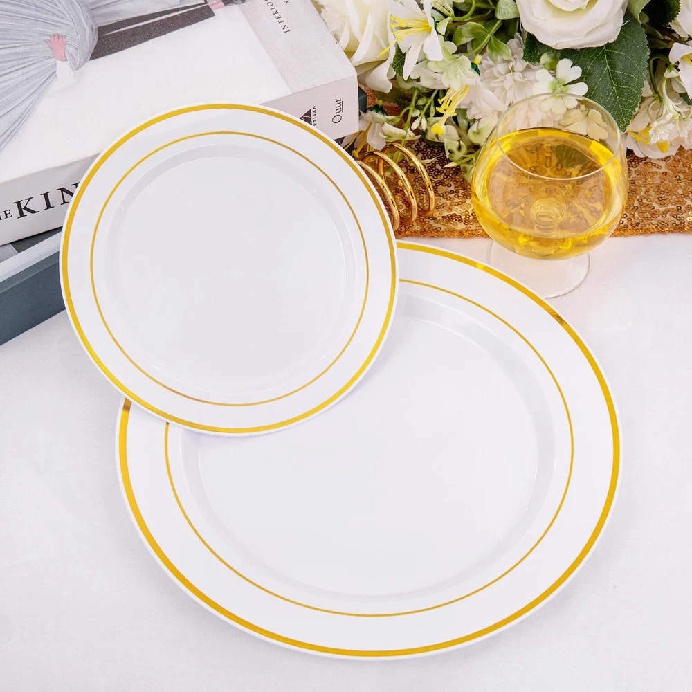 Healthy and Good Quality: We promise the materials of plastic plates for party are BPA free and no-toxic. These gold plastic plates are made of heavy duty and durable plastic, will not easily bend or break. If you want reuse these white and gold plastic plates, just simply wash them with water. Elegant Design:Our disposable plastic plates use the most classic and elegant design, white plates with gold rim, these plastic party plates will definitely give a deep impression for your guests at the event. Ideal for Any Occasions: This pair of gold disposable plates are suitable for dinner,dessert,salad,cake and appetizer. The elegant plastic plates are sufficient for 100 guests, also perfecting for parties, birthday, weddings, Thanksgiving, Christmas and others any occasions. Great Combination: You will receive a great plastic party plates set, including 100 gold dinner plates and 100 gold salad plates. After a fun,if you don't want waste you precious time, you can choose to discard these fancy wedding plates or reuse them. The decision is yours. Satisfactory Service: We use the strongest packaging to ensure that your heavy duty disposable plates can arrive with no damage. If you have any questions after receiving the package, you can us and we will give the most satisfactory answer for you.