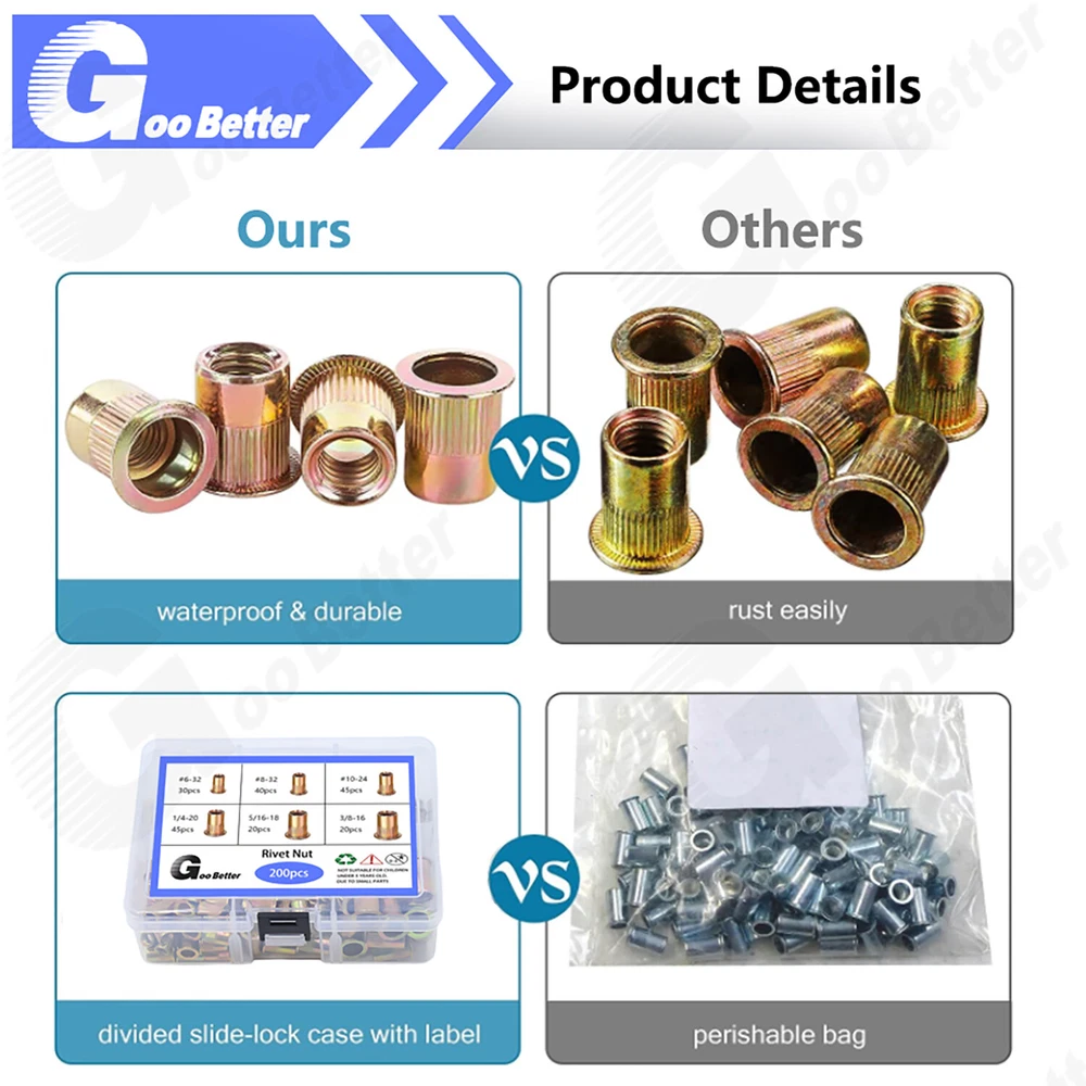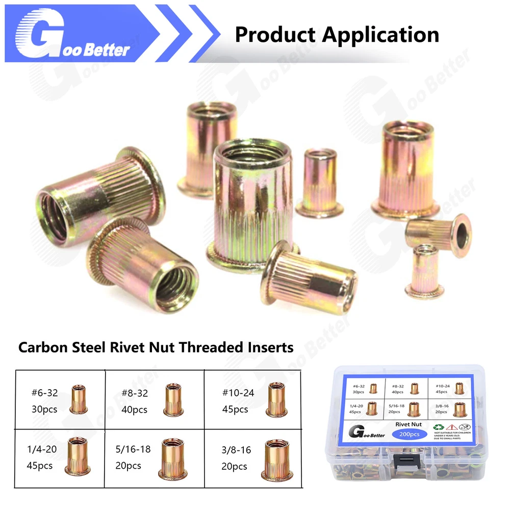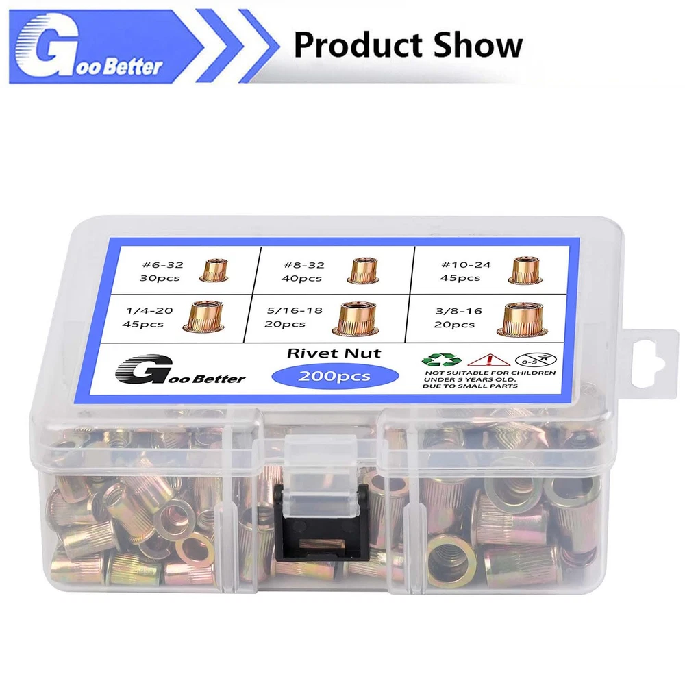 200 Pcs Rivet Nut Kit 6# - 3/8" UNC Flat Head Rivnut Nutsert Assortment Tool Kit Home About Us Feedback Add to Favorite Contact Us STORE CATEGORIES All Categories Fasteners Screws Bolts Nuts Washers Titanium Bolt/Washer/Nut Rivets Hexagon Pillars Dowel Pins/Cotter Pin Threaded Bar Assortment Kit 200 Pcs Rivet Nut Kit 6# - 3/8" UNC Flat Head Rivnut Nutsert Assortment Tool Kit Product Features: ● 【High Quality 】: The rivet nut tool is made from thick carbon steel with heat treated finish which protect against corrosion and give this tool added durability and strength. The rivet nut kit include 200 Pcs steel rivet nuts, provide excellent durability, high strength and corrosion resistance. ● 【Box with Compartments】: Various sizes of nuts are stored in various compartments inside the box, everything is well organized for easy access and storage. The reinforced box is labeled on both sides with a detailed size information sheet, so that the correct size can be quickly matched to the correct size even when mixed up. ●【Versatile Application】:This kit is suitable for a wide range of uses, including automotive, industrial, construction, and DIY projects. ●【 Exceptional Customer Service】 : We are committed to providing high-quality products and excellent customer service. If you are not completely satisfied with your purchase, please contact us, and we will ensure that any issues are resolved promptly. Product Specifications: ● Material: Carbon Steel ● Type: Blind Rivets ● Inch ● Package Included #6-32 -------- 30 Pcs #8-32 -------- 40 Pcs #10-24 -------- 45 Pcs 1/4"-20 -------- 45 Pcs 5/16"-18 -------- 20 Pcs 3/8"-16 -------- 20 Pcs In total 200Pcs Package included: according to your choice. Select your requirements from the drop down menu above. Note: This product contains small parts, please keep it away from babies, small children, and pets. (If the size you are looking for is not listed, please contact us and we will be happy to help!) Home Search About Contact Categories All categories Assortment Kit Fasteners Screws Bolts Washers Nuts About us About Item After Sales Service Guarantee Payment About us ● If you are satisfied with the products, I expect you can leave us positive feedback. ● If you have any problems or be not satisfied with them, please feel free to contact us, we will reply to you within 24 hours. About Item ● All products in our store are elaborately made,Please feel free to buy. If you need other specifications, please contact us. If you buy a large quantity, we can accept your quotation. After Sales Service ● We are committed to providing excellent customer service. If you have any problems with our products, please contact us immediately and we will be happy to assist you to ensure your satisfaction! We will do our best to respond to your email as soon as possible. ● We will do our best to respond to your e-mail as soon as possible, but due to the large number of e-mails we receive each day and the time difference, we may not be able to respond to your e-mail immediately. Please allow up to 24 working hours for us to respond. Guarantee ● Good quality. Buy with confidence! ● If you are not satisfied when you receive your item, please return it within 7 days for a replacement or money back. Please contact me before you return it. ● Not accept returning of electronic components. ● Full refund after we receive our original item, Note: Return shipping is to be paid by the Buyer. ● We maintain high standards of excellence and strive for 100% customer satisfaction! Feedback is very important to us. We request that you contact us immediately before you give us neutral or negative feedback, so that we can satisfactorily address your concerns. Payment ● We accept multiple payment methods supported by the platform.We only accept your Ebay Address, Please Make sure it's 100% right.The items you ordered will be shipped out in 2 business days by Air Mail when your payment is clear.