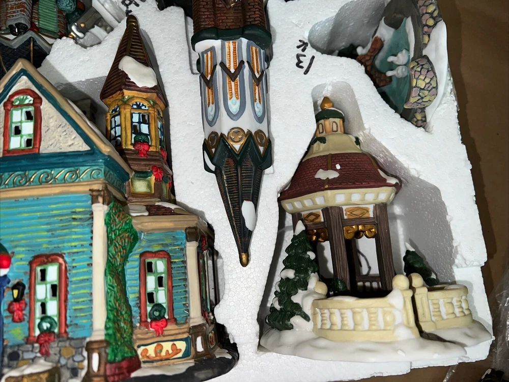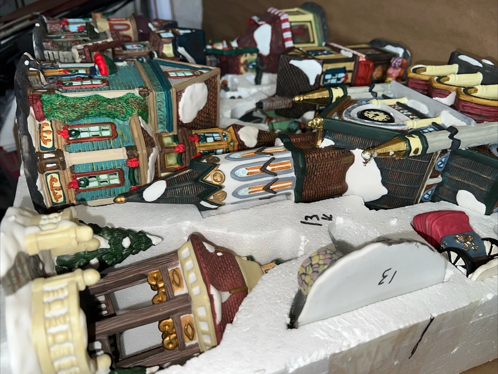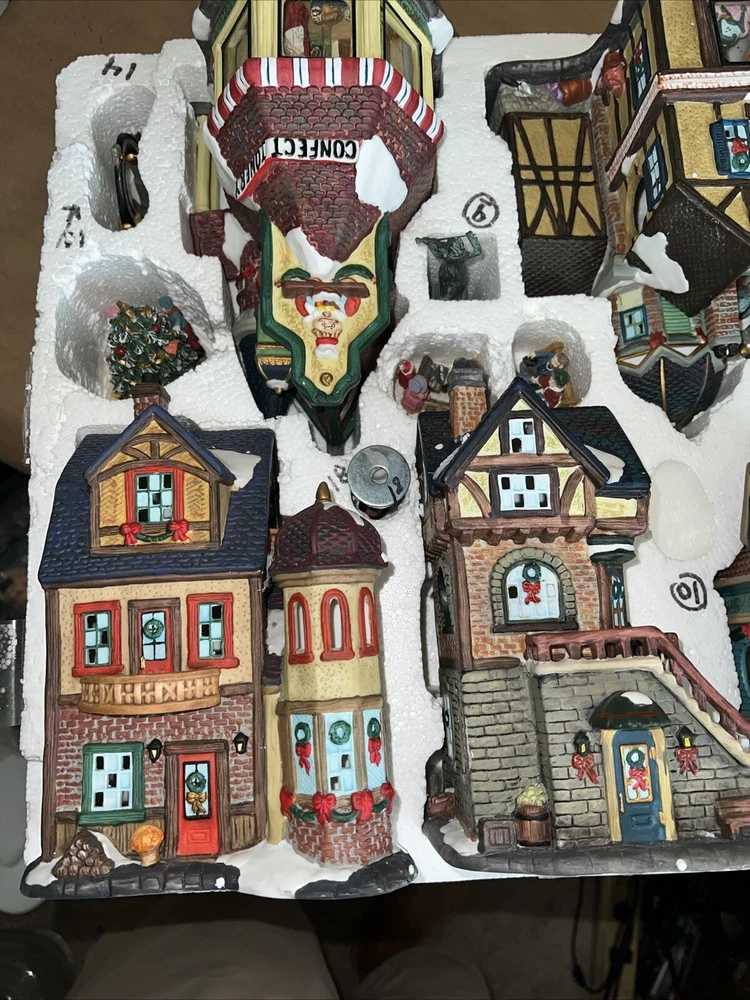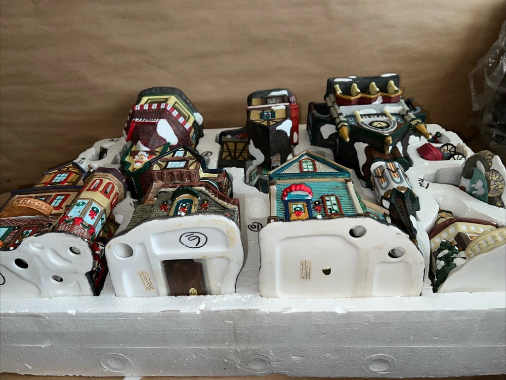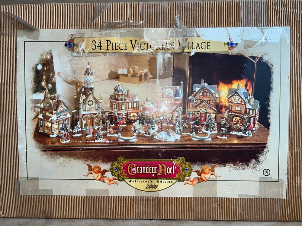 This exquisite 34-piece Victorian Village Set from Grandeur Noel is a must-have for any collector. The set features a variety of buildings and figures, all crafted from high-quality porcelain and painted in vibrant colors. It's perfect for creating a festive Christmas atmosphere in any room, and the set comes complete with a lighted village scene. The set is an original, from the year 2000, and is packaged in a beautiful box for easy storage. It's ideal for adults who appreciate the beauty of Victorian-style Christmas decorations, and would make a great addition to any collection. The set is not handmade, but it's sure to bring joy to anyone who displays it. Missing item #10. Everything else is in the box. Just like new.