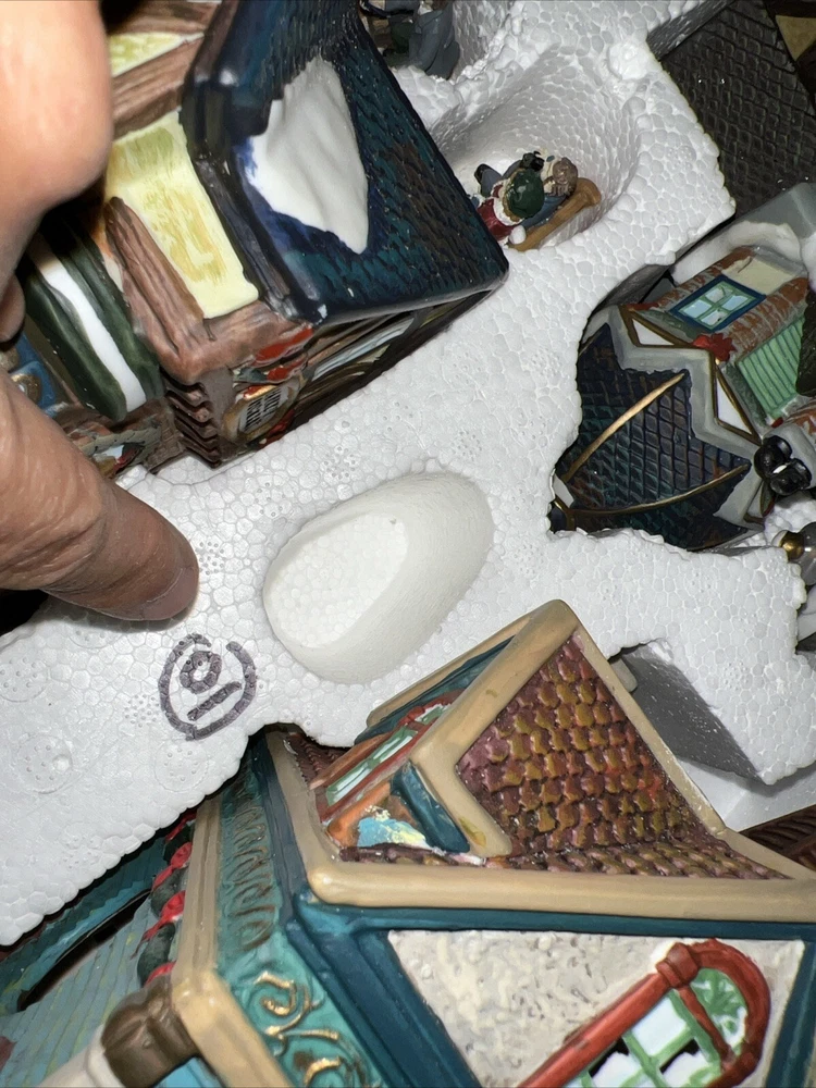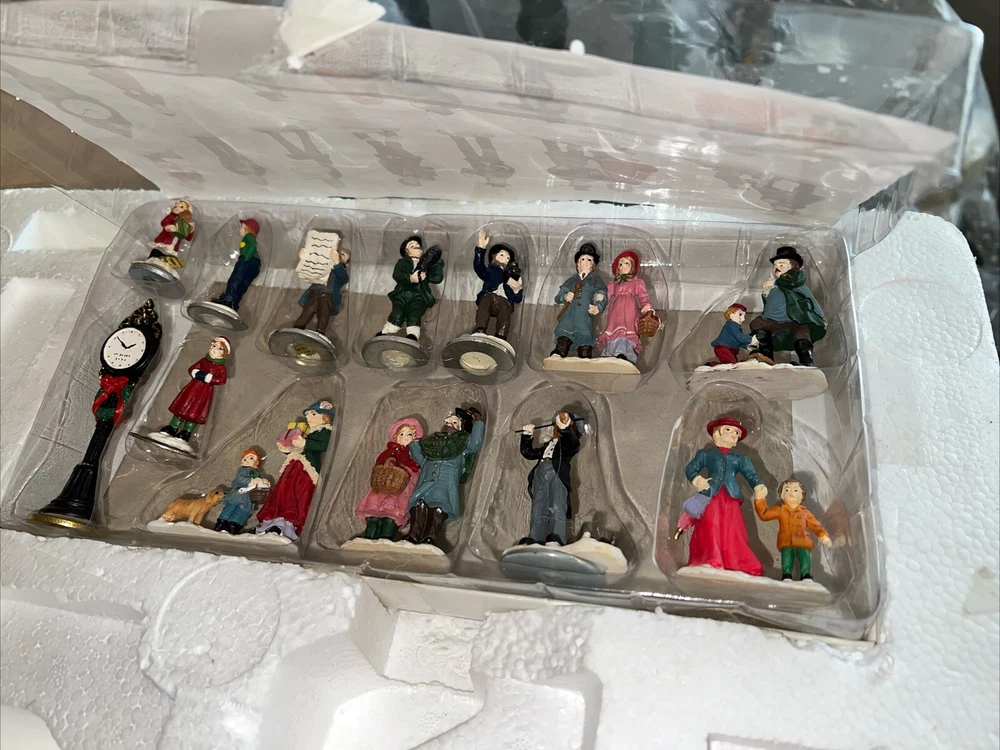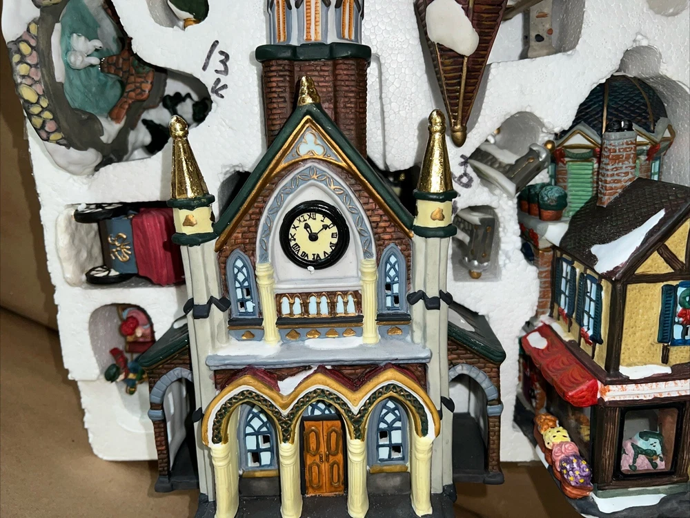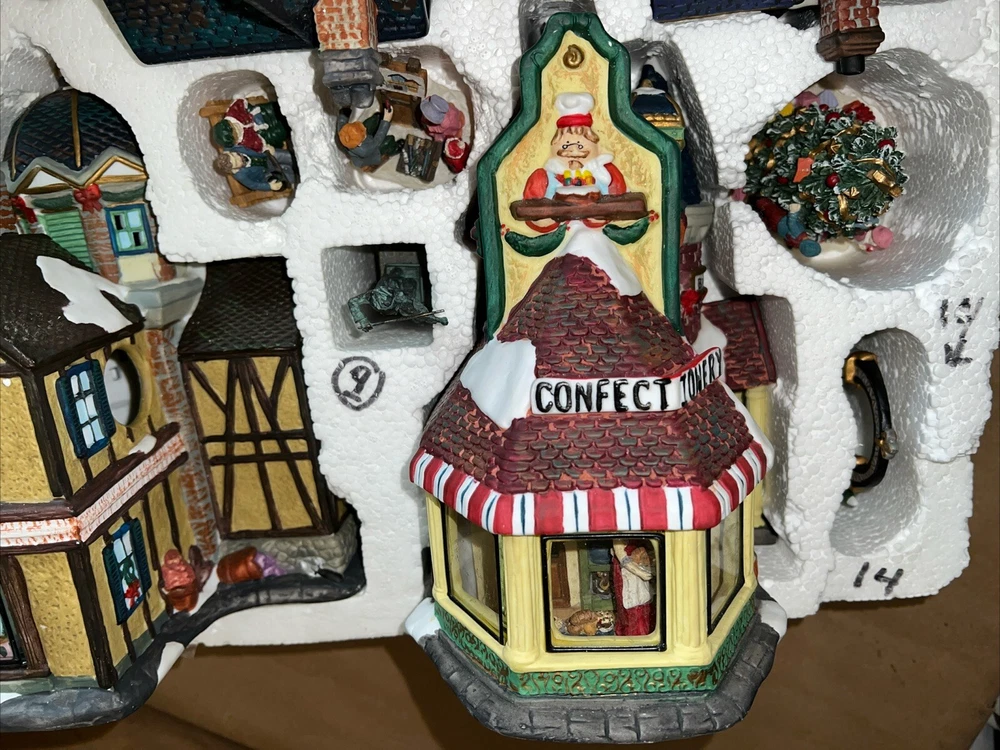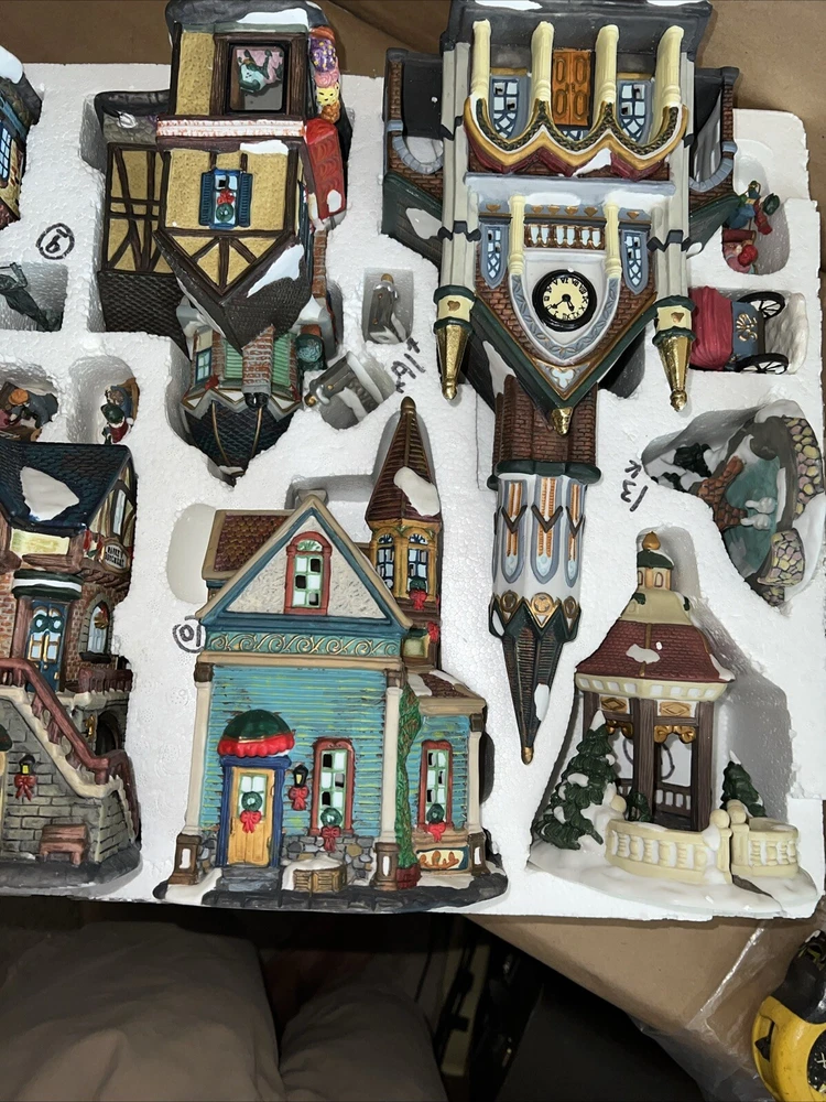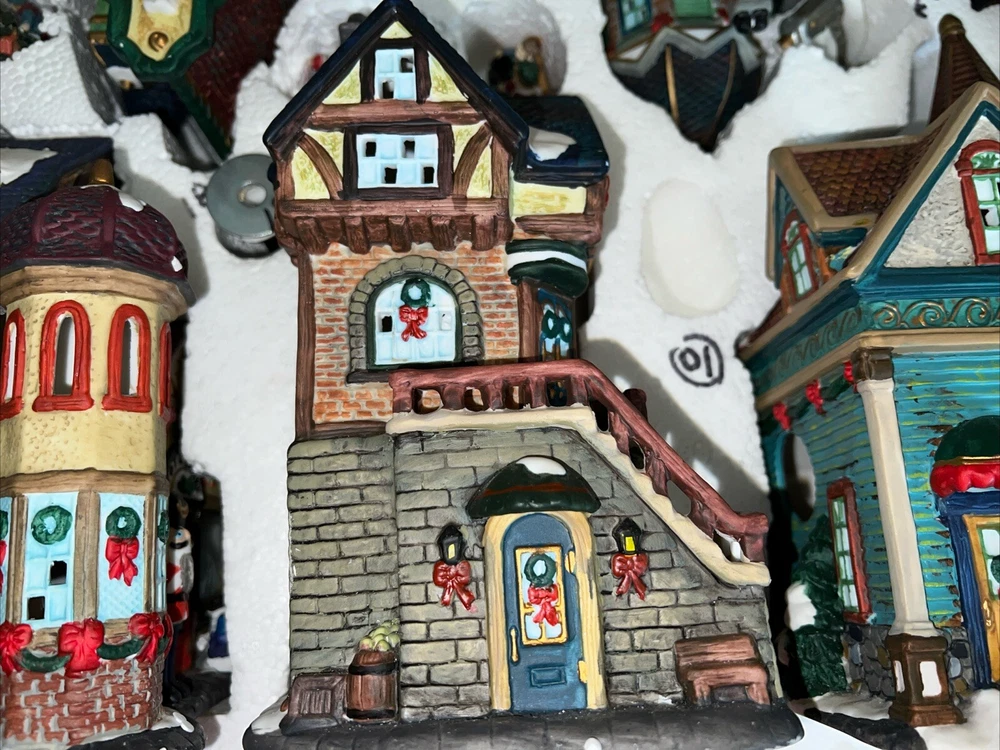 This exquisite 34-piece Victorian Village Set from Grandeur Noel is a must-have for any collector. The set features a variety of buildings and figures, all crafted from high-quality porcelain and painted in vibrant colors. It's perfect for creating a festive Christmas atmosphere in any room, and the set comes complete with a lighted village scene. The set is an original, from the year 2000, and is packaged in a beautiful box for easy storage. It's ideal for adults who appreciate the beauty of Victorian-style Christmas decorations, and would make a great addition to any collection. The set is not handmade, but it's sure to bring joy to anyone who displays it. Missing item #10. Everything else is in the box. Just like new.