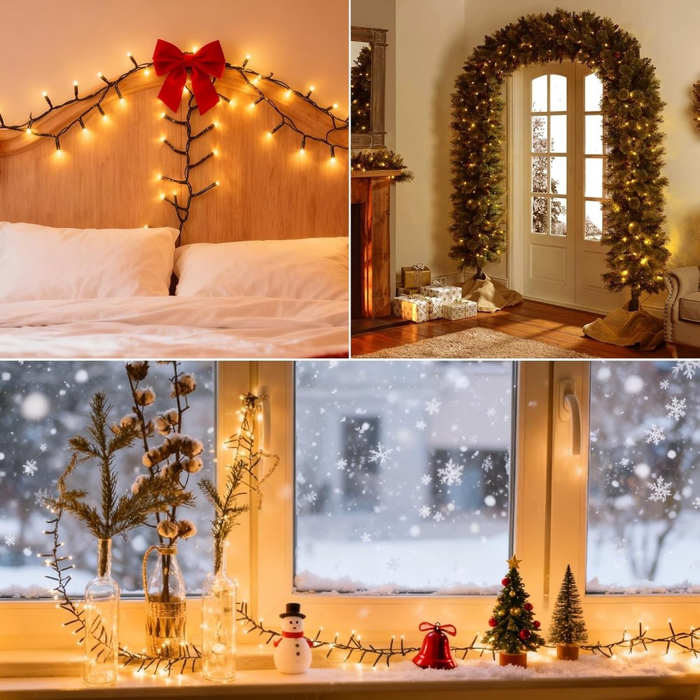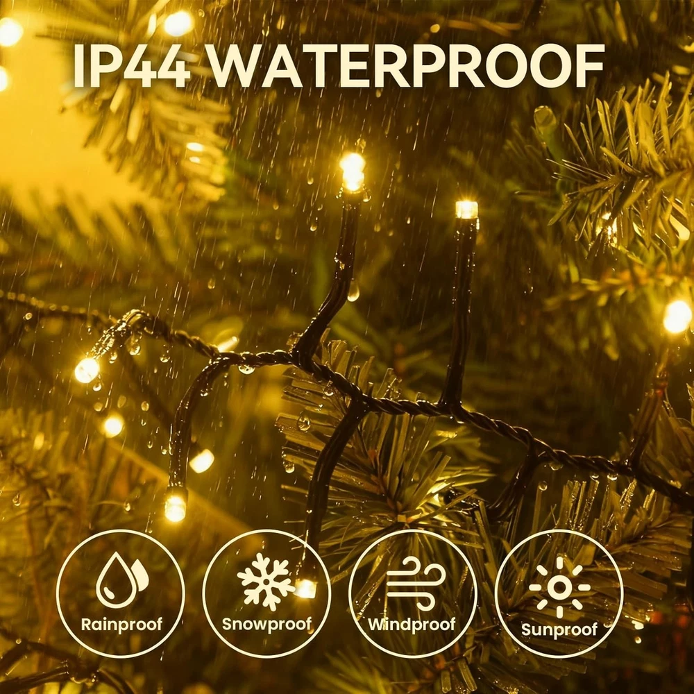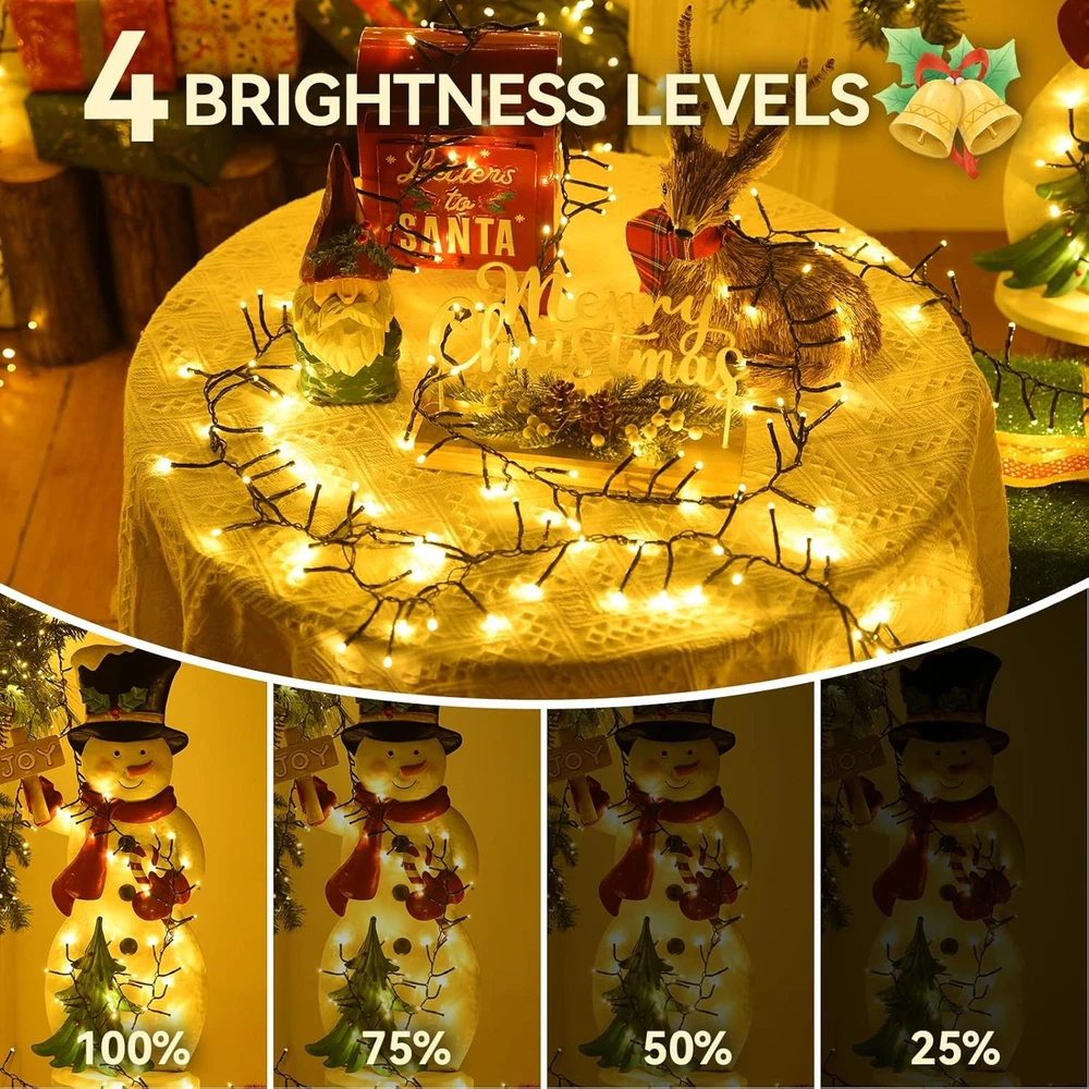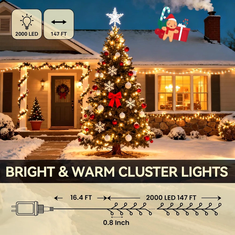CLUSTER LIGHTS CHRISTMAS: Our Cluster Lights Christmas features 2000 bright LED bulbs on a 147-ft string, providing ample lighting. The 147-ft light section is versatile for home decorations, while the 16-ft lead can easily reach spaces like your garden and bedroom. With the remote control, you can effortlessly adjust settings to create a dreamy and romantic home ambiance. FAIRY LIGHTS WITH REMOTE: Our Christmas Tree Lights with Remote offer 8 different lighting modes. The remote control features a memory function that automatically saves your last settings, eliminating the hassle of resetting when used next time. The black wire blends seamlessly with your Christmas tree for a cohesive appearance. Note: For initial remote control use, remove the transparent film from the bottom to activate it. WATERPROOF FAIRY LIGHTS: With an IP44 waterproof rating, our Christmas fairy lights are suitable for both indoor and outdoor use. They add a touch of festive charm to your Christmas decorations and are perfect for a variety of settings, including foyers, bedrooms, windows, living rooms, camping sites, kids' rooms, banisters, balconies, decks, patios, yards, garden fences, art galleries, bistros, bars, restaurants, and events like birthdays, parties, weddings, anniversaries, and proms. FAIRY LIGHTS WITH TIMER: Our Christmas Tree Lights offer timer settings, 4 brightness levels, and a memory function. The included remote control allows you to easily adjust the settings to your preference. The memory function ensures that the Christmas lights remember your previous settings, so you don't have to readjust them each time you turn them on. FAIRY LIGHTS PLUG IN: UL-certified for safe use, our cluster Christmas lights feature a low voltage of 29V and a cool-to-touch design, making them safe around children and pets. The energy-efficient LED bulbs save up to 90% more energy compared to traditional incandescent lights, making them an eco-friendly choice. Product description Cluster Lights Add to Cart Add to Cart Add to Cart Add to Cart Add to Cart Customer Reviews 4.6 out of 5 stars 31 4.6 out of 5 stars 31 4.6 out of 5 stars 31 4.6 out of 5 stars 31 4.6 out of 5 stars 31 Price $42.99 $ 42 . 99 $17.99 $ 17 . 99 $14.99 $ 14 . 99 $49.99 $ 49 . 99 $34.19 $ 34 . 19 LED Quantity 2000 300 500 1200 2000 Total Light Length 147 FT 36 FT 49 FT 95 FT 147 FT LED Color Warm White Warm White Warm White Warm White Warm White Wire Color Black Green Green Green Green Power Supply Plug in Plug in Plug in Plug in Plug in 8 Modes √ √ √ √ √ Control Type Remote Control Remote Control Remote Control Remote Control Remote Control