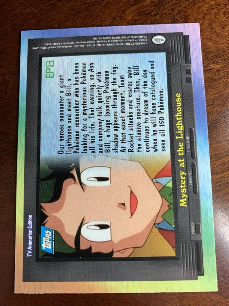 2000 Topps Pokemon TV Animation Series 2 #EP13 Mystery at the Lighthouse Up for sale is a 2000 Topps Pokemon TV Series 2 card. Please review pictures as the card pictured is of the actual card that you will receive. The card will be placed in a penny sleeve and shipped in a cardboard box with delivery tracking. I have 100% positive feedback and have been selling items on ebay for many years. Let me know if you have any questions or need additional pictures and I will be happy to provide them. Yes - I do offer combined shipping. Additional shipping cost for each ungraded (raw) card is FREE and for each PSA graded item is only $0.50. Pokémon Official Trading Cards , informally known as Pokémon Trading Cards series 1 , was a set of Pokémon-themed trading cards manufactured by Topps in 1999. There were 90 cards in total: 76 Pokémon cards, 13 character cards, and a checklist card. Each of these 90 cards also had two foil card versions (silver and rainbow) in their main United States distributions. This set contained no bonus "chase cards". In the United States There were four different printings. These cards all had an oval Nintendo seal. The printings are distinguished by a blue, black, green, or red Topps logo, with card texts being updated between the first (blue) and second (black) printings. Due to an error, all foil cards after the first printing were printed with black logos, but can still be distinguished by the differences in their debossings. § 1st printing: blue logo on all cards, foil cards had a smooth texture with no debossings. § 2nd printing: black logo on all cards, Pokémon foil cards were debossed with rays and starbursts, while TV cards had a sandpaper finish. § 3rd printing: green logo on non-foil cards only, Pokémon foil cards were debossed with flames and teardrops, while TV cards had dots and rectangles. § 4th printing: red logo on non-foil cards only, Pokémon foil cards were debossed with Poké Balls and targets, while TV cards had dents. A fifth printing featuring foil cards with a smooth finish but a black logo (features of both the 1st and 2nd printings) was also produced to an uncertain extent. Pokémon Trading Cards series 2 was a set of Pokémon-themed trading cards manufactured by Topps in 2000. There were 72 cards in total: 41 Pokémon cards, 5 "Heroes & Villains" cards, 25 episode cards, and a checklist card. Each of these 72 cards also had two foil card versions (silver and rainbow). In addition, there were 27 bonus "chase cards" not included on the checklist, including 12 die-cut embossed cards, 10 animation stick-on cards, and 5 clear cards. Pokémon Trading Cards series 3 was a set of Pokémon-themed trading cards manufactured by Topps in 2000. There were 72 cards in total: 34 Pokémon cards, 12 "Heroes & Villains" cards, 19 episode cards, 6 puzzle cards, and a checklist card. Each of these 72 cards also had two foil card versions (silver and rainbow). In addition, there were 27 bonus "chase cards" not included on the checklist, including 12 die-cut embossed evolution cards, 10 pop-up cards, and 5 clear cards.