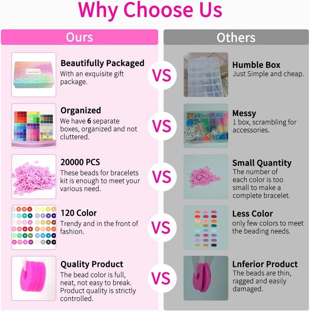 Store New Arrivals Add to Favorite View Feedback Contact Fast deliveries to the customer's home Quality customer service John Make the customers happy! 20,000 Pcs Clay Beads Bracelet Making Kit, 120 Colors 6 Boxes Polymer Beads Spacer Heishi Beads & Jewelry Kit with Pendant Charms Elastic Strings, Crafts Gift for Kids Adults Description EVERYTHING YOU NEED INCLUDE, WELL ORGANIZED IN 6 BOXES - The Clay beads bracelet making kit contains 19,000pcs clay beads in 120 different colors and 1000+ accessories. The rich accessories include letter beads, heart beads, evil eyes beads, smile face beads, square beads, star beads, pendants and charms, lobster clasps, etc. More than ten kinds of accessories to make your design more exciting. (Everything shown on the picture contains) PREMIUM MATERIAL & RAINBOW LIKE COLORS - 120 colors strictly selected popular colors which will meet all your DIY needs. Creativity is more important than skills here for bracelet jewelry making. Heishi beads kits are lightweight, comfortable to wear and made of polymer clay, non-toxic, not easy to fade, waterproof, so you can wear them on everything from the beach, pool or bathroom. ORDERLY ORGANIZATION - 120 different colors in 6 storage boxes. About 150+pcs/color, each color and the accessories are placed in a dedicated box, which is easy to access and will not be messed up, and you can easily find it according to your needs. NOT ONLY A BRACELET MAKING KIT - With this polymer clay beads kit, you can play with your children during the holidays, improve parent-child relationship, keep your children away from electronics, as well as inspire their creativity and imagination, which is a cute gift for your children, family, friends, and yourself. TRENDY ARTS AND CRAFTS GIFTS CHOICE - Exquisite gift box contains everything for a clay beads bracelet making crafts enthusiast. It’s a great gift for girls ages 6-14 teen and preteen girls. Lovely crafts kit for kids or adults as christmas gifts, birthday gifts. Product Description The video showcases the product in use. The video guides you through product setup. The video compares multiple products. The video shows the product being unpacked. 1 DIY EARINGS 2 DIY BRACELETS 3 DIY NECKLACES 4 DIY CRAFTS Top 3 reasons to choose us! Exquisite Packaging Perfect gift that’s stunning at your first glance Create Beautiful Bracelets with Ease Our step-by-step instructions are easy to follow and make for a lovely and joyful day for you and your child. Unleash Your Creativity The latest trendy elements are incorporated into our kit, setting it apart from the outdated styles you might find on the market. More Bracelet Making Kit in Paodey Add to Cart Add to Cart Add to Cart Add to Cart Add to Cart Customer Reviews 4.7 out of 5 stars 1,988 4.7 out of 5 stars 241 4.8 out of 5 stars 110 4.6 out of 5 stars 367 4.6 out of 5 stars 158 4.6 out of 5 stars 322 Price $22.99 $ 22 . 99 $17.99 $ 17 . 99 — $12.99 $ 12 . 99 $18.99 $ 18 . 99 $25.99 $ 25 . 99 Material Polymer Clay Acrylic Plastic Glass Glass Glass Glass Size 6mm 9mm 8mm 6mm 4mm (6/0) 3mm (8/0) Rich Accessories ✔ ✔ ✔ ✔ ✔ ✔ Giftable ✔ ✔ ✔ ✔ ✔ ✔ Usage bracelets, necklaces, earrings bracelets, craft with pipetube bracelets, necklaces, jewelry bracelets, necklaces, jewelry bracelets, intricate beadwork bracelets, intricate beadwork Item model number Beads Item dimensions L x W x H 0.24 x 0.24 x 0.08 inches Age Range (Description) Kid,Adult Color Classic 120 Colors Included Components Beads Material polymer clay Country of Origin China Style Box Item Weight 2.88 pounds Theme Jewelry Size Small Model Name PD-2W Seasons All Seasons Art Craft Kit Type Clay Bead Jewelry Making Kit Special Feature 120 colors Product Dimensions 0.24 x 0.24 x 0.08 inches Number of Pieces 20000 ABOUT US We offer the best prices around on high quality products. Our E-store includes media such as books, movies, music and games while offering electronics, toys, sporting apparel, clothing, tools, general home, garden items and more. SHIPPING We are always working hard to ensure your package arrives as soon as possible. Please understand that some factors like weather, high postal traffic, and the performance of shipping companies are outside of our control. We offer free shipping to the lower 48 states and ship within 2 business days of payment, usually sooner. We do not accept P.O. Boxes. Please provide a physical address. For shipping outside of the continental USA, we only use eBay's Global Shipping Program. The item is shipped to KY and then sent to the rest of the world. International customers are responsible for all duties and taxes. Continue to 'check out' to calculate costs for shipping the item to your country. Messages regarding eBay's Global Shipping Program MUST be directed at eBay EXCLUSIVELY. RETURNS We offer a 30-Day Return Policy on items in which you are not completely satisfied with. You have the option of a full-refund or an exchange of the item. No returns are available on items shipped outside of the USA PAYMENT We accept PayPal. CONTACT US This page content is yet to come Please ad us to your favorite seller and visit again later Thank You CUSTOMER SATISFACTION We try our very best to make sure every customer is completely satisfied. If there's a problem, message us! We're happy to help. WE ACCEPT