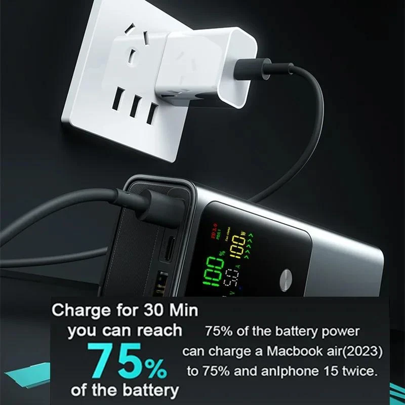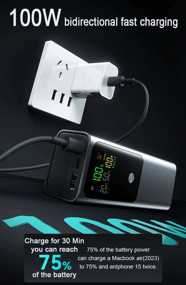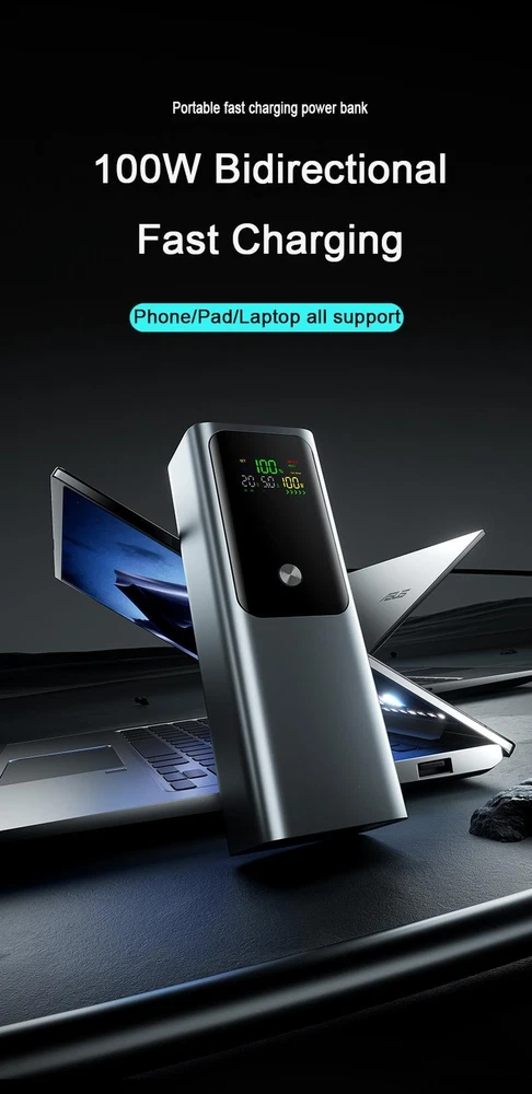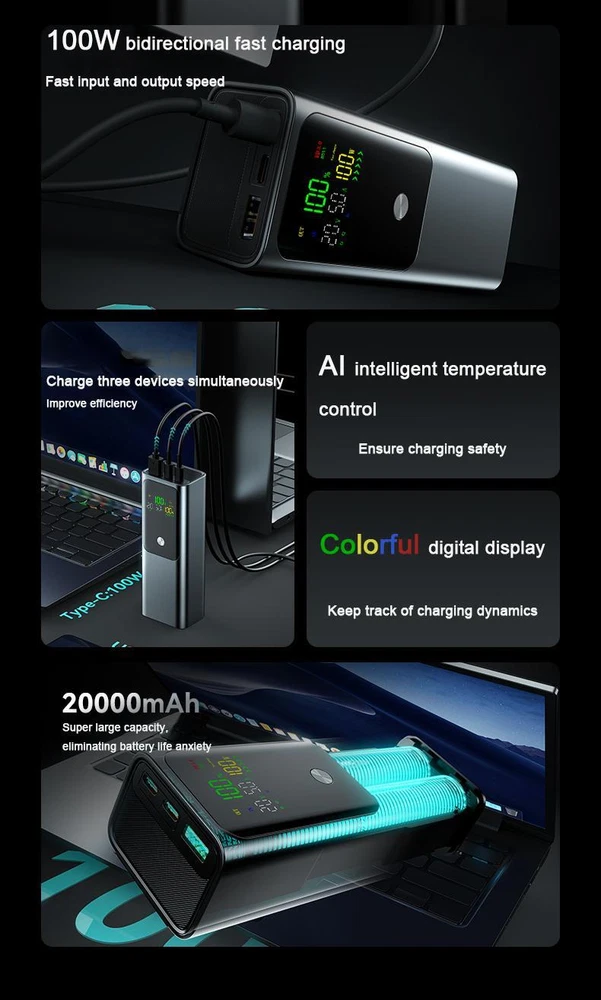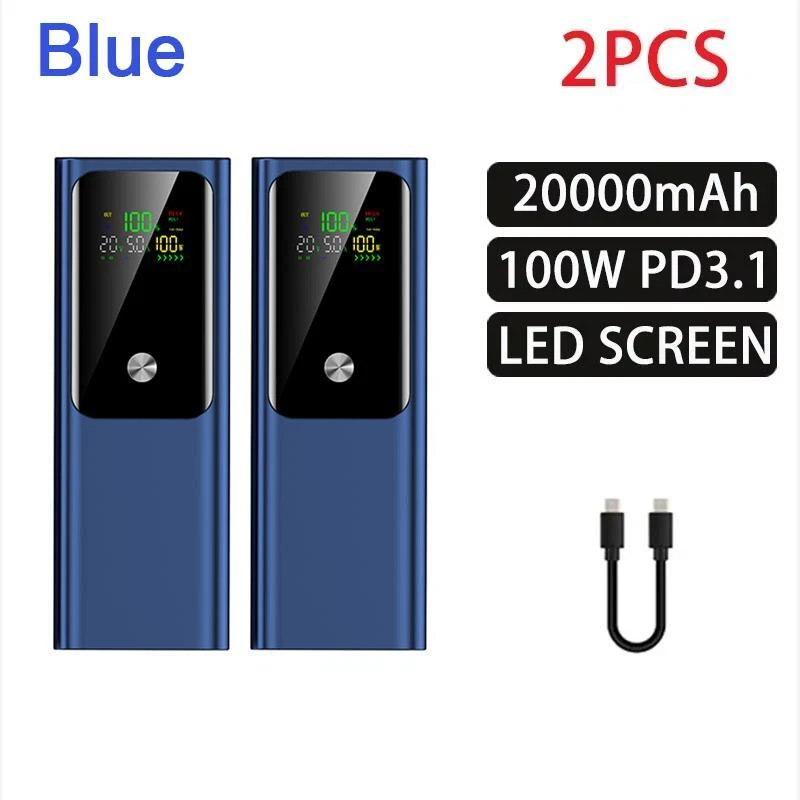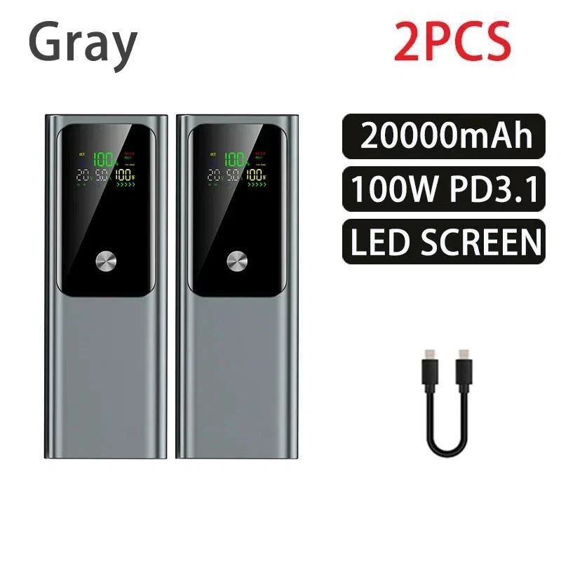 Ranwomen Powerbank 20000mAh 100W PD3.1 2PCS Battery Portable Bidirectional Fast Charging For Laptop Tablet Phone Apple Samsung Color:Gray,Blue Fast charging protocol:PD QC FCP SCP AFC UFCS and other Battery capacity:20000mAh(21700 specification lithium battery*4) The power level of the power bank is closely related to the temperature, the cable used, and the device being charged. Maximum output power:100W(PD3.1) Supported devices: mainstream laptops (USB-C charging), smartphones, tablets, mainstream electronic devices Screen material:LED Size:153*55*34mm Output: Type-C1: 5V/3A 9V.3A 15V/3A 20V/3A Type-C2: 5V/3A 9V/3A 15V/3A 20V/5A USB port: 5V/3A 9V12A 12V/1.5A 10V/2.25A Input: Type C1/2: 5V/3A 9V/3A 15V/3A 20V/3A Weight: 421 grams/ (power bank only) Highlight: *100W Total output,equipped with Dual USB-C and one USD-A port,quickly charge a laptop at 100W for maximun effciency *Smart LED display,track power levels and charging status at a glance. *Lightweight body, easy to carry. Package Include 1*20000mAh Powerbank 1*Fast charging cable 1*Manual 100w PD 3.1 Super fast charging LED display, intelligent temperature control 100W Bidirectional charging, fast charging 100W PD3.1 Fast charging,Intelligent power adjustment, suitable for most devices 20,000 mAh large battery with high battery density to ensure continuous output 421(laboratory data, not representative of final weight), small and lightweight, easy to carry LED screen intelligent display, charging data is clear at a glance Product specific data