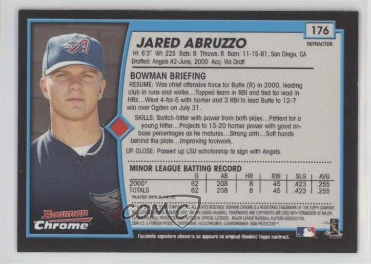 2001 Bowman Chrome - [Base] #176 Rookie Refractors - Jared Abruzzo - Rookie - Baseball Card - Featuring the Los Angeles Angels - Featuring Jared Abruzzo Search for more: 2001 Bowman Chrome Search for more: 2001 Bowman Chrome - [Base] View all of our Listings Auctions Buy It Now About Us Located in the beautiful Pacific Northwest, COMC (Check Out My Cards) is the world's largest consignment service for trading card singles. More than 10,000 people have used our consignment service to list over 50 million trading cards. Find out how we can help you consign your items on eBay by contacting us through eBay messaging. COMC -- "The Safe & Easy Way to Buy & Sell" Representative Image - Select Specific Item above to see image of actual item Representative Image - Select Specific Item above to see image of actual item Raw Condition for Modern Cards Unless otherwise noted, raw modern cards are listed in Near Mint-Mint condition or better. A NM-MT card appears to be Mint at first glance, but upon closer inspection, may exhibit some of the following: minor print defects (e.g. roller marks, print line, dimple), minor scratches, slight edge wear, and slight corner wear. Centering is clearly visible in the images provided and does not factor into our condition assessment. Raw Condition for Vintage Cards Unless otherwise noted, raw vintage cards are listed in Excellent condition or better. An EX card may exhibit some of the following: minor rounding of corners, surface wear, print defects, light scratches, and slight edge wear/chipping. Centering is clearly visible in the images provided and does not factor into our condition assessment. Domestic Shipping Combined shipping for multiple items is available. To receive combined shipping, please ensure all desired items are in your eBay shopping cart before proceeding to checkout. eBay limits orders to 40 items per order. We automatically combine multiple orders placed on the same day. If you place multiple orders on the same day, please contact us to request a refund of applicable shipping costs. Signature confirmation may be required on invoices over $400. All cards are protected and shipped securely. International Shipping COMC offers eBay's International Shipping (EIS) for international orders under $2,500* (see country exceptions below). All duties and import fees are paid at checkout; in the rare event that there are additional import fees upon delivery, these are borne by the buyer. EIS packages route through a shipping hub in Erlanger, KY before shipping to their final destination. Please note that EIS does not allow for combined shipments. The shipping rates are determined by eBay and cannot be adjusted. *Maximum sale price exceptions: Colombia, Kuwait ($2,000); Taiwan ($1,539); Chile, Costa Rica, Guatemala, Honduras, Trinidad and Tobago ($1,000); Antigua and Barbuda, Aruba, Belize, Dominica, Grenada, Philippines, Saint Kitts and Nevis, Saint Lucia, Montserrat, Turks and Caicos Islands ($500); Dominican Republic, El Salvador ($200). Please request a shipping quote through eBay messaging for orders that exceed the maximum sale price supported by eBay's International Shipping. You will be responsible for all duties and import fees for international orders shipped outside the EIS. All cards are protected and shipped securely. Payment COMC does not accept offers on our cards through our eBay storefront. COMC utilizes eBay’s managed payments system. If you are experiencing difficulties making a payment, please contact eBay for assistance. Return Policy Returns are only accepted on the rare occasion the item is not as described. If you are making a return, please initiate the return process through eBay so a mailing label can be provided for you. Prior to listing, our expert team carefully assessed this item to represent it accurately. Please review the description and high-definition images prior to purchasing to ensure this item meets your satisfaction. We welcome you to contact us if you have further questions about this item. Trust and Integrity COMC carefully assesses each item consigned to us to prevent fraudulent items from entering the marketplace. If you believe an item offered on COMC may be fraudulent, please contact us with details so we can investigate the issue. Items we determine are outside our supported items policy may be removed. Last Modified: 2/20/2025 10:44:29 PM PDT