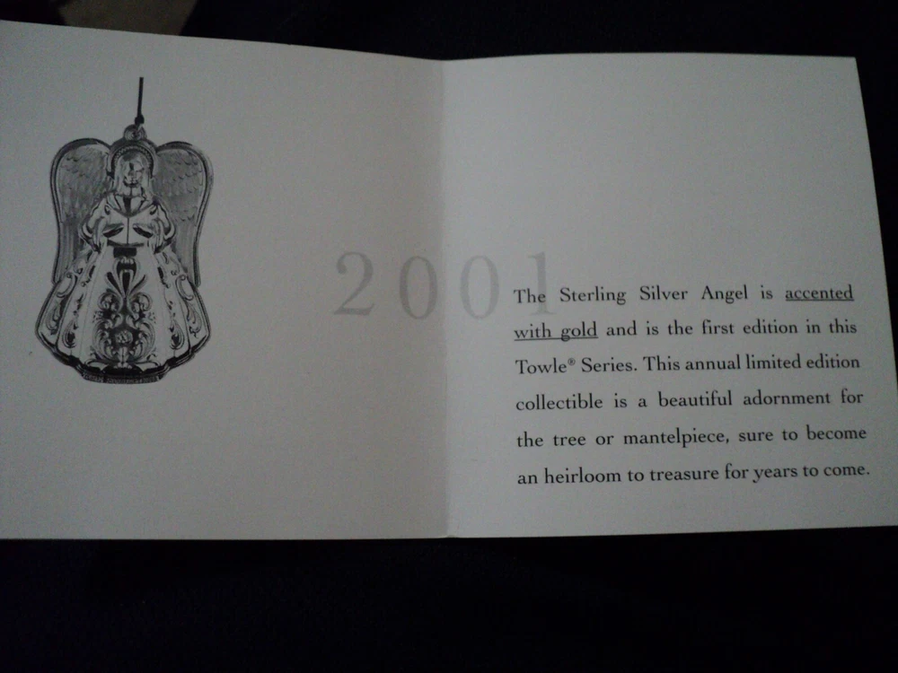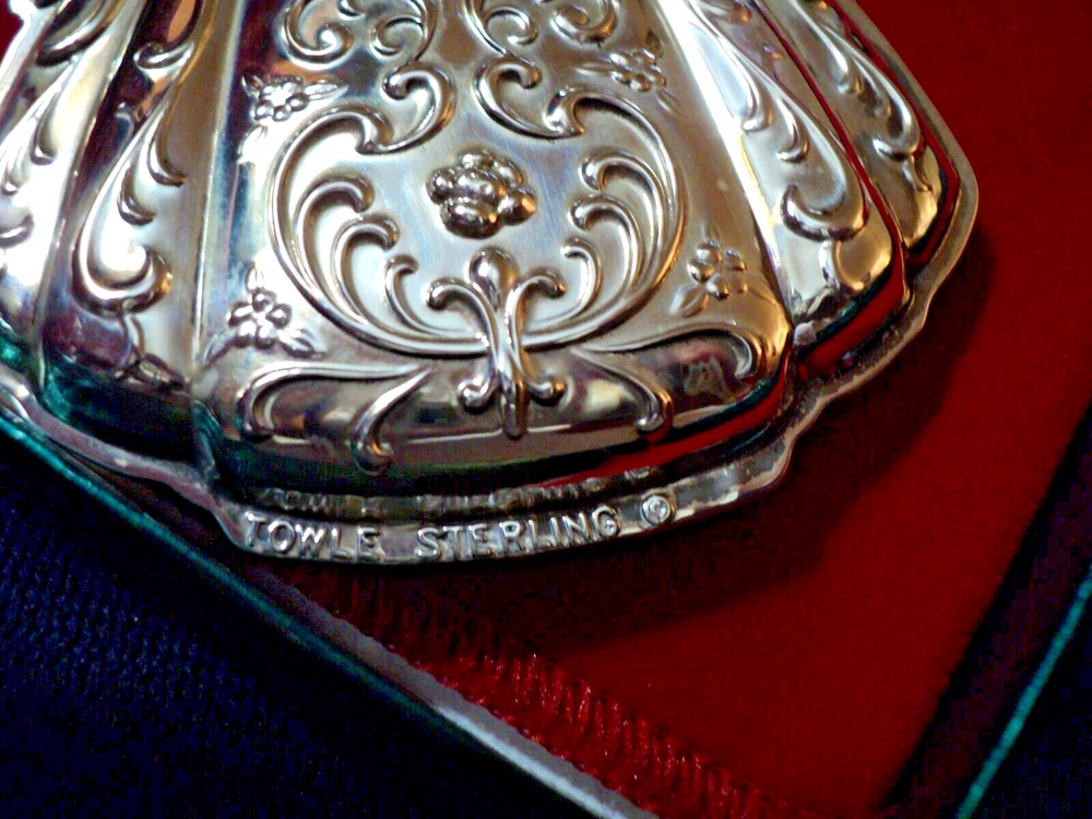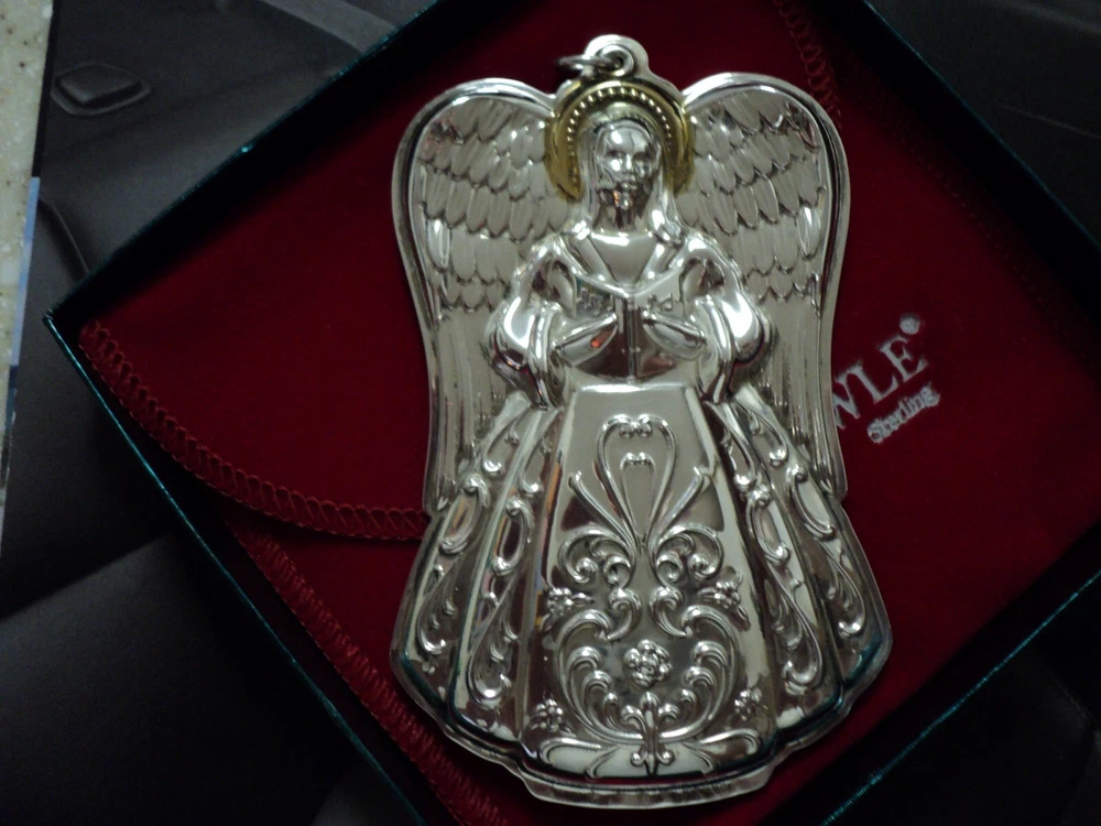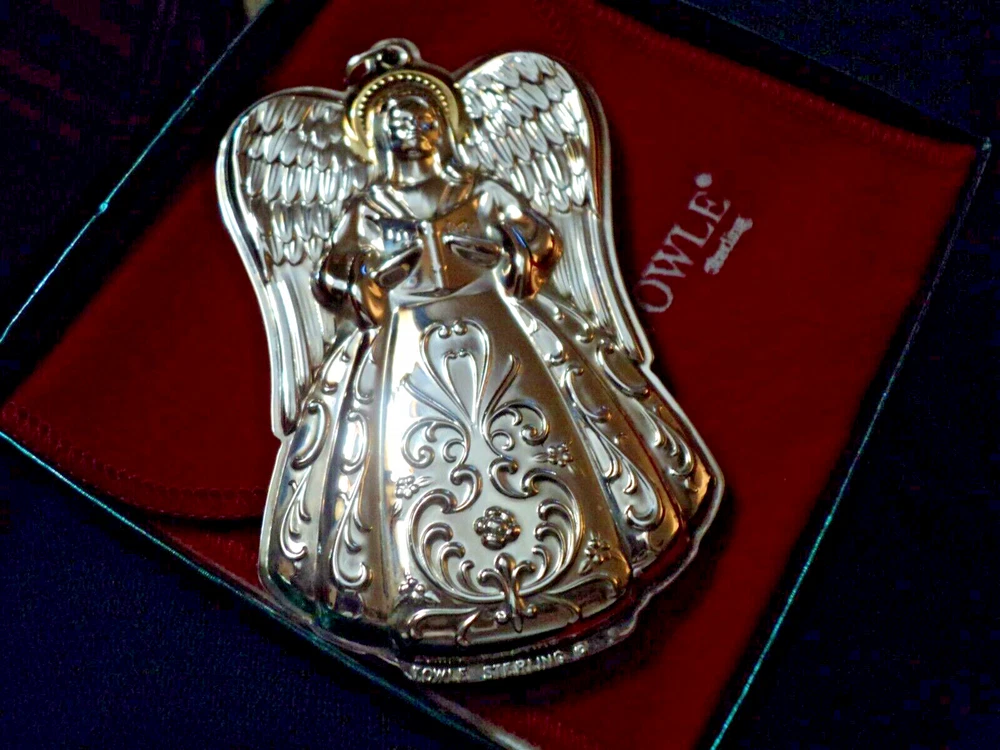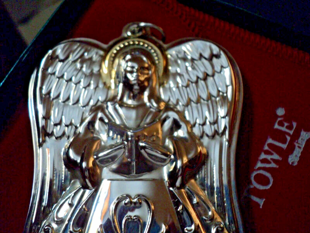 This beautiful Christmas ornament from Towle is a must-have for any collector. Crafted in 2001, this sterling silver angel features a stunning gold accent (Angel's Halo} that adds a touch of elegance to your holiday decor. The angel's shape is perfect for any Christmas tree and is sure to catch the eye of anyone who sees it. Made with high-quality materials, this angel ornament is a great addition to your home decor. Its theme of angels and occasion of Christmas make it a perfect gift for anyone on your holiday list. Add this gorgeous piece to your collection today and enjoy its beauty for years to come....approx. 3 5/8" High...2 3/8" at Widest point...Original box, red cloth pouch, info card, red ribbon...