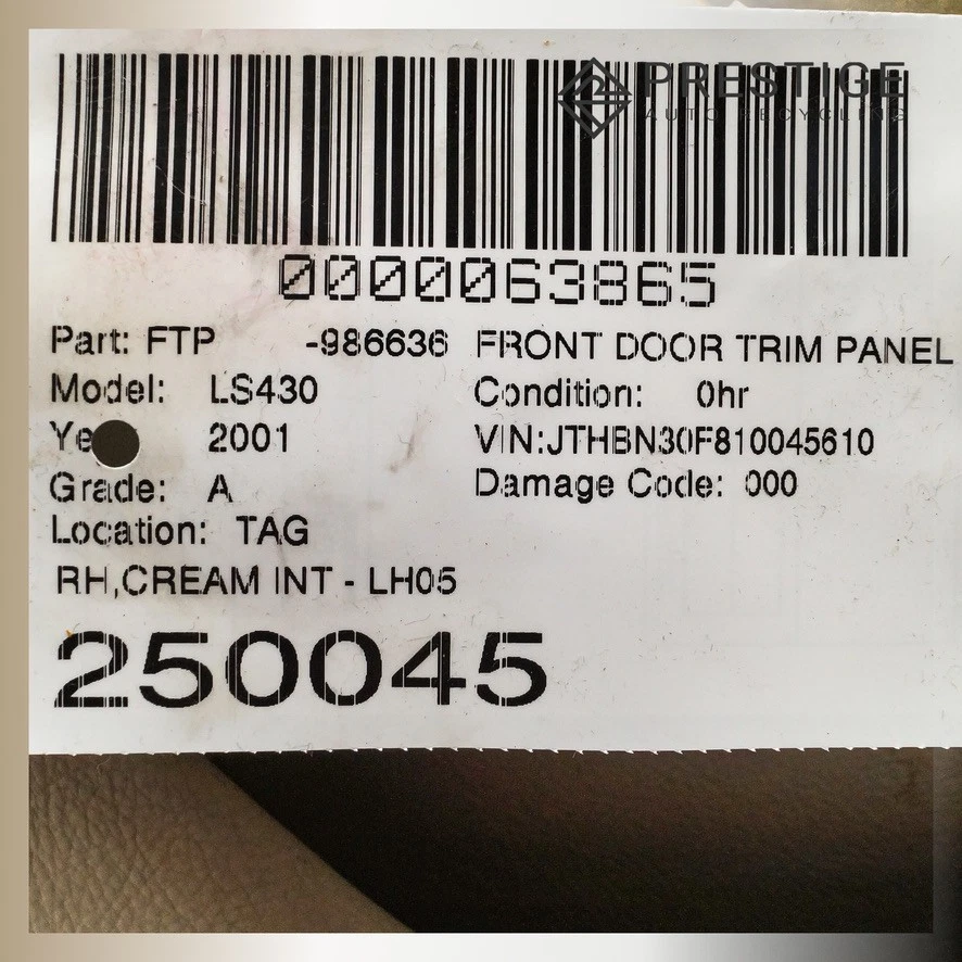 Prestige Auto Parts - Product Page Local pick-up available at 3400 Sunrise Blvd, Rancho Cordova, CA 95742 2001-2003 LEXUS LS430 Door Trim Panel Interior Front Right Ecru 67610-50410-A2 Not sure if the part fits? Send us your VIN, and we'll verify compatibility for you! Item Condition The item is in good condition, fully operational, and demonstrates normal signs of use. Please note that, as a used part, it may show light scuffs, scratches, or other minor imperfections, as shown in the photos provided. WHEN YOU BUY FROM US YOU AGREE TO OUR TERMS AND CONDITIONS: It is the buyer's responsibility to carefully inspect all of the photos for details and/or request more photos if necessary, what you see in photos is exactly what you will receive. Before purchase, the buyer MUST verify that the item will fit their vehicle. PLEASE NOTE: Make sure to verify fitment independently with your local dealer, information in the “compatibility” section is generated by eBay Motors, not from us. IF YOU HAVE ANY QUESTIONS, CONTACT US VIA EBAY MESSAGING BEFORE PURCHASING. Payment We accept PayPal, VISA, MasterCard, Discover, and American Express. Sales tax collected by eBay where applicable. For local orders, pay on pickup available. Shipping Most items ship within 24 hours of payment; items paid for on the weekend or holidays ship on the following business day. We ship by FedEx, UPS, USPS, and regional freight/LTL carriers, whichever option is most affordable and/or faster. Shipping prices for ground apply only to the continental United States. Anywhere else is considered international shipping and will have an international shipping rate. Any international customs fees are the responsibility of the buyer. Any free shipping we offer is for the continental United States only. If you are from Hawaii, Alaska, or a Territory of the United States, please request a shipping total before bidding and we will do our best to keep the cost low. For orders placed outside of the United States, we ship ONLY through the eBay Global Shipping Program. If you are outside of the US, use the eBay international shipping tool above to receive a price for shipping costs. Local pickup and delivery options also available, please contact us for arrangements. PLEASE NOTE: Oversized items like engines, transmissions, bumpers, doors, hoods, trunk lids, fenders and other similar items will be shipped via Freight Shipping and MUST be shipped to a business address with a dock or forklift access; otherwise, liftgate and/or residential delivery fees may apply. YOU MUST CONTACT US FIRST FOR A QUOTE BEFORE PURCHASING SAID ITEMS. Warranty and Returns All returns must be made within 30 days of item being received by the customer only if the item is non-functional or if it differs substantially from the description. Buyer is fully responsible for shipping cost of the return. We are not liable to pay for any labor fees associated with the installation or removal of any parts sold by us. All electronics are tested before removed from vehicle. IF NOT FUNCTIONAL, WE WILL NOT SELL. If the item is defected we will state accordingly and is sold for parts only. If you have any questions about the part you’re bidding on, PLEASE ASK QUESTIONS PRIOR TO BIDDING. 90 DAY WARRANTIES are available. Contact Us If you have questions about any part, please contact us BEFORE purchasing via eBay messaging. HOW DID WE DO? We are a small, family owned business dependent on our valuable customers. Once you have received your item in satisfactory condition, would you be so kind as to leave us feedback? If there is a concern that would cause you to want to leave negative feedback, please contact us first and we will do our best to resolve the issue. Thank you and God bless! © 2025 Prestige Auto Recycling. All rights reserved.