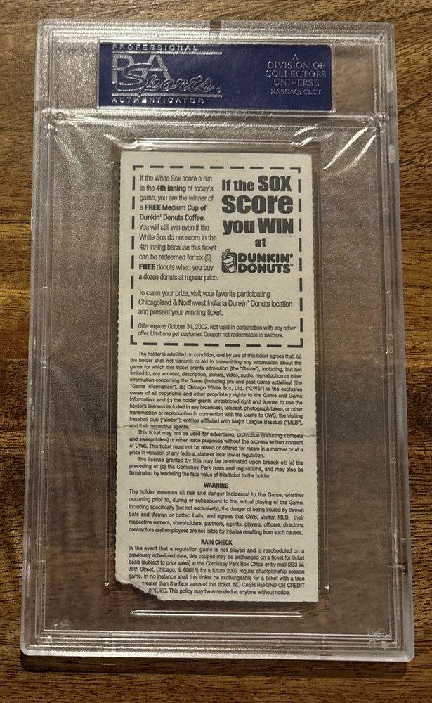 This PSA ticket stub is a rare piece of baseball history. It features the matchup between the Chicago White Sox and the Oakland Athletics on May 5, 2002, with David Justice hitting a home run. The ticket is authentic and vintage, making it a must-have for any sports memorabilia collector. The grade of this ticket is perfect, and it is an original, not a reproduction. This item is a great addition to any collection, especially for fans of the Chicago White Sox and the Oakland Athletics. Don't miss out on the chance to own a piece of baseball history.