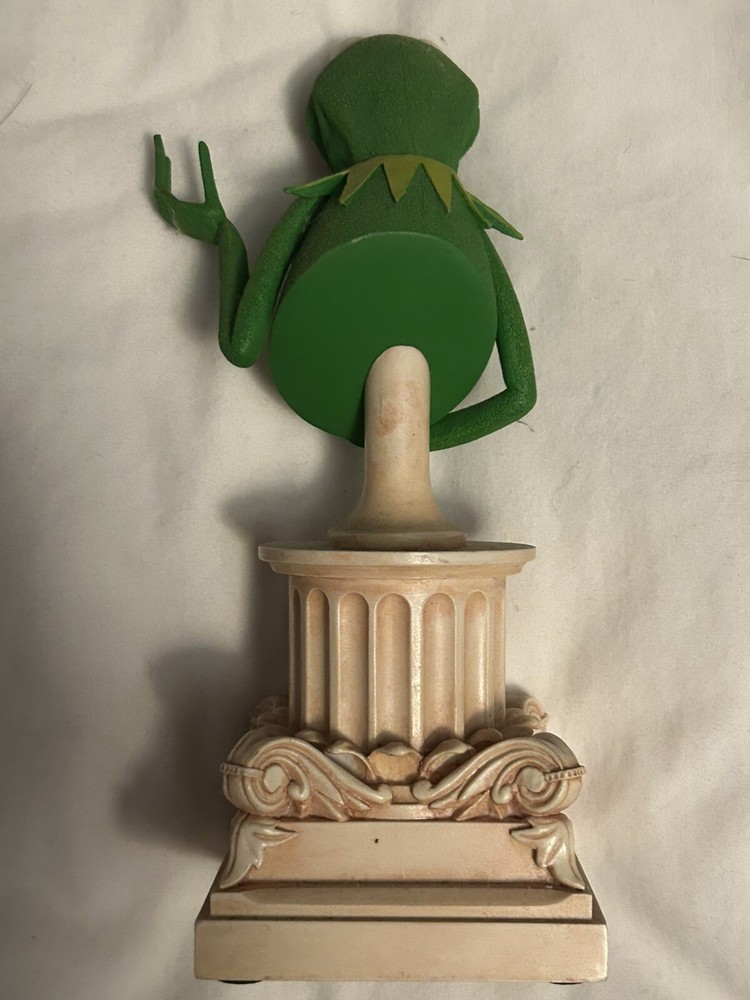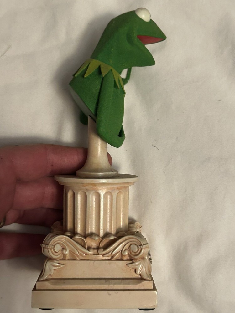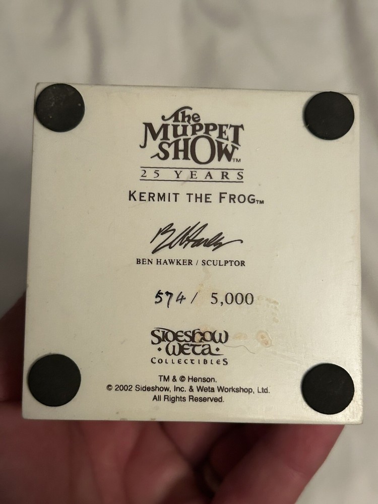 The product is a 2002 Sideshow Kermit the Frog statue that is signed and numbered by the manufacturer. This collectible figurine features the beloved character Kermit the Frog, known for his iconic appearance and charm in the world of comics and memorabilia. The statue is a must-have for fans and collectors of Kermit the Frog memorabilia, adding a unique and special touch with its limited edition status and missing fingers detail. The statue is missing the 2 middle fingers on the left hand and is numbered 574/5000 and signed by the sculpture Ben Hawker. Great addition to any collection!!
