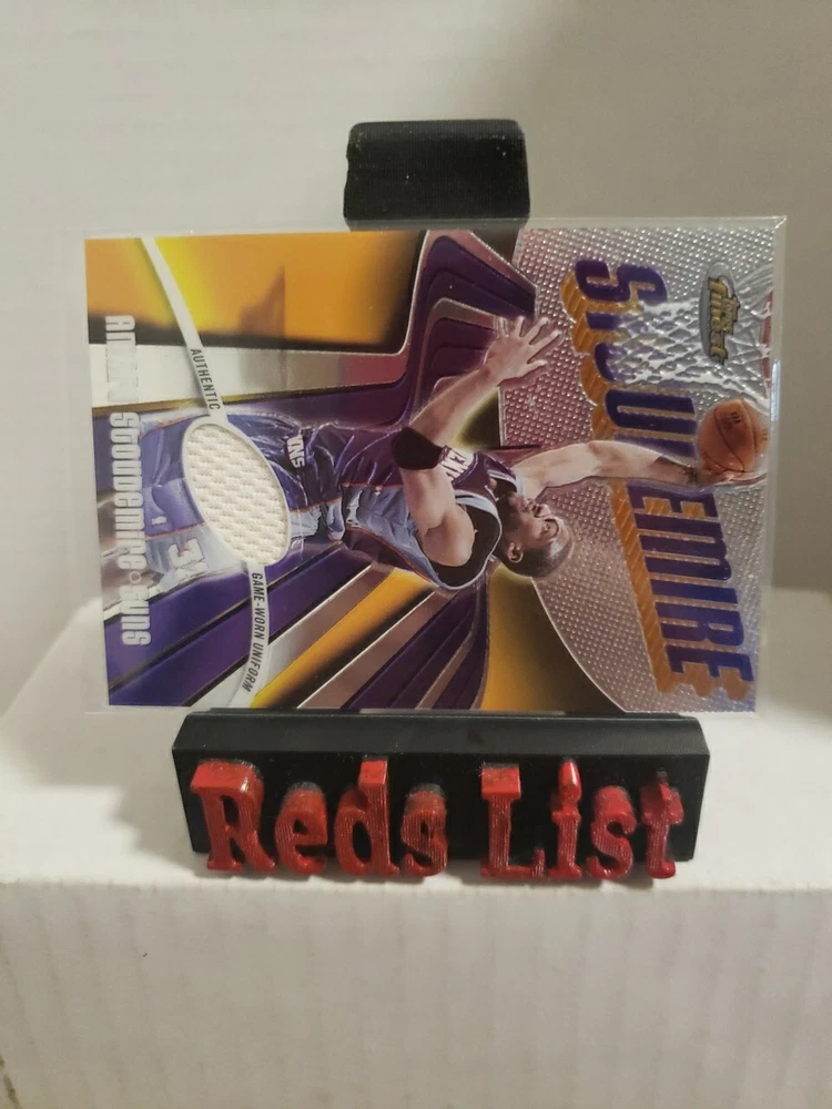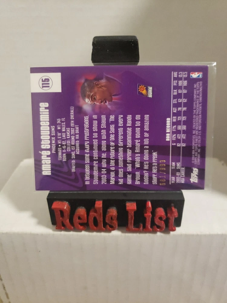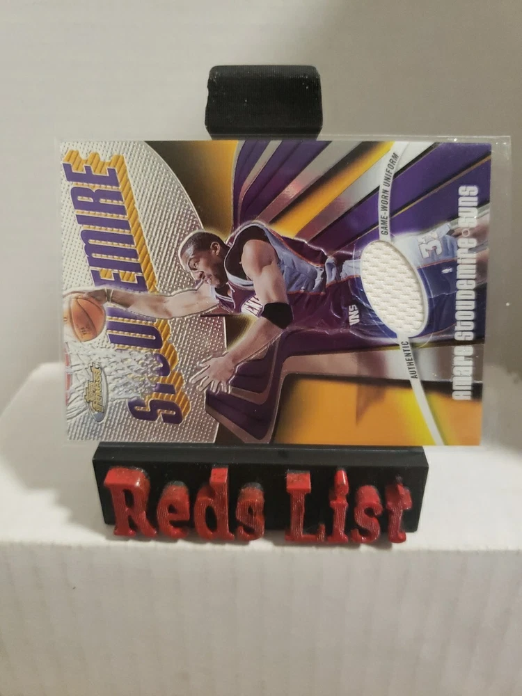 Player/Athlete: Amare Stoudemire Card Name: Game-Worn Uniform - Amar'e Stoudemire Card Attributes: Memorabilia, SerialNumbered Parallel/Variety: [None] Card Thickness: 75 Pt. Original/Reprint: Original Franchise: N/A Athlete: Amare Stoudemire Manufacturer: Topps Card Size: Standard Set: 2003-04 Topps Finest - [Base] League: National Basketball Association (NBA) Language: English Vintage: No Features: Base Set, Serial Numbered, Memorabilia, Short Print Card Number: 115 Team: Phoenix Suns Sport: Basketball Product: Single Year Manufactured: 2003 Season: 2003-04 Type: Sports Trading Card Card Manufacturer: Topps Year: 2003-04 Print Run: /999 Player: Amare Stoudemire