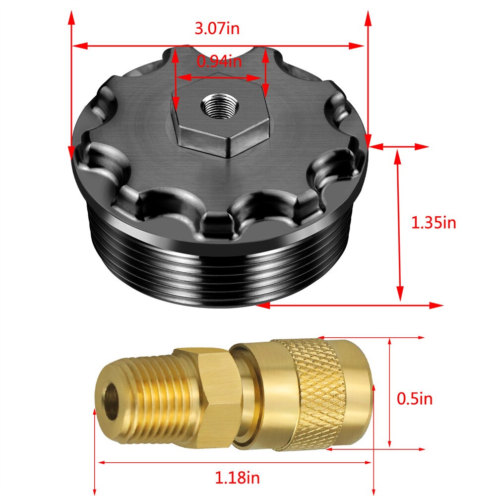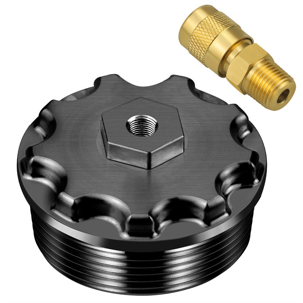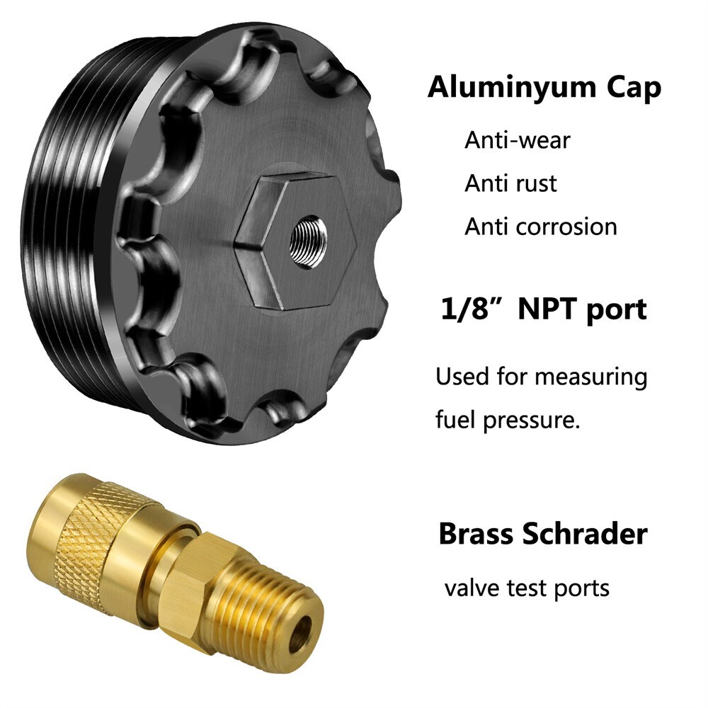 Aluminum Fuel Filter Cap with Pressure Test Port for 2003-2007 Ford Power Stroke 6.0L Product Description This is a billet aluminum fuel filter cap. This is a great replacement for the original plastic cap and includes a test port which allows for a fuel pressure tester to be attached in order to properly check the fuel pressure on the Ford Power Stroke 6.0L engine. The test port supplied is a diesel fuel rated Schrader valve. Because the diesel fuel cools and lubricates the injectors on the 6.0L engine, operating the vehicle within recommended fuel pressure specifications (approximately 65psi or greater) is critical. Fuel pressure is one of the first things that should be checked when driveability issues occur. The oil pressure on the Powerstroke 6.0L is also very Important because the lube pump pressure supplies the high pressure oil pump with oil. Without proper pressure in the system, many other components will begin to fail. Works with these applications: Fit for Ford F-Series, E-Series Powerstroke Diesel 6.0L 2003-2007 Package Included: 1 x Billet aluminum fuel filter cap 1 x Fuel rated Schrader valve On Jan 21, 2026 at 19:00:56 PST, seller added the following information: