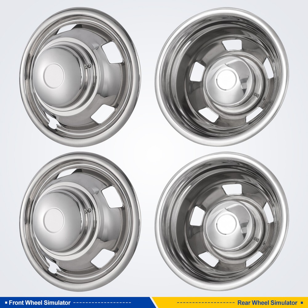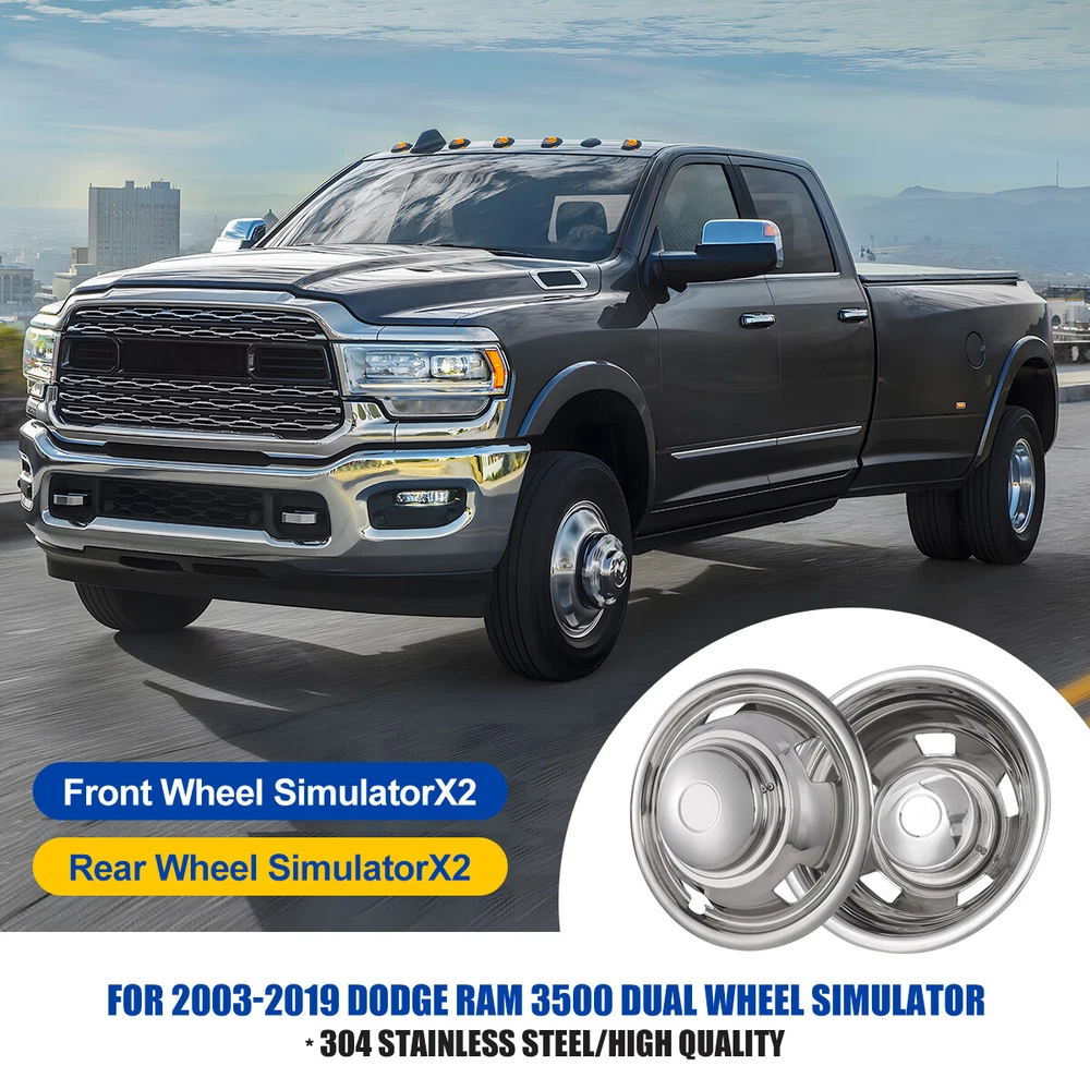 Title Other Head Lights For Jeep For Ford For Dodge For Chevy/GMC For Honda For Toyota For Nissan For Subaru For Mazda For Acura For Mitsubishi For Audi For MINI Tail Lights For Jeep For Dodge For Chevy/GMC For Toyota For Nissan For Honda For Volkswagen For Mazda For Subaru For Isuzu For Mitsubishi For Cadillac For MINI Fog Lights For Jeep For Ford For Honda For Dodge For Toyota For Chevy/GMC For Nissan For Mazda For Subaru For Infiniti For Cadillac For Scion For Lincoln For Acura For BMW For Hyundai For Volkswagen For Buick For Chrysler For Lexus For Mercedes Benz For Kia For Audi For MINI Turn Signal Lights For Jeep For Ford For Dodge For Chevy/GMC For Toyota For BMW For Subaru For Nissan For Cadillac For Lincoln fit 2003-2018 Dodge Ram 3500 17" Dually Wheel Simulators Dual Skins Liners Cover Please make sure your vehicle meets the following two requirements before purchasing: 1.These simulators can only fit 2003-2019 Dodge Ram 3500 dually model which has dual rear wheels. 2.These simulators can only fit 17" wheels with 8 lug. These are 8 lug 5 hand hole design. Fitment For 2003-2018 Dodge Ram 3500. Feature Made of high quality 304 Stainless Steel and Polished keep away from stains, fading, dirty. Give any vehicle a unique, aggressive look at a fraction cost. The product undergoes rigorous mechanical testing before leaving the factory to ensure the best performance and enhanced durability. Easy to install ,Lifting the vehicle is not necessary for installation. Easy care and maintenance ,You will just be able to wash off with soap and water and they will keep their shine for years! Specification Type: Hub caps. Color: Silver. Material: Stainless. Compatible Wheel Diameter: 16 in. Installation Type: Bolt on truck. Design: 8 Lugs 5 Hand Holes Dually Wheel Simulators. Packages Dimension: 19.09*19.29*12.4 Inch. Packages Weight: 16.53 lbs. Front wheel length: 18.5 inch. Front wheel height: 2.76 inch. Front wheel cover: weight is about :1.774 lbs. Front center cover: weight is about: 0.612 lbs. Rear wheel length: 18.5 inch. Rear wheel height: 8.66 inch. Rear wheel cover: weight is about 2.778 lbs. Rear center cover: weight is about 0.934 lbs. Packages Included 2 X Front Wheel Simulator Liner Covers , 2 X Rear Wheel Simulator Liner Covers Installation Tool Kit Payment Delivery details Terms of sales About us Contact us Payment π€ We accept PayPal (Recommended), credit card, VISA, Google Pay & Discover etc. π€ Please submit your payment within 7 days after your purchase. π€ If not, eBay will automatically open an Unpaid Item Dispute on our behalf if the item(s) are not paid within 7 days. Delivery details π€ Please double check your delivery address and contact information. π€ All items will be shipped within 1 business days after payment received. π€ Tracking numbers will be easily accessible ASAP they are created and processed. Terms of sales π€ Free 60 days Return, we will cover the return post fee. π€ If a defective product was received, please do not hesitate to message us via eBay message. π€ We will response in 24 hours in business to resolve the problem π€ We stand behind our products. Items can be returned for exchange or full refund within 60 days from the date you receive. About us π€ Winjet has a huge warehouse and office located in the United States. π€ All US domestic 48 states customers are able to benefit from the FREE SHIPPING services. π€ Our experienced, professional customer service representatives offers prompt and courteous service. π€ Best quality products, outstanding services and professional experience keep our customers. Contact us π€ Please feel free to contact us if you have any problems. π€ Emails will be replied within 24 hours in working days. π€ After hours emails will be replied on the next business day. OE/OEM Part Number 2003-2018 dodge ram 3500 Interchange Part Number 2003-2018 dodge ram 3500, 17 inch Type Dually Wheel Simulators Features Easy to Install, Flexible Manufacturer Part Number 0074 Universal Fitment No Placement on Vehicle Left, Right, Front, Rear Brand Winjet Manufacturer Warranty 1 Year Material Stainless Steel Finish Stainless Fitment for 2003-2019 Dodge Ram 3500 Item Condition New Shipping Notes Seller pays. Free return shipping within 48 states Package Included 4 wheel covers as pics show Size 17β 8 lug 5 hand hole Color Chrome Number in Pack 4 Note- International buyers need to pay for shipping and customs clearan Installation Instructions NO Feature2 be sure to check your tire/wheel size Feature1 providing a tight and very secure fit