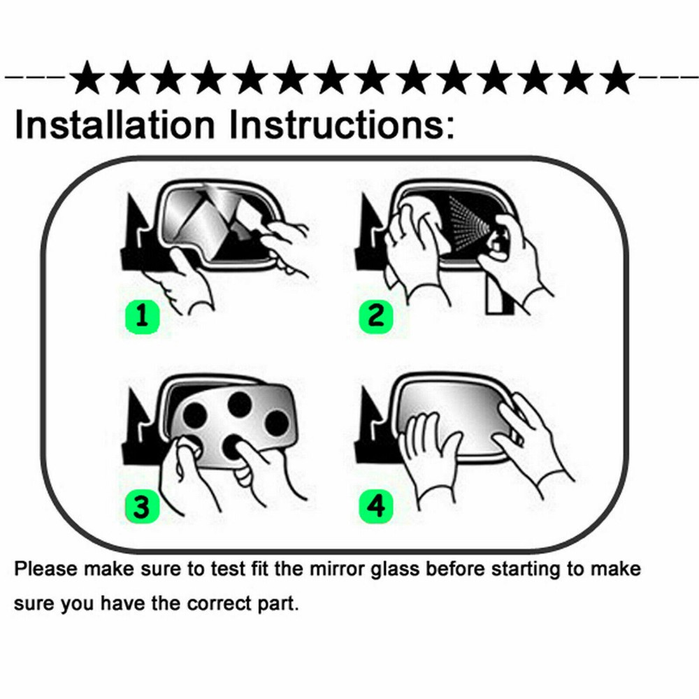 Product Description Detailed description of the product Product Description: Flat Glass Driver Left Side 7" Diagonal Size Includes 4 Pcs Sticky Pads Suitable For Electric G lass Adjustment Non Heated and Not Including Back Plate Fits: 1997 1998 1999 2000 2001 2002 2003 2004 Chevrolet Corvette Note : This mirror is real glass - not a plastic mirror. Our glass mirror don't have a backing plate, so they don't have heating function. Vehicles of the same year/model/manufacturer may have different towing mirror glass. Check the size before placing an order. If you encounter any problems, please contact us and we will provide you with solutions. Thank you! Installation Steps: Please make sure to test fit the mirror glass before starting to make sure you have the correct part. 1. Remove all existing mirror glass from the mirror assembly plastic backing plate. 2. Clean the backing plate with rubbing alcohol and clean the back of the new mirror glass with glass cleaner. 3. Apply adhesive pads or clear silicone to the back of the new mirror glass or the plastic backing plate. 4. Align and firmly press the replacement mirror glass to the backing plate. 5. Clean the new mirror glass with glass cleaner and you are ready to go! Payment Shipping Returns Contact Us PayPal is our preferred method of payment for all of our eBay sales. For customer service please contact us via eBay MessagesImmediate payment via PayPal is required for all Buy It Now items. If you need special arrangements, please contact us through eBay messages. Generally, all goods will be shipped within 24 hours after the payment on the working day (except for goods sent from China). If you want to cancel the order or change the address, please contact us within 6 hours after payment, otherwise we will not be responsible. It takes 3-5 working days for logistics and transportation to be delivered. If you are not satisfied with your purchase, you may return it, for a refund or replacement - subject to the following: Contact us through eBay messages or the returns link to receive a Returned Merchandise Authorization (RMA) number to ensure proper handling of the return and/or replacement. In order to be eligible for a full refund, less shipping expenses, your returned merchandise must be in its original new condition, as shipped, with all packaging, manuals, and paperwork intact and unaltered. Items which have been opened are returnable, however they will carry a restocking fee. If that product is returned for a refund, the shipping expenses incurred, will be deducted from the refund. If an item is refused, the carrier bills us for shipping both ways, and these expenses incurred on your behalf need to be deducted from your refund If you have a question about a part you should contact us before buying.And If you have any questions after purchase, please contact us and we will provide a satisfactory solution. Payment PayPal is our preferred method of payment for all of our eBay sales. For customer service please contact us via eBay MessagesImmediate payment via PayPal is required for all Buy It Now items. If you need special arrangements, please contact us through eBay messages. Shipping Generally, all goods will be shipped within 24 hours after the payment on the working day (except for goods sent from China). If you want to cancel the order or change the address, please contact us within 6 hours after payment, otherwise we will not be responsible. It takes 3-5 working days for logistics and transportation to be delivered. Returns If you are not satisfied with your purchase, you may return it, for a refund or replacement - subject to the following: Contact us through eBay messages or the returns link to receive a Returned Merchandise Authorization (RMA) number to ensure proper handling of the return and/or replacement. In order to be eligible for a full refund, less shipping expenses, your returned merchandise must be in its original new condition, as shipped, with all packaging, manuals, and paperwork intact and unaltered. Items which have been opened are returnable, however they will carry a restocking fee. If that product is returned for a refund, the shipping expenses incurred, will be deducted from the refund. If an item is refused, the carrier bills us for shipping both ways, and these expenses incurred on your behalf need to be deducted from your refund Contact Us If you have a question about a part you should contact us before buying.And If you have any questions after purchase, please contact us and we will provide a satisfactory solution. On Dec 18, 2024 at 13:27:17 PST, seller added the following information: