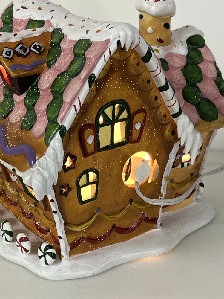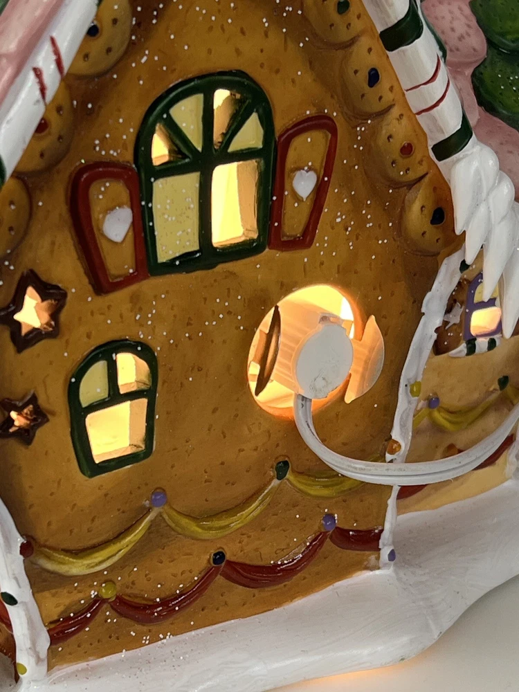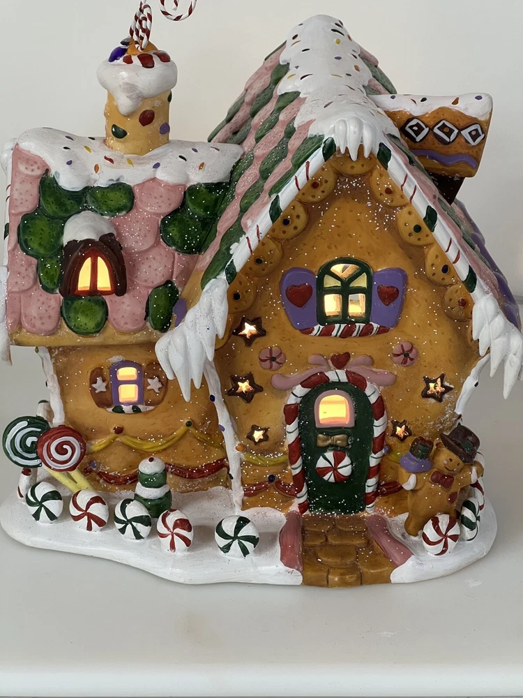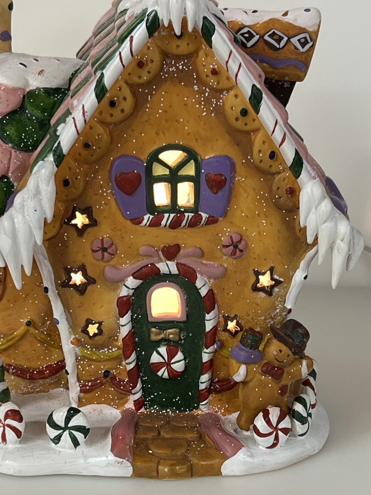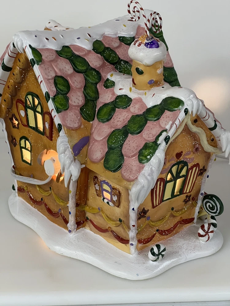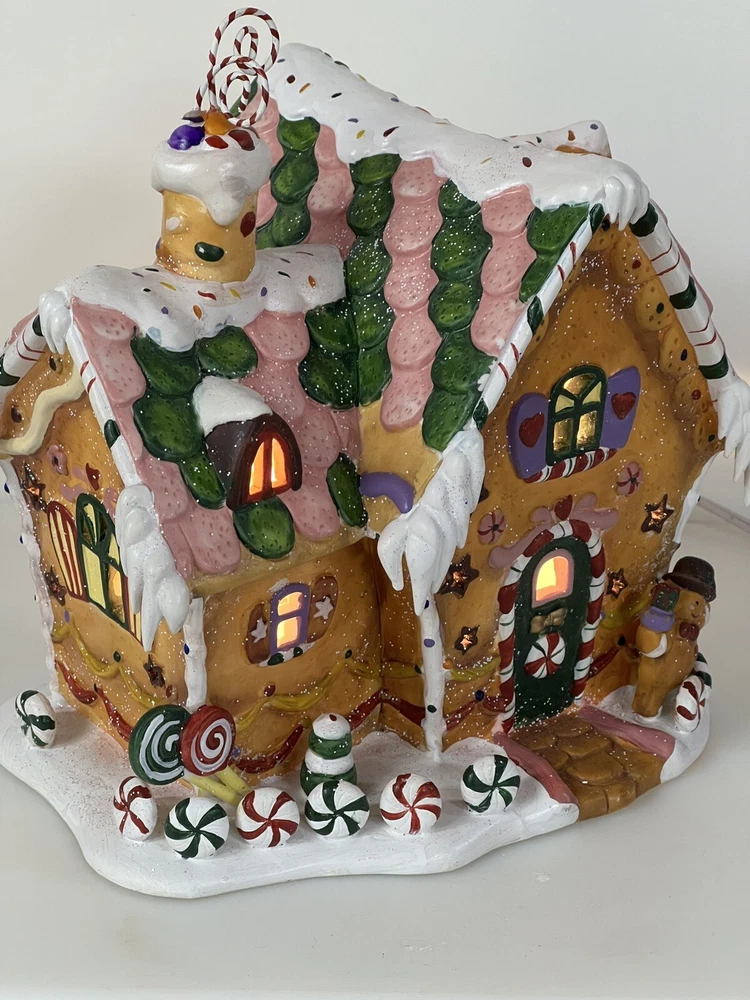 Holiday Time 2004 Village Collectibles Gingerbread House is a Medium-sized, hand-painted porcelain Christmas village piece. With a whimsical, Traditional style, it features an Asymmetrical shape with a 3D effect. This Limited Edition, Retired item is illuminated and has a textured finish, suitable for every day or seasonal display. Standing at 9 inches tall, it showcases a colorful, Multicolor design of a Gingerbread character. Perfect for any room, this collectible piece captures the festive Christmas theme. Beautiful piece , small repair on “ icicles “ on back corner of building, hard to see , picture # 3 . No original box , comes with light & cord Very good condition, very rare