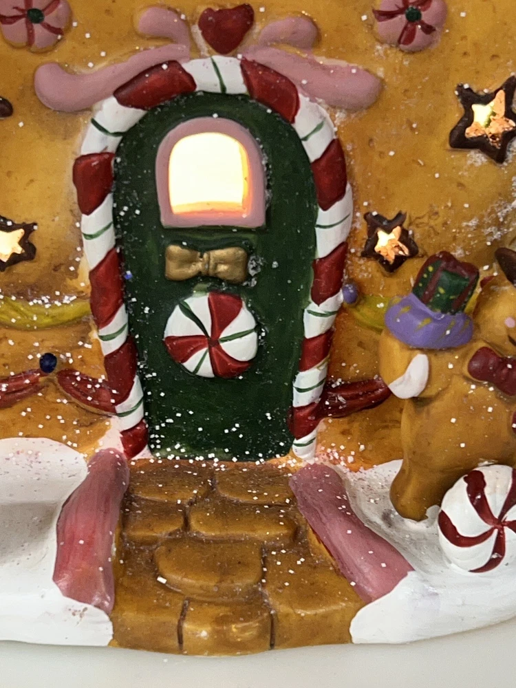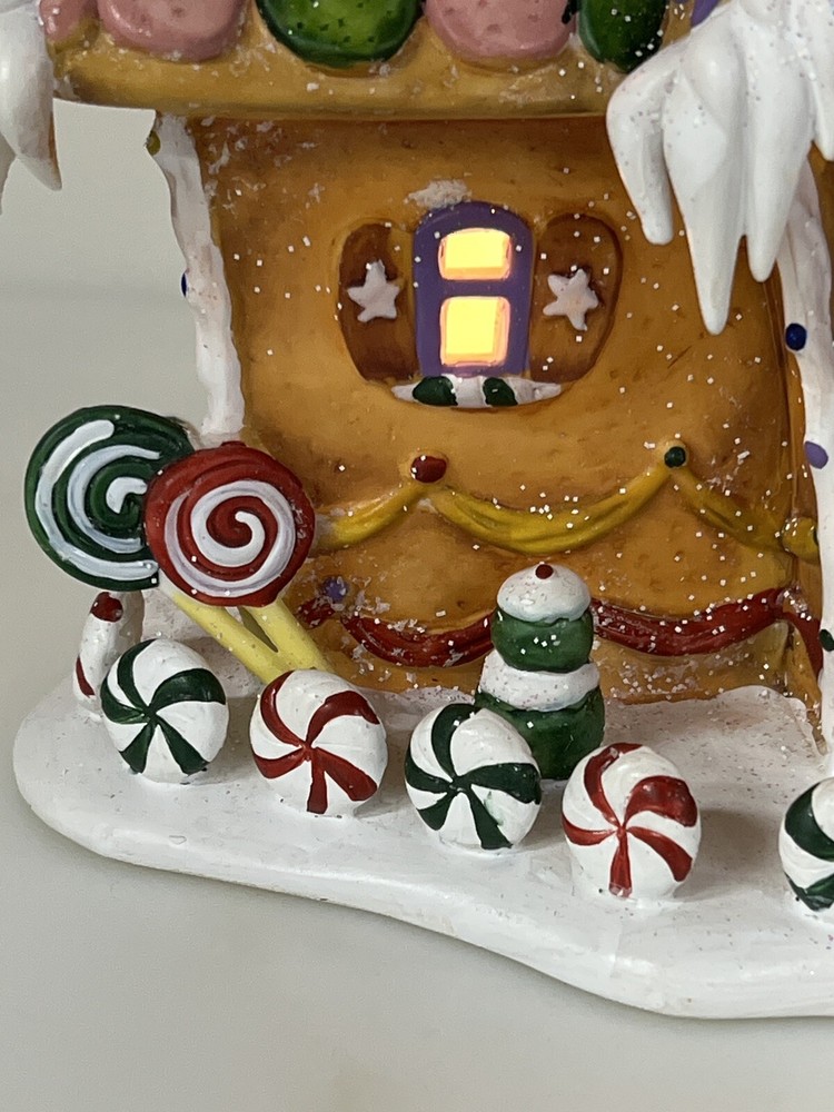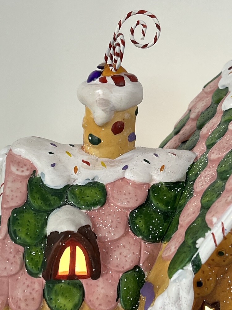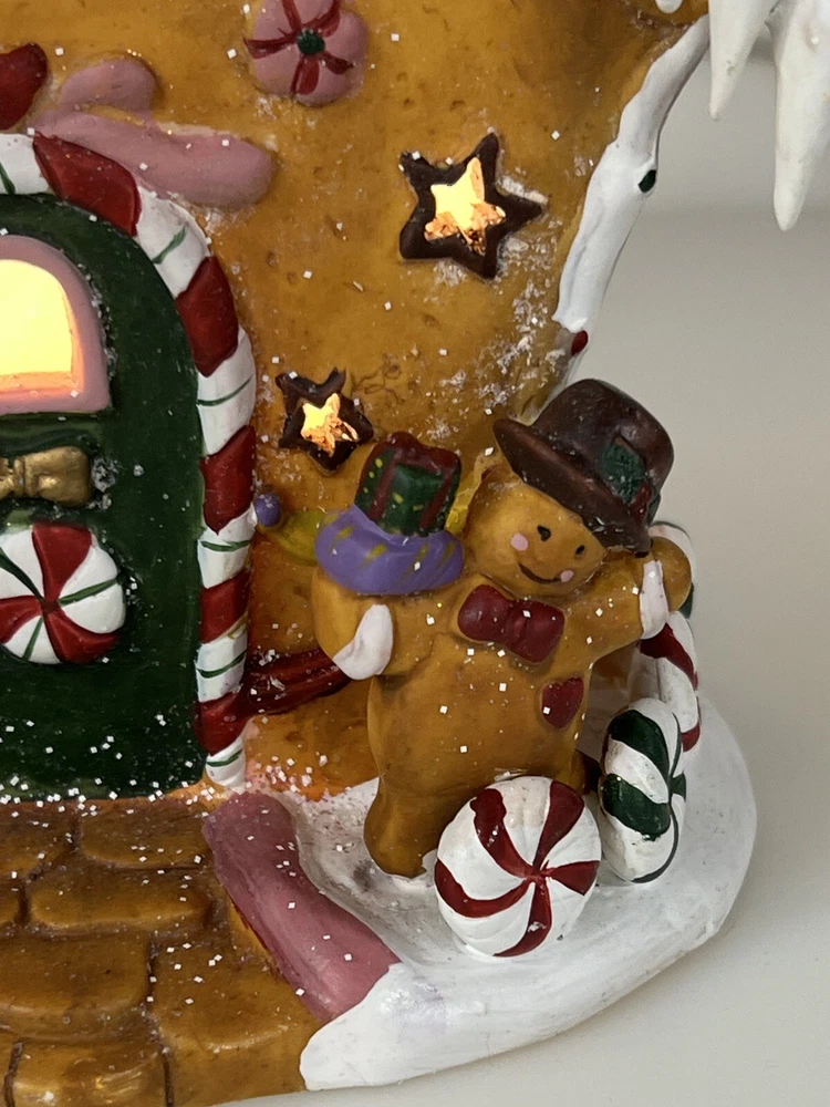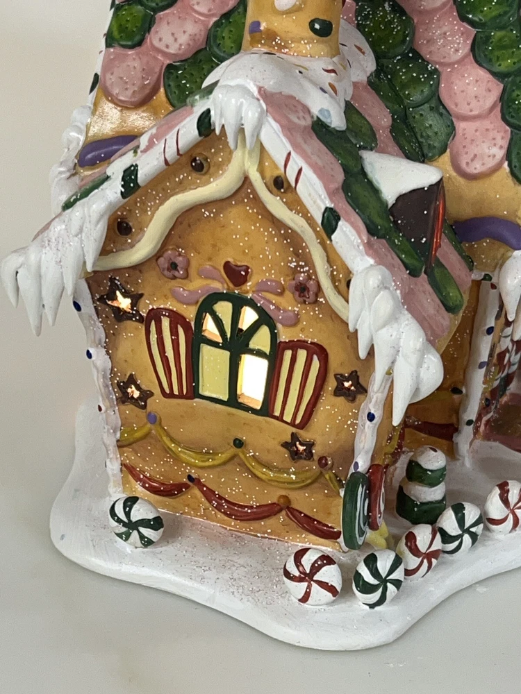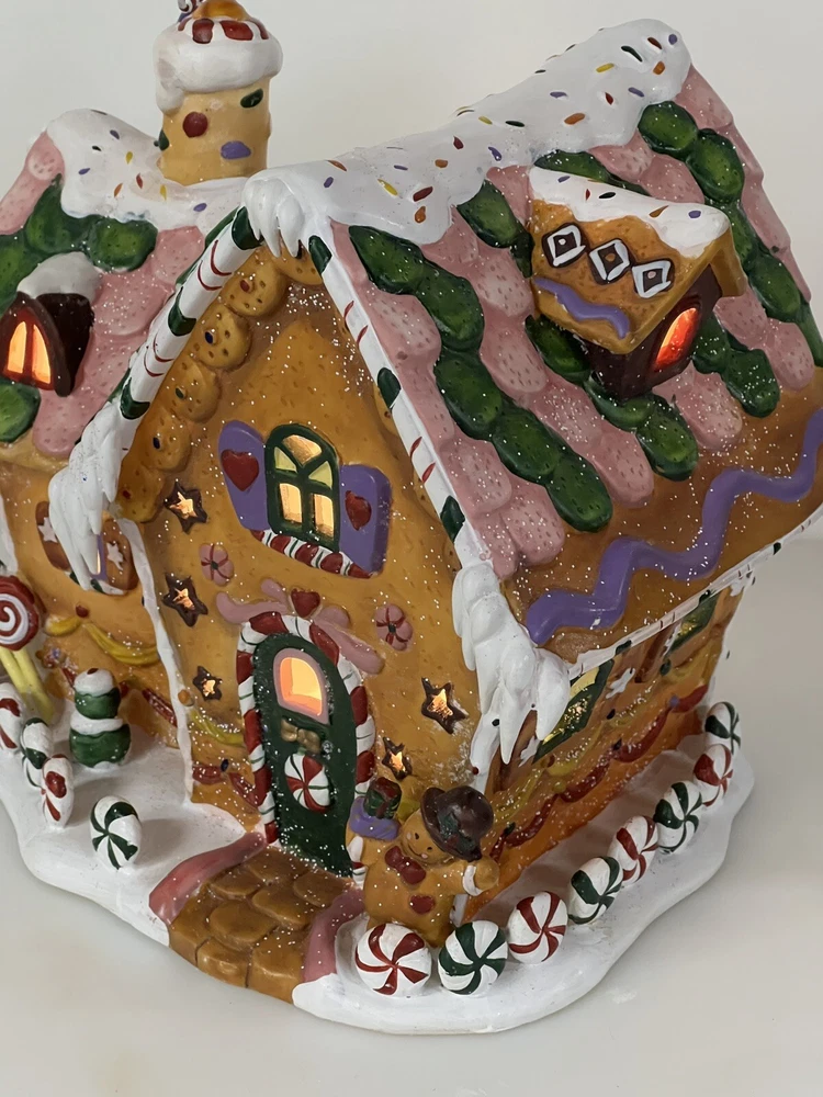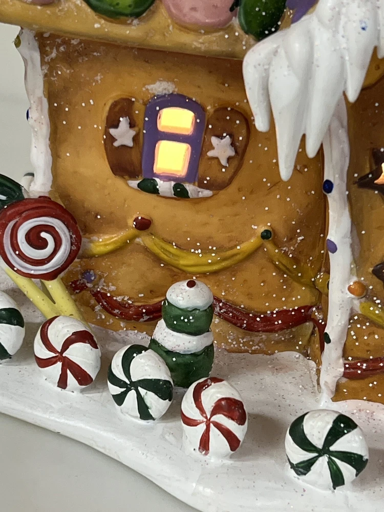 Holiday Time 2004 Village Collectibles Gingerbread House is a Medium-sized, hand-painted porcelain Christmas village piece. With a whimsical, Traditional style, it features an Asymmetrical shape with a 3D effect. This Limited Edition, Retired item is illuminated and has a textured finish, suitable for every day or seasonal display. Standing at 9 inches tall, it showcases a colorful, Multicolor design of a Gingerbread character. Perfect for any room, this collectible piece captures the festive Christmas theme. Beautiful piece , small repair on “ icicles “ on back corner of building, hard to see , picture # 3 . No original box , comes with light & cord Very good condition, very rare