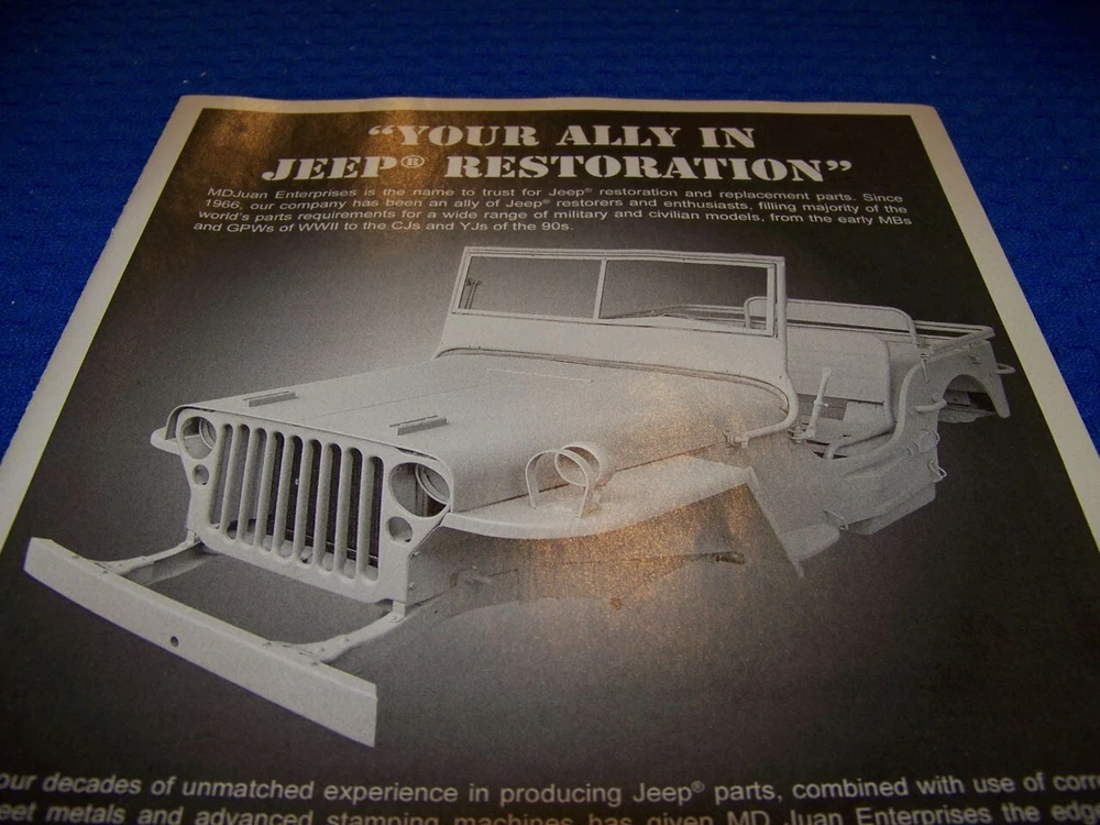 UP FOR SALE IS AN ORIGINAL PRINT 1-PAGE ARTICLE ON: 2004 MD JUAN JEEP RESTORATION "YOUR ALLY IN JEEP..". .. … … … VERY RARE ORIGINAL SALES AD*** Page size: APROX: 8.5" X 11" ARTIST/AUTHOR: MD JUAN ENTERPRISES INC. SUBJECT: . 2004 MD JUAN JEEP RESTORATION "YOUR ALLY IN JEEP..". .. . ….. PERFECT FOR FRAMING YEAR: 2004 ORIGINAL PRINT ….. A MUST HAVE ARTICLE!! CONDITION : GREAT- NORMAL FADING/WEAR ** SOLD FOR 1 PAGE/S ON SUBJECT LISTED ABOVE ONLY ...…ANY ARTICLE/PHOTOS/DRAWINGS ON BACK OF SUBJECT ARTICLE ARE NOT REPRESENTED IN THIS AUCTION!*** ** THESE LOOSE PAGED ARTICLES.. HAVE BEEN PROFESSIONALLY EXTRACTED FROM AGE/PERIOD MAGAZINES/BOOKS..... AND ARE BEING OFFERED ON SINGLE SUBJECTS FOR: COLLECTORS/MODEL BUILDERS/AVIATION COLLECTORS/RESEARCH/STUDY/STUDENTS/OWNERS OF AIRCRAFT... AND ARE NOT COMPLETE MAGAZINES OR BOOKLETS AS PHOTOS SHOW! (REMEMEBER THESE ARTICLES ARE EXTRMELY OLD AND RARE...SOME MAY HAVE SOME BORDER DISCOLORATION/SMALL EDGE CHIPS/PAGE DISCOLORATION)…..SEE CONDITION AND NOTES LISTED ABOVE AS TO EACH ARTICLE! **all articles are shipped flat on cardboard flat and mail flat in manila ** I DO OFFER COMBINED SHIPPING ON MULTIPLE ITEMS PURCHASED