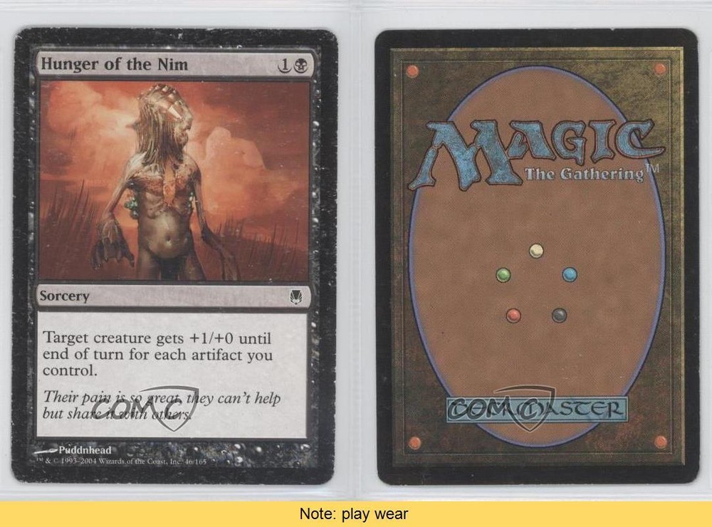 2004 Magic: The Gathering - Darksteel - [Base] #46 Hunger of the Nim COMC Item: 18497387 CONDITION NOTE: play wear - Magic Card - Featuring Hunger of the Nim Search for more: 2004 Magic: The Gathering - Darksteel Search for more: 2004 Magic: The Gathering - Darksteel - [Base] View all of our Listings Auctions Buy It Now About Us Located in the beautiful Pacific Northwest, COMC (Check Out My Cards) is the world's largest consignment service for trading card singles. More than 10,000 people have used our consignment service to list over 50 million trading cards. We currently house 20 million cards, each listed for sale with front and back images of the actual card. Find out how we can help you consign your items on eBay by contacting us through eBay messaging. COMC -- "The Safe & Easy Way to Buy & Sell" Raw Condition for Modern Cards Unless otherwise noted, raw modern cards are listed in Near Mint-Mint condition or better. A NM-MT card appears to be Mint at first glance, but upon closer inspection, may exhibit some of the following: minor print defects (e.g. roller marks, print line, dimple), minor scratches, slight edge wear, and slight corner wear. Centering is clearly visible in the images provided and does not factor into our condition assessment. Raw Condition for Vintage Cards Unless otherwise noted, raw vintage cards are listed in Excellent condition or better. An EX card may exhibit some of the following: minor rounding of corners, surface wear, print defects, light scratches, and slight edge wear/chipping. Centering is clearly visible in the images provided and does not factor into our condition assessment. Domestic Shipping Combined shipping for multiple items is available. To receive combined shipping, please ensure all desired items are in your eBay shopping cart before proceeding to checkout. eBay limits orders to 40 items per order. We automatically combine multiple orders placed on the same day. If you place multiple orders on the same day, please contact us to request a refund of applicable shipping costs. Signature confirmation may be required on invoices over $400. Raw cards are shipped in toploaders. International Shipping COMC offers eBay's International Shipping (EIS) for international orders under $2,500* (see country exceptions below). All duties and import fees are paid at checkout; in the rare event that there are additional import fees upon delivery, these are borne by the buyer. EIS packages route through a shipping hub in Erlanger, KY before shipping to their final destination. Please note that EIS does not allow for combined shipments. The shipping rates are determined by eBay and cannot be adjusted. *Maximum sale price exceptions: Colombia, Kuwait ($2,000); Taiwan ($1,539); Chile, Costa Rica, Guatemala, Honduras, Trinidad and Tobago ($1,000); Antigua and Barbuda, Aruba, Belize, Dominica, Grenada, Philippines, Saint Kitts and Nevis, Saint Lucia, Montserrat, Turks and Caicos Islands ($500); Dominican Republic, El Salvador ($200). Please request a shipping quote through eBay messaging for orders that exceed the maximum sale price supported by eBay's International Shipping. You will be responsible for all duties and import fees for international orders shipped outside the EIS. Raw cards are shipped in toploaders. Payment COMC does not accept offers on our cards through our eBay storefront. COMC utilizes eBay’s managed payments system. If you are experiencing difficulties making a payment, please contact eBay for assistance. Return Policy Returns are only accepted on the rare occasion the item is not as described. If you are making a return, please initiate the return process through eBay so a mailing label can be provided for you. Prior to listing, our expert team carefully assessed this item to represent it accurately. Please review the description and high-definition images prior to purchasing to ensure this item meets your satisfaction. We welcome you to contact us if you have further questions about this item. Trust and Integrity COMC carefully assesses each item consigned to us to prevent fraudulent items from entering the marketplace. If you believe an item offered on COMC may be fraudulent, please contact us with details so we can investigate the issue. Items we determine are outside our supported items policy may be removed. Last Modified: 1/22/2025 6:42:11 AM PDT