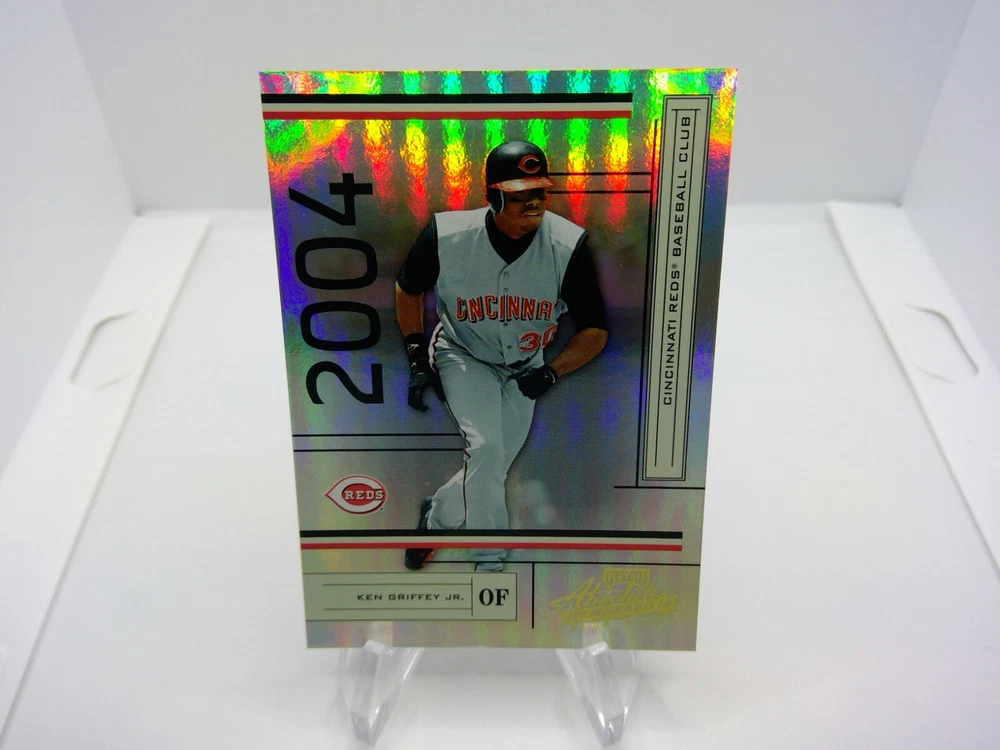 This is an amazing 2004 Playoff Absolute Memorabilia sports trading card featuring Ken Griffey Jr. of the Cincinnati Reds. The card is numbered out of 1349 and is in standard size. It was manufactured by Donruss/Playoff in the United States and is part of the Major League (MLB) league. This card is a must-have for any baseball fan and collector. It is an absolute memorabilia card with features like serial numbering, making it a rare and valuable addition to your collection. The card is in English language and has the card number 60, representing the 2004 season. Get your hands on this fantastic card and add it to your sports trading card collection today. 100/1349.