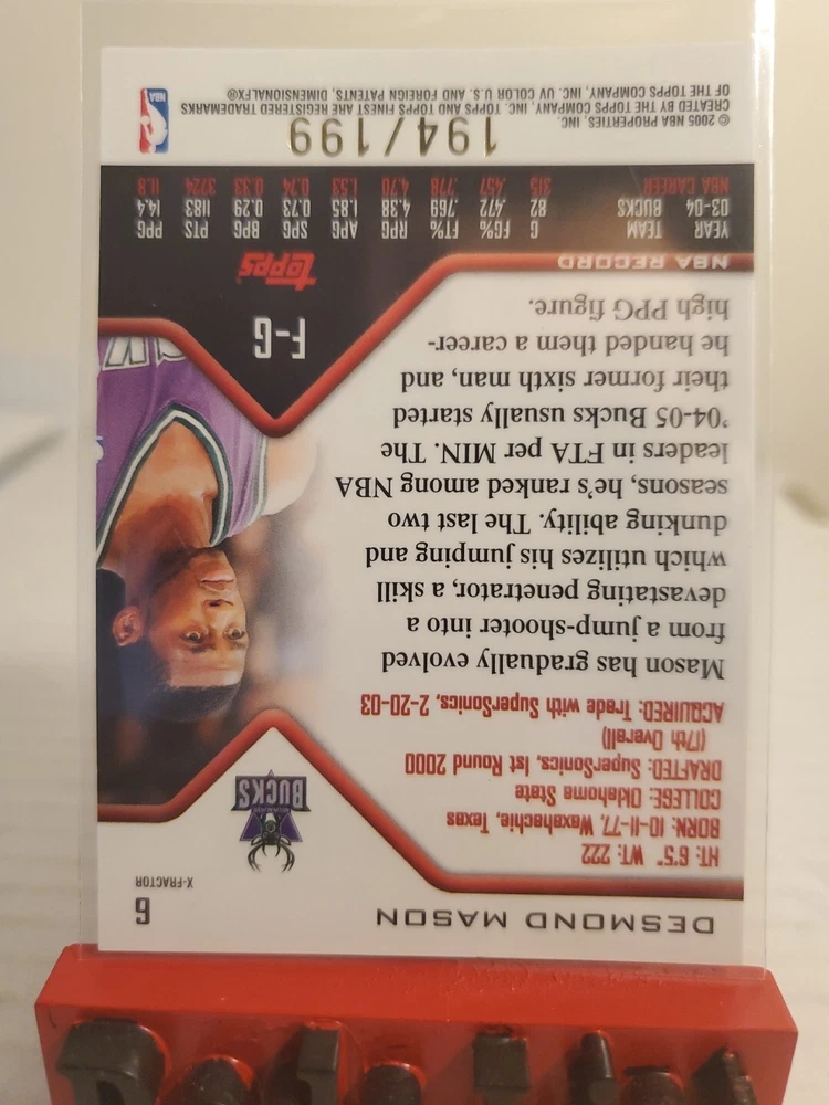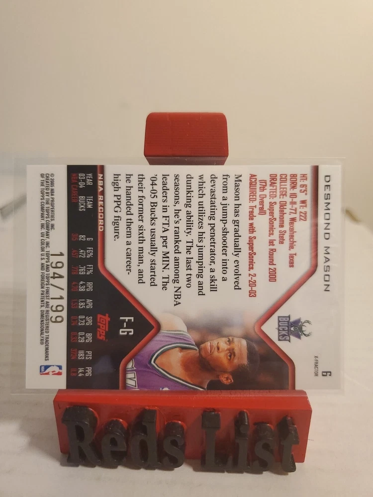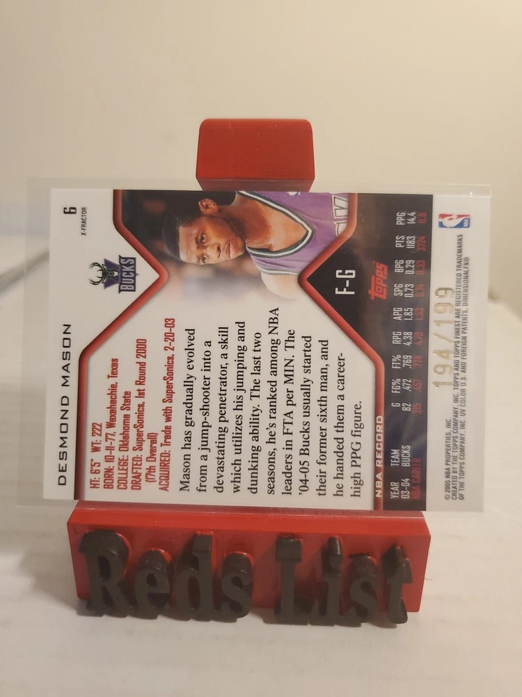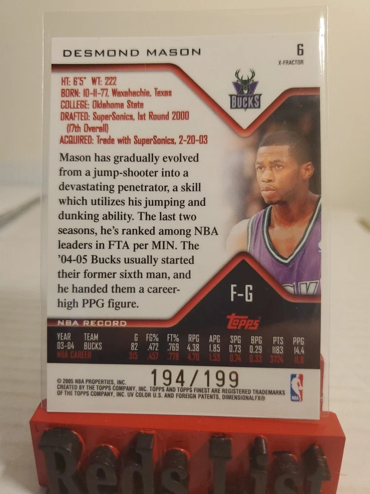 2004-05 Topps Finest X-Fractor #6 Desmond Mason 194/199 Milwaukee Bucks Condition is "Very Good". Shipped with USPS Gound Advantage Due to my schedule The Post Office is close before I head to work and close when I get off work Sunday - Friday I'm Is only able to go to the Post Office Saturday but I sometimes get off early so if payment is not received by night before they won't be shipped until the following off day so for any delay of shipping i will try my best to get it off on time I'm not a professional grader...... The majority of my cards are packed fresh open by myself however I bought Many cases over the years to build my sets I bought cards from card shops card shows Instagram and and even eBay to add to my collection and now my collection to me is not what it used to be so I'm slowly getting rid of my collection looking for cards let me know I have thousands I did not check every card for flaws my feedback speaks for itself no my other pages I used the term VERY GOOD good to cover myself LOOK AT THE THE PICTURES. And for everyone who expects every card to be a mint 9 or 10 very good could have flaws A ding here A rough corner there ask for for pics What U See Is Wat U Get. Additional cards will be $1 Wait for invoice if not I will not get give discount If you are looking for Other cards hit me up I have singles, Rookies , Jersey's , Auto's , Numbered, Some Sets i have a lot thank you any questions just ask ask good luck