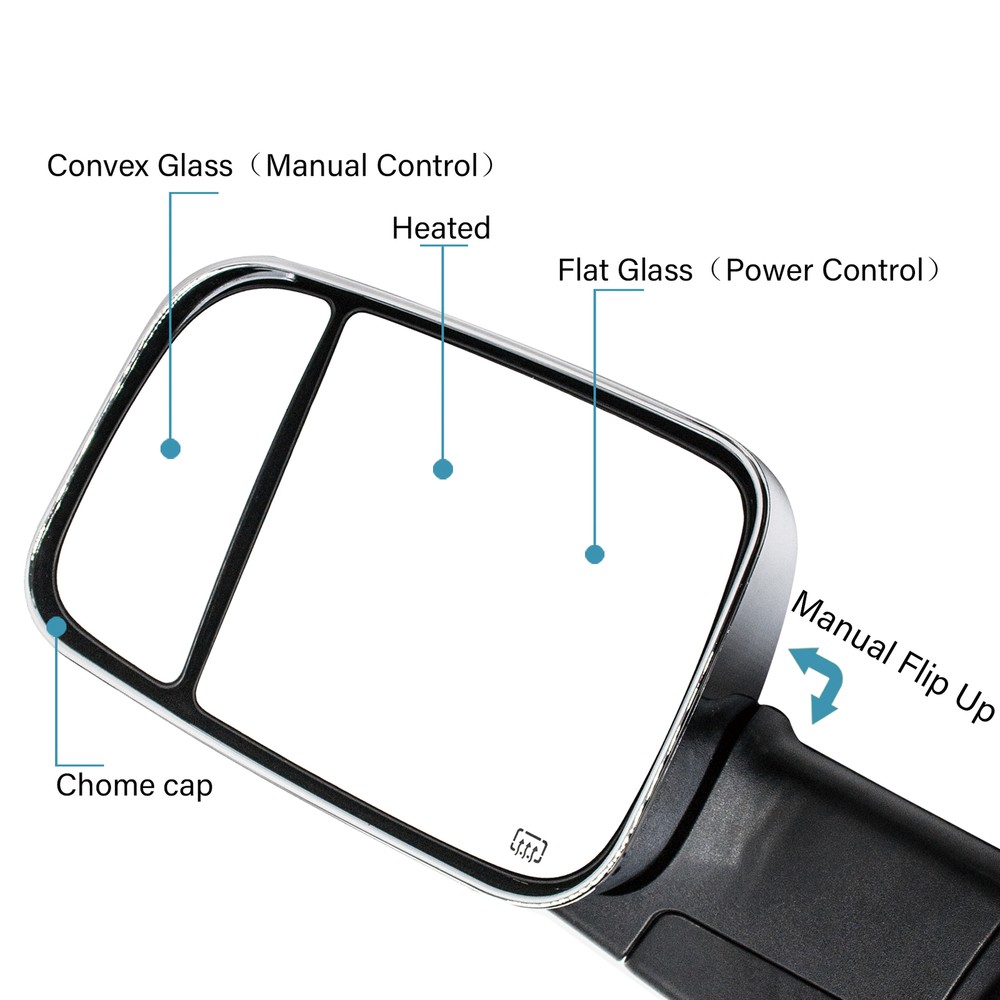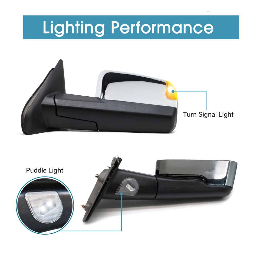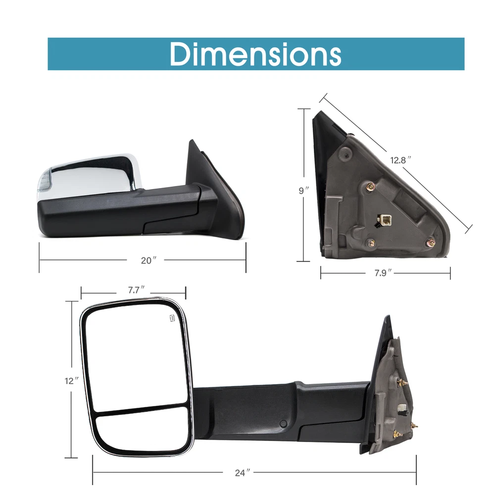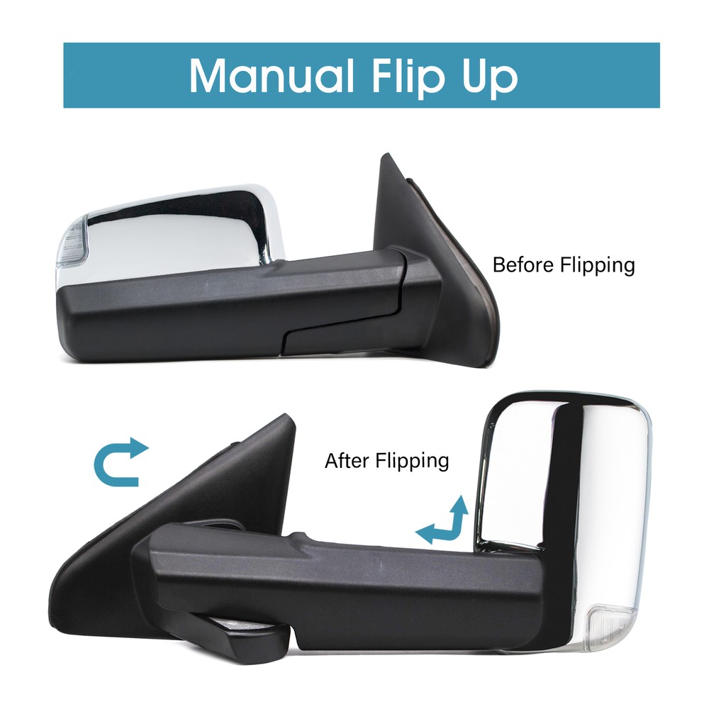 Product Description Detailed description of the product Specifications : Condition New Number Of Pieces 2 Fold Away Manual Fold Warranty 1 Year Color Chrome Location Passenger Right + Driver Left Side Features: LED Turn Signal Light Power Adjustment Mirrors Heating Element to Defrost Mirrors Manual Fold Up Arms Puddle Light Manual extended telescoping wide angle mirrors (provide a better angle and parking in tight spots) Fits: 2002 2003 2004 2005 2006 2007 2008 Dodge Ram 1500 Towing Mirrors 2003 2004 2005 2006 2007 2008 2009 Dodge Ram 2500 3500 Towing Mirrors Note : These mirrors will only work properly on vehicles with these exact options. If your vehicle does not have the options listed, these mirrors may not function properly. No installation guide. Professional installation is highly recommended. In the event the item should fail due to manufacturing defects during intended use, we will replace the part by free.(1 Year Warranty) If you encounter any problems, please contact us and we will provide you with solutions. Thank you! Payment Shipping Returns Contact Us PayPal is our preferred method of payment for all of our eBay sales. For customer service please contact us via eBay MessagesImmediate payment via PayPal is required for all Buy It Now items. If you need special arrangements, please contact us through eBay messages. Generally, all goods will be shipped within 24 hours after the payment on the working day (except for goods sent from China). If you want to cancel the order or change the address, please contact us within 6 hours after payment, otherwise we will not be responsible. It takes 3-5 working days for logistics and transportation to be delivered. If you are not satisfied with your purchase, you may return it, for a refund or replacement - subject to the following: Contact us through eBay messages or the returns link to receive a Returned Merchandise Authorization (RMA) number to ensure proper handling of the return and/or replacement. In order to be eligible for a full refund, less shipping expenses, your returned merchandise must be in its original new condition, as shipped, with all packaging, manuals, and paperwork intact and unaltered. Items which have been opened are returnable, however they will carry a restocking fee. If that product is returned for a refund, the shipping expenses incurred, will be deducted from the refund. If an item is refused, the carrier bills us for shipping both ways, and these expenses incurred on your behalf need to be deducted from your refund If you have a question about a part you should contact us before buying.And If you have any questions after purchase, please contact us and we will provide a satisfactory solution. Payment PayPal is our preferred method of payment for all of our eBay sales. For customer service please contact us via eBay MessagesImmediate payment via PayPal is required for all Buy It Now items. If you need special arrangements, please contact us through eBay messages. Shipping Generally, all goods will be shipped within 24 hours after the payment on the working day (except for goods sent from China). If you want to cancel the order or change the address, please contact us within 6 hours after payment, otherwise we will not be responsible. It takes 3-5 working days for logistics and transportation to be delivered. Returns If you are not satisfied with your purchase, you may return it, for a refund or replacement - subject to the following: Contact us through eBay messages or the returns link to receive a Returned Merchandise Authorization (RMA) number to ensure proper handling of the return and/or replacement. In order to be eligible for a full refund, less shipping expenses, your returned merchandise must be in its original new condition, as shipped, with all packaging, manuals, and paperwork intact and unaltered. Items which have been opened are returnable, however they will carry a restocking fee. If that product is returned for a refund, the shipping expenses incurred, will be deducted from the refund. If an item is refused, the carrier bills us for shipping both ways, and these expenses incurred on your behalf need to be deducted from your refund Contact Us If you have a question about a part you should contact us before buying.And If you have any questions after purchase, please contact us and we will provide a satisfactory solution. On Dec 3, 2024 at 12:00:37 PST, seller added the following information: