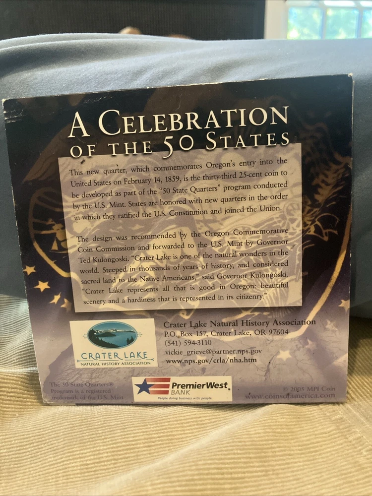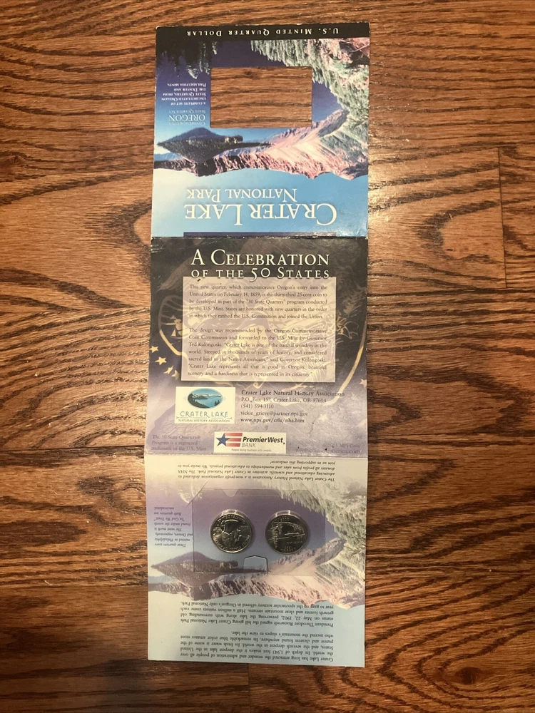 “2005 Crater Lake National Park Quarter Set – Uncirculated. Includes two uncirculated quarters (Denver and Philadelphia Mint) in original packaging with Crater Lake imagery. Great for collectors!” • 2005 Crater Lake National Park Quarter Set • Two uncirculated quarters (Denver and Philadelphia Mints) • Original packaging with Crater Lake imagery • Stunning depiction of Oregon’s Crater Lake • Ideal for collectors