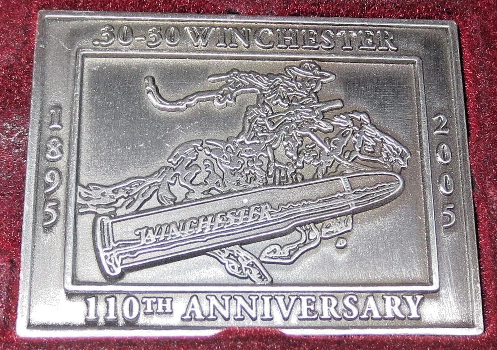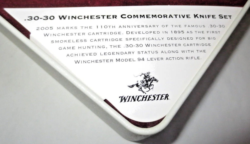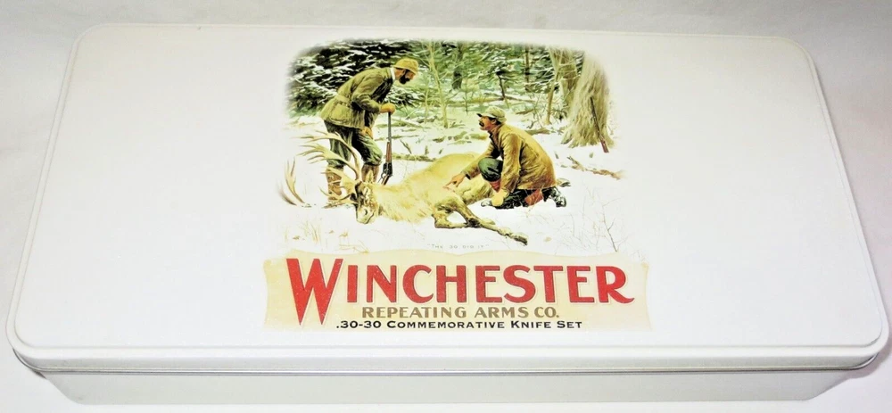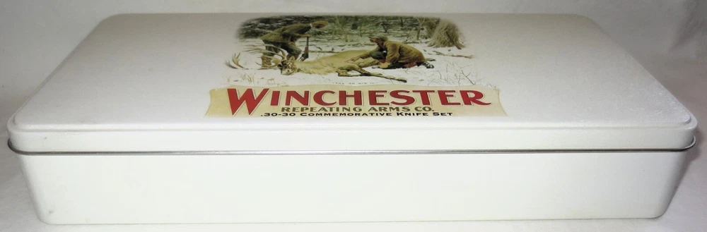 Winchester Repeating Arms Co. .30-30 Commemorative Knife Set metal tin/box with burgundy fitted interior, metal commemorative lapel pin, and paper info sheet. No knives just the metal box! 11-1/2" long, 2" tall, and 5-1/2" wide. Has an image of two hunters, their Winchester rifles, and a Caribou with the caption "THE 30 DID IT". If you have the two knives but not the display tin, here is your chance to put them together.