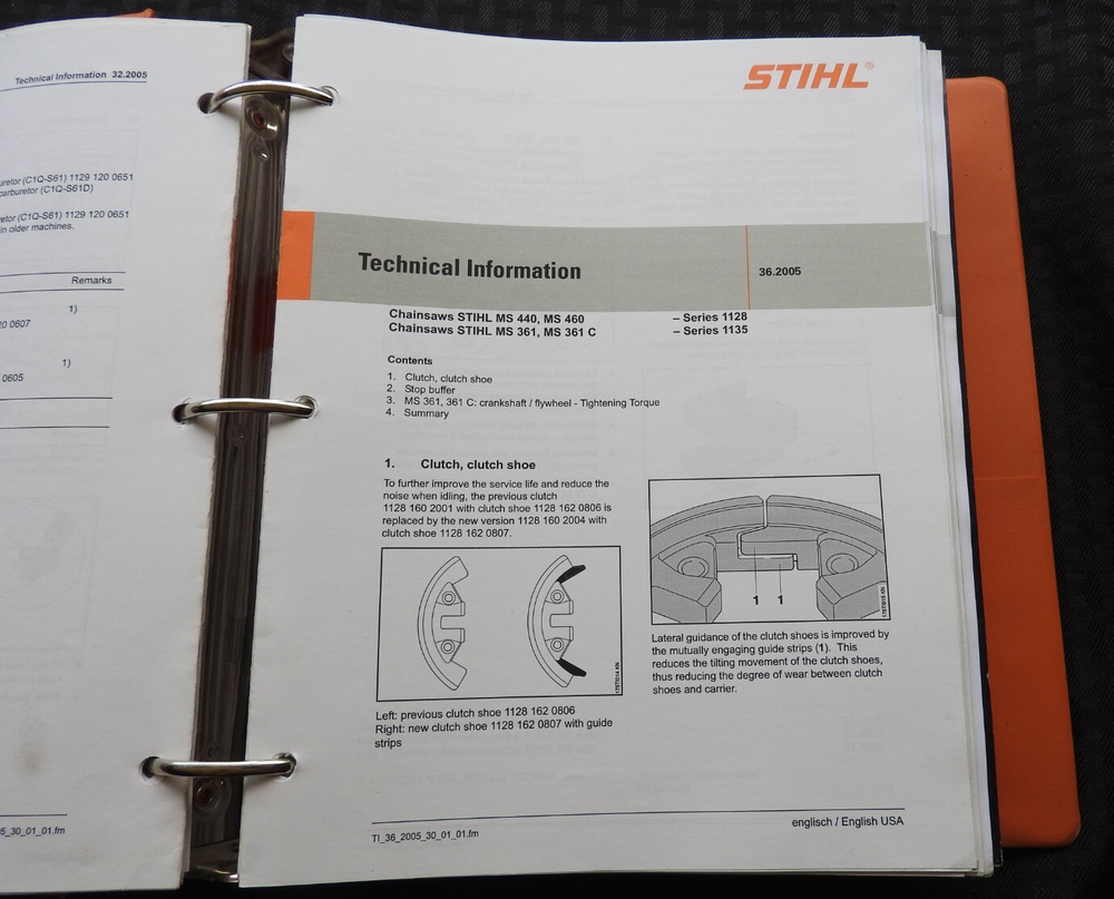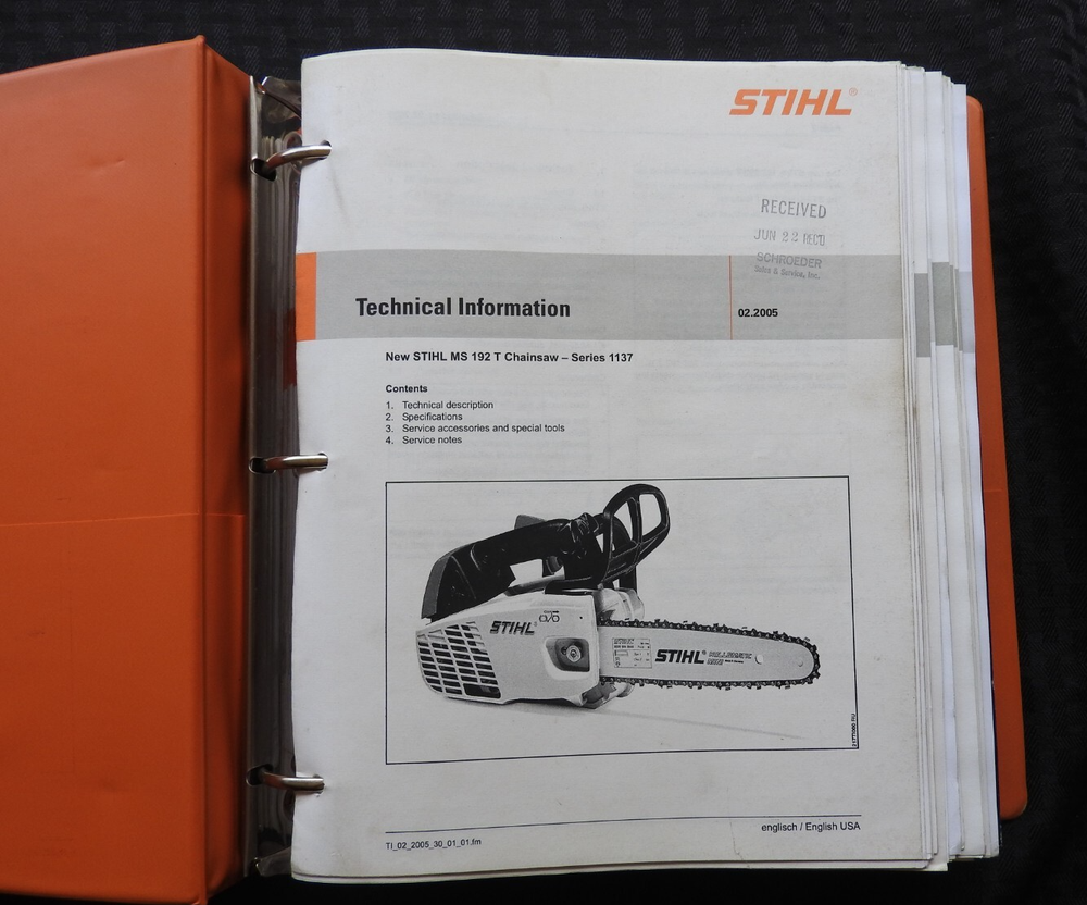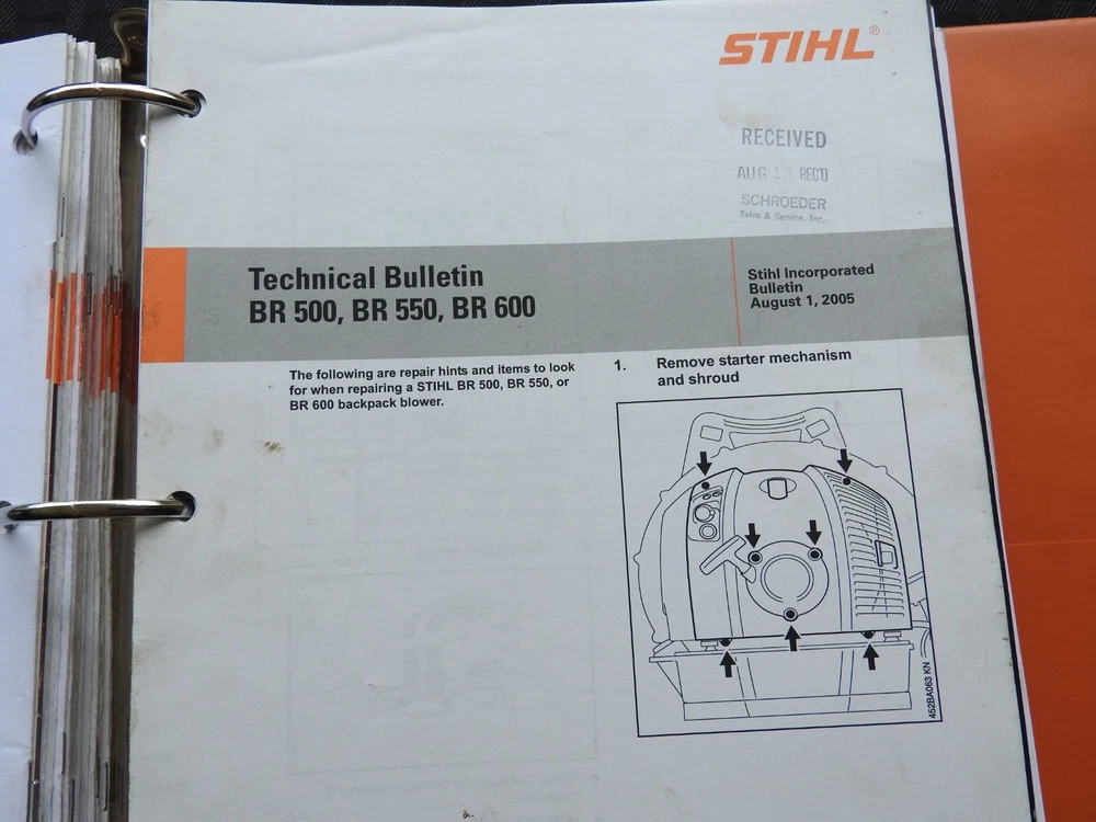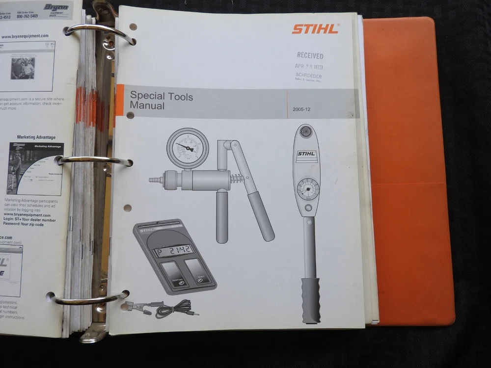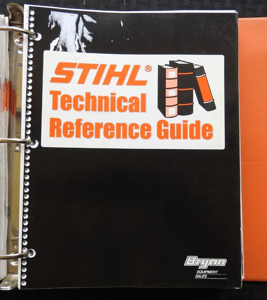 We recently acquired several vintage Stihl manuals. This is an ORIGINAL Stihl Dealers' "Chainsaw, Brush Cutter, Pole Saw, Trimmer etc..." Technical Information Bulletin Manual, (2005-2006printing). This manual is full of technical bulletins that has information that the service manual DID NOT have with in-depth service tips, repair instructions, engineering changes, specification information etc....for these classic Stihl saws, trimmers, etc (please see pics). There is also a special tools catalog. These cover electric chainsaws, pole saws, hedge trimmers, string trimmers, etc....This manual weighs about 7 pounds and contains several hundred clean pages. Manual is in VERY GOOD overall condition and it will ship for FREE. Thanks for viewing...........Triple K