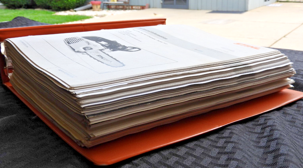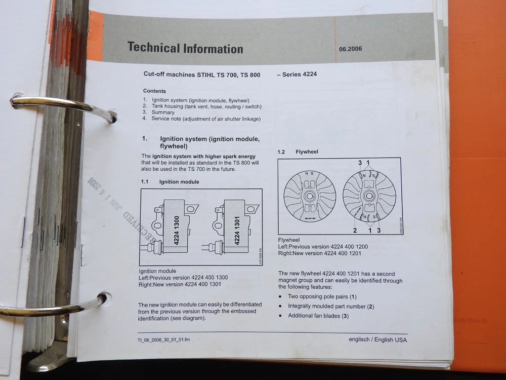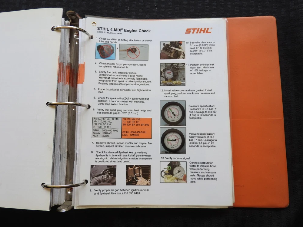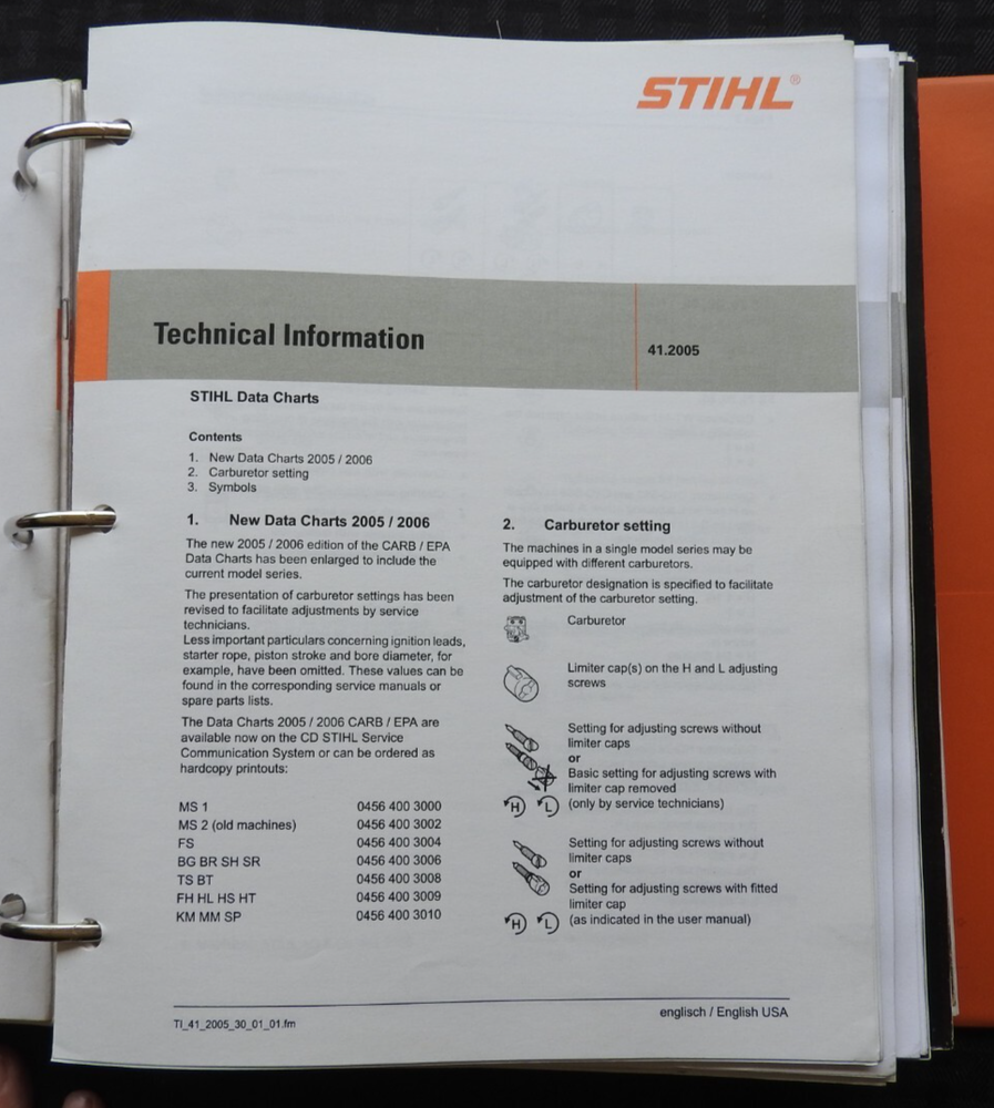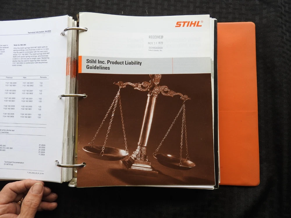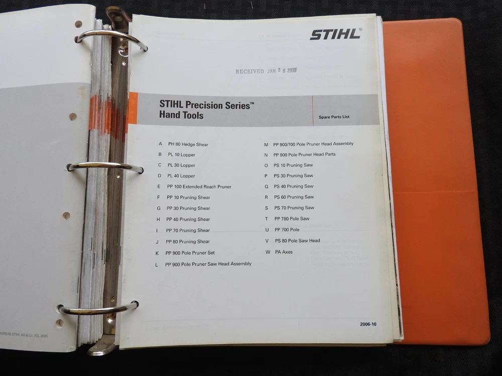 We recently acquired several vintage Stihl manuals. This is an ORIGINAL Stihl Dealers' "Chainsaw, Brush Cutter, Pole Saw, Trimmer etc..." Technical Information Bulletin Manual, (2005-2006printing). This manual is full of technical bulletins that has information that the service manual DID NOT have with in-depth service tips, repair instructions, engineering changes, specification information etc....for these classic Stihl saws, trimmers, etc (please see pics). There is also a special tools catalog. These cover electric chainsaws, pole saws, hedge trimmers, string trimmers, etc....This manual weighs about 7 pounds and contains several hundred clean pages. Manual is in VERY GOOD overall condition and it will ship for FREE. Thanks for viewing...........Triple K