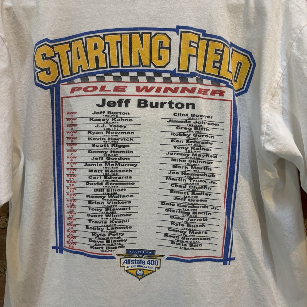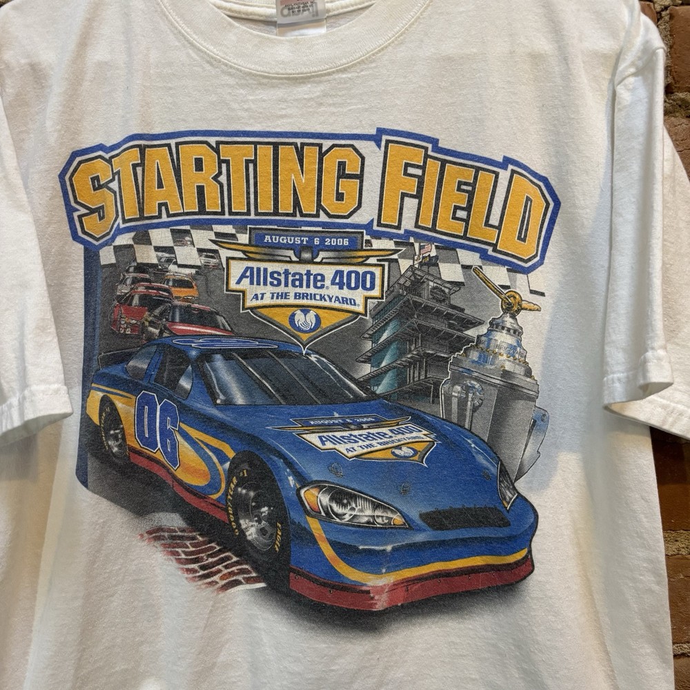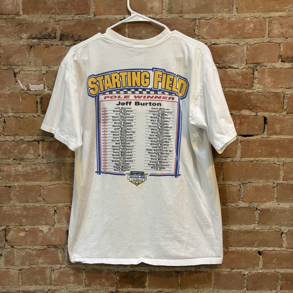 $80 2006 Allstate 400 NASCAR Double Sided Big Print Racing Tshirt Size: large Condition: great 28 inches long 21 inches wide Embrace your racing spirit with this $80 Allstate 400 NASCAR T-shirt, a must-have for any NASCAR enthusiast. Featuring a bold, double-sided print that celebrates the thrilling 2006 race, this white, short-sleeve tee is crafted from comfortable cotton and boasts a classic crew neck for a relaxed fit. The vibrant graphics and logo accents capture the essence of the high-speed event, making it a standout piece in any fan's collection. Available in a size Large, this regular-fit T-shirt is machine washable for easy care. Whether you're at the track or just showing off your NASCAR pride, this unpersonalized shirt is a timeless addition to your wardrobe, perfect for any casual occasion. It's not just apparel; it's a statement of your passion for cars and sports.