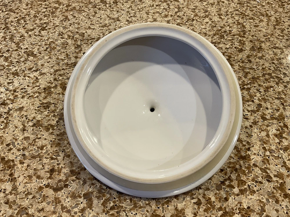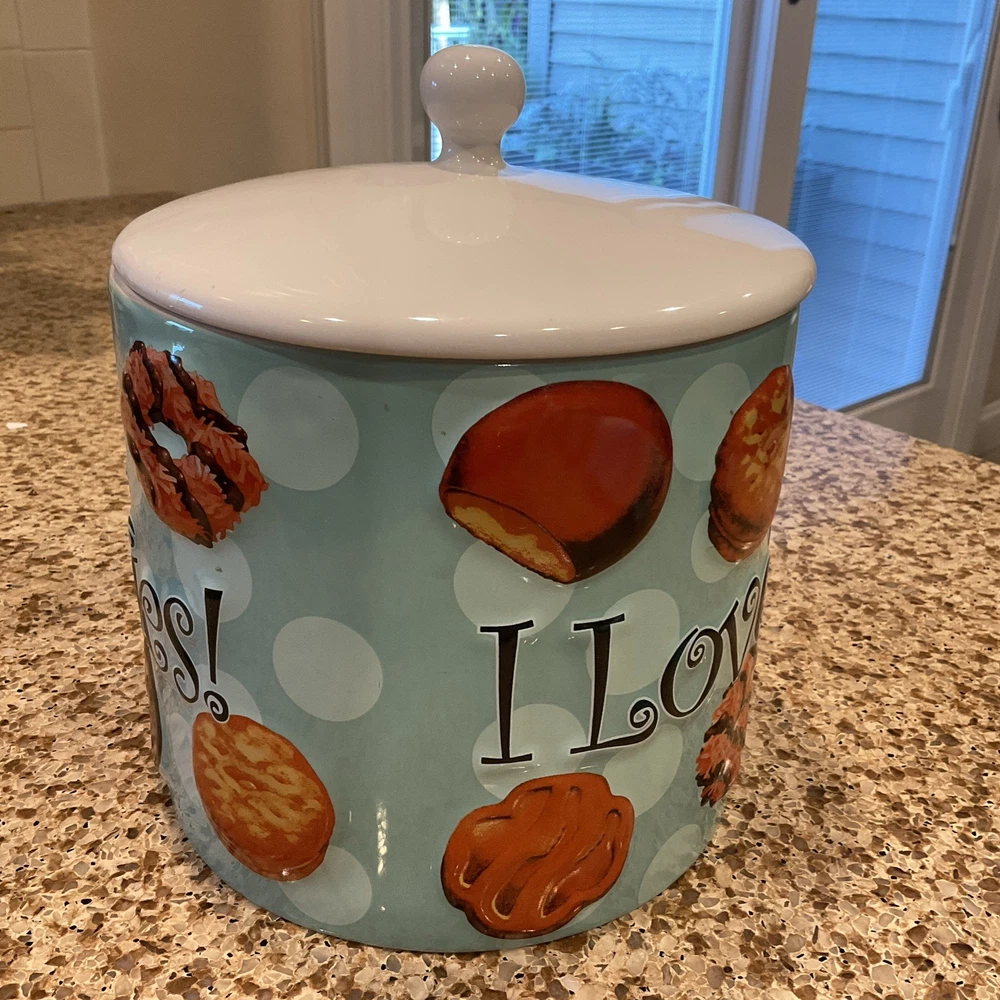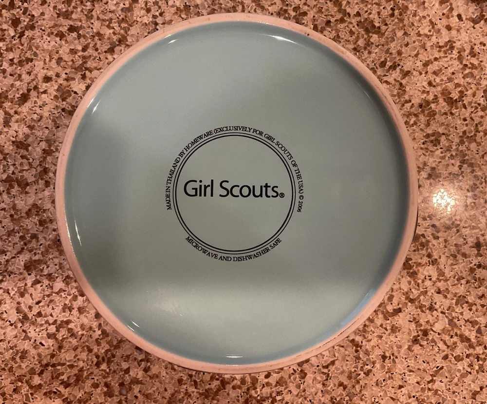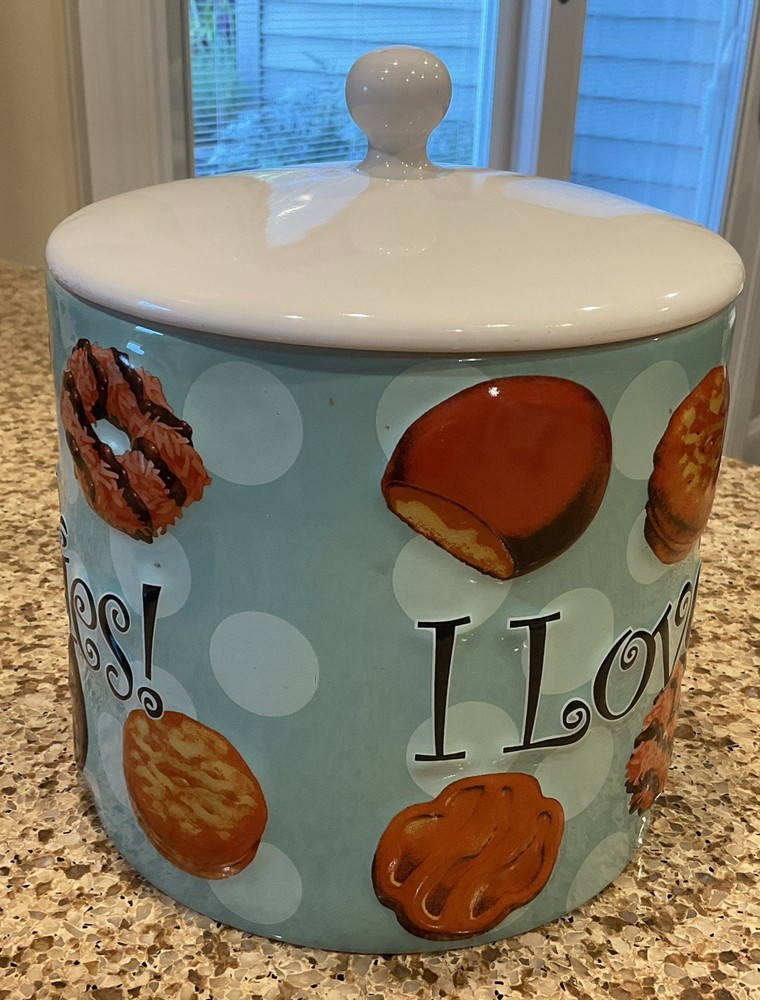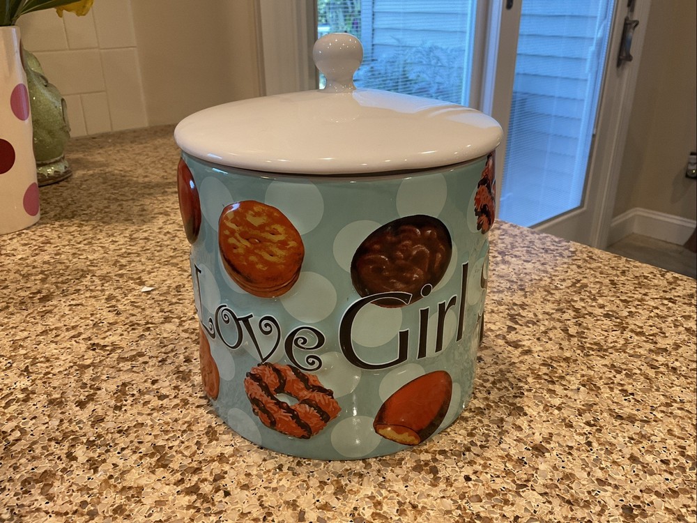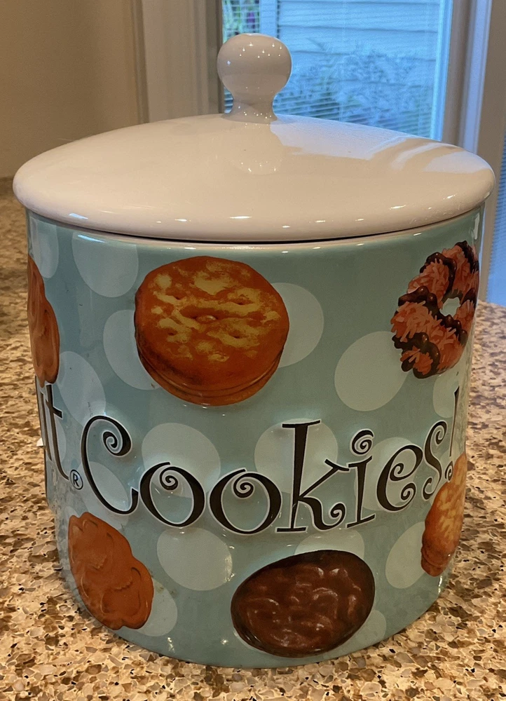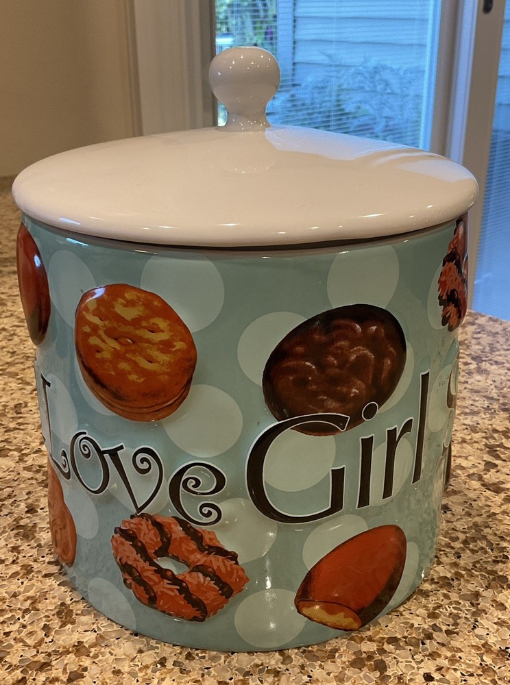 The 2006 I Love Girl Scout Cookies ceramic cookie jar with a 3D design is a large round container with a rubber gasket lid. . Made from ceramic, this contemporary style cookie jar stands at 10 inches tall and 7 inches wide, with a rubber gasket within the lid to keep your cookies fresh. The advertising theme and original design make this cookie jar a perfect addition for any Girl Scout enthusiast or cookie lover. This was gently used, if even used. It might have been used for decoration. The inside is clean with no marks. No chips or cracks or crazing! It is in VERY, VERY GOOD condition. It is 18 years old. The shipping is higher for this piece because it is very heavy, well made. It weights 6 pounds! A great jar to add to your COLLECTION!!!