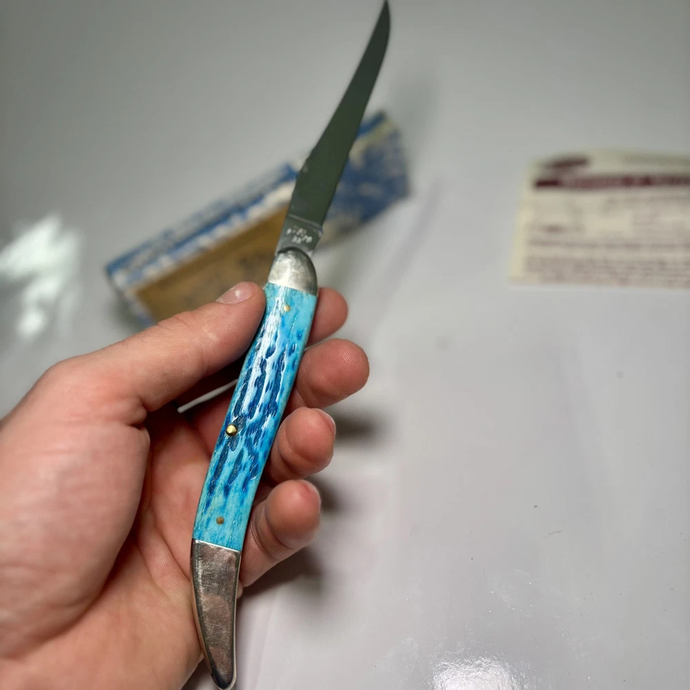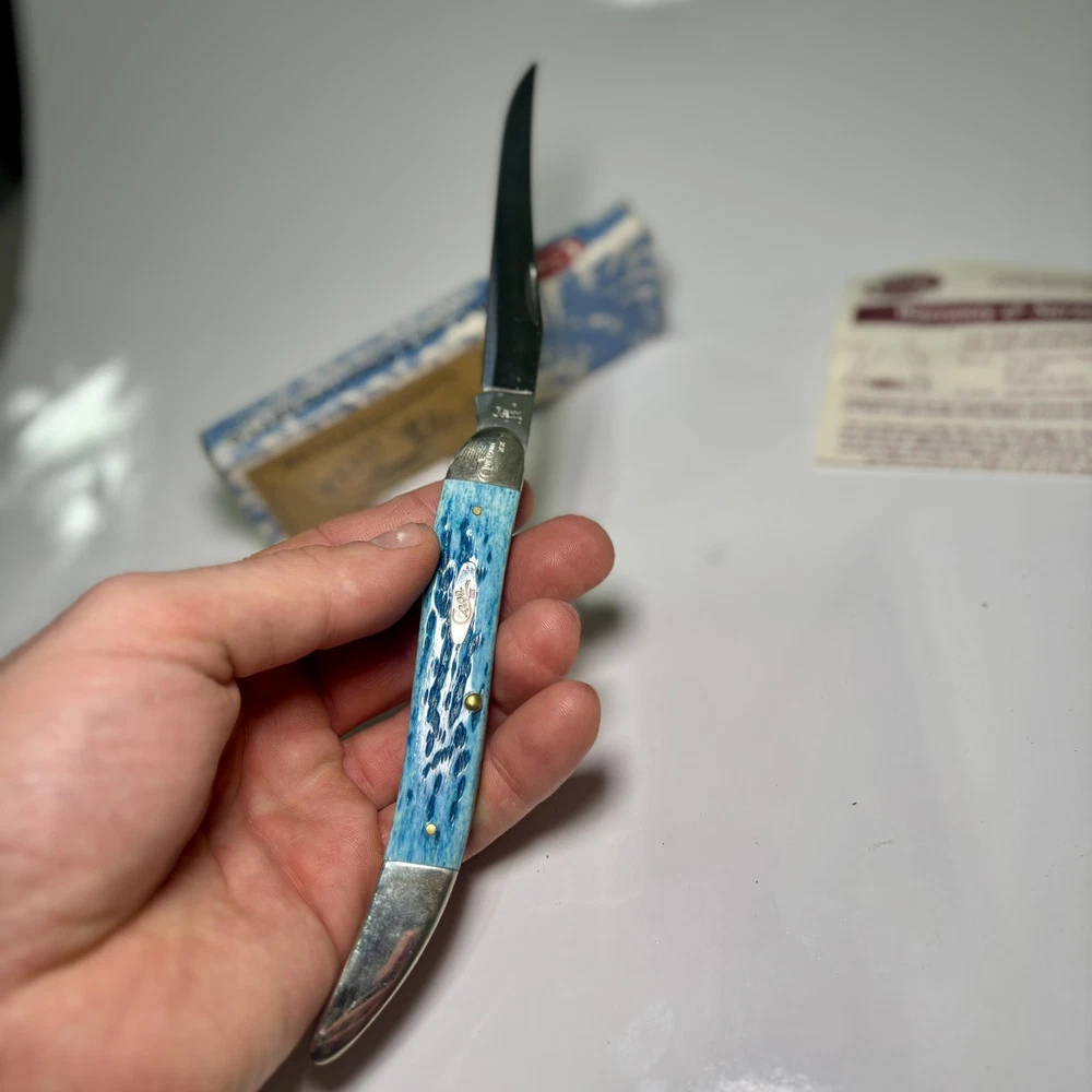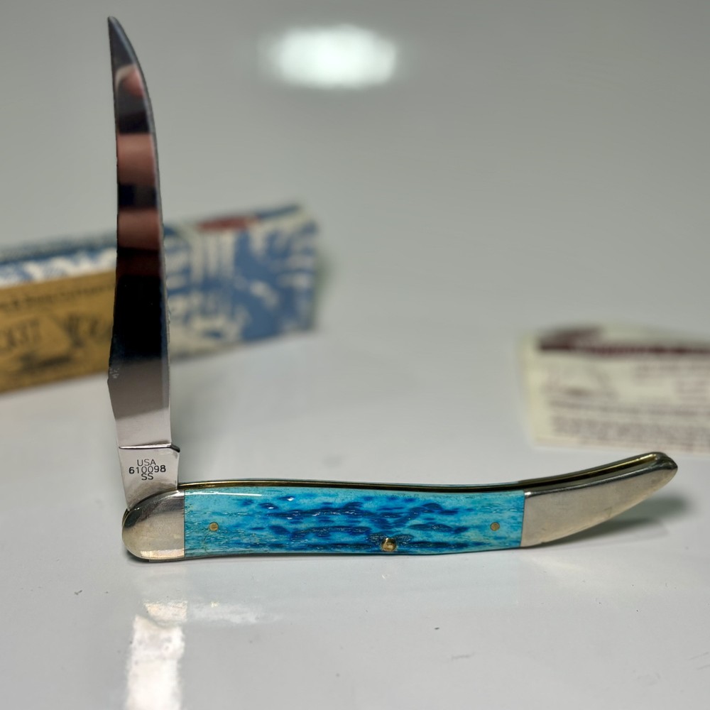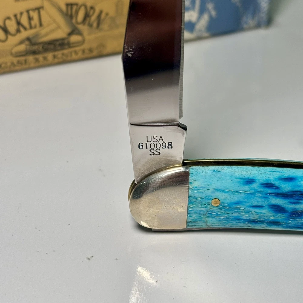 The Case XX 2007 Caribbean Blue Bone Large Toothpick Pocket Knife 610098 features a stainless steel clip point blade over 4 inches long. It has a manual opening mechanism and a blue bone handle. This ambidextrous pocketknife is a cool color collectible made in the United States by Case XX. It includes a toothpick tool and is a modern folding knife with a single blade.