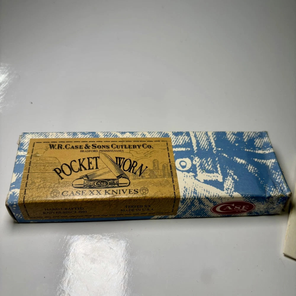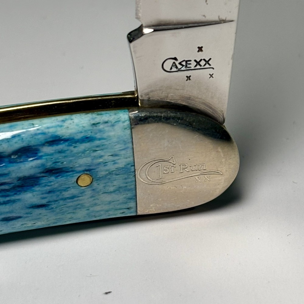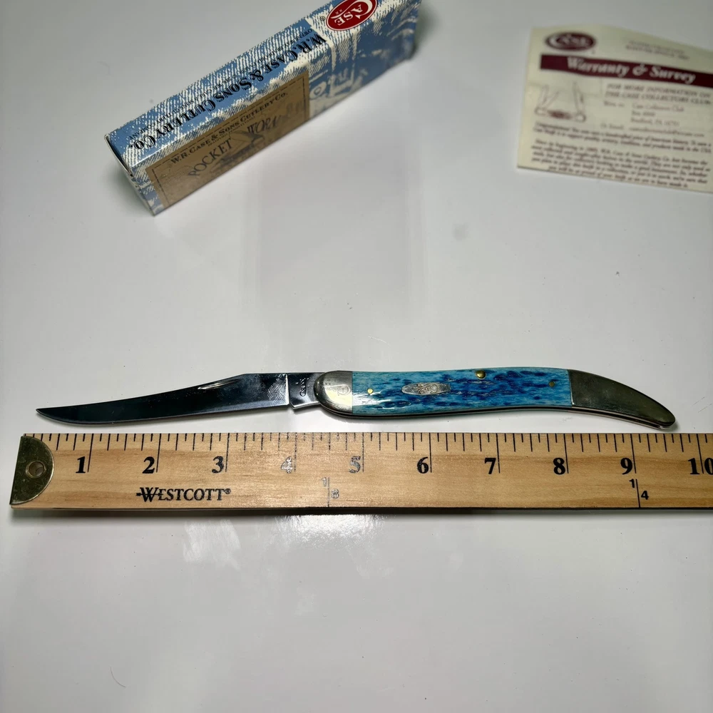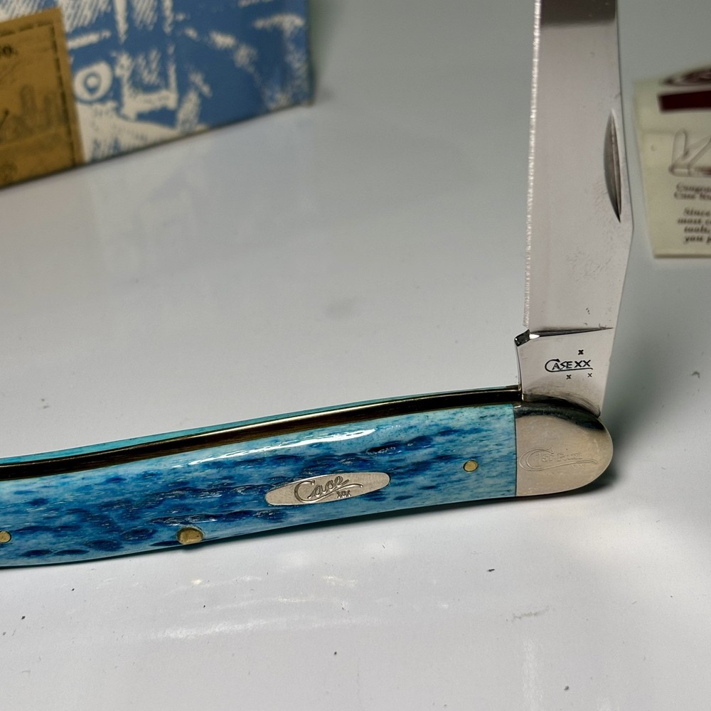 The Case XX 2007 Caribbean Blue Bone Large Toothpick Pocket Knife 610098 features a stainless steel clip point blade over 4 inches long. It has a manual opening mechanism and a blue bone handle. This ambidextrous pocketknife is a cool color collectible made in the United States by Case XX. It includes a toothpick tool and is a modern folding knife with a single blade.