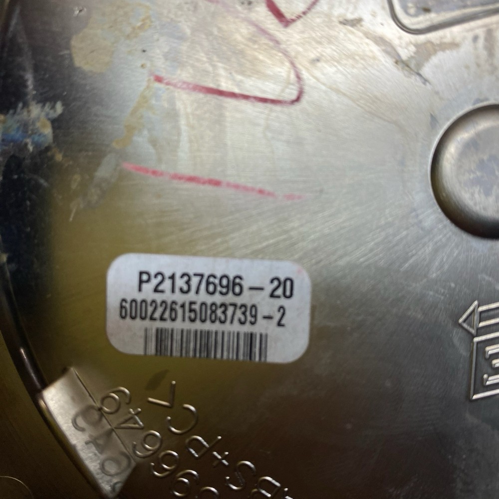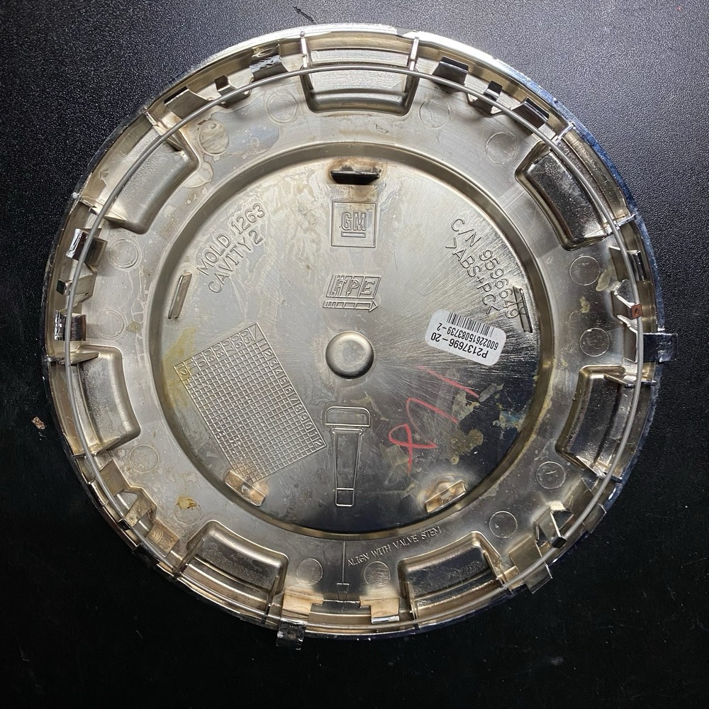 This is a used wheel center cap designed for a 2007-2009 Cadillac Escalade. The center cap is silver in color and made of chrome material, featuring an emblem with the Cadillac logo. It has a manufacturer part number of 9596649 and an inside diameter of 8 inches. The cap is designed for the front left placement on the vehicle and is easy to install. This original equipment manufacturer (OEM) part is a genuine Cadillac product that provides a specific fitment for the specified vehicle model years.