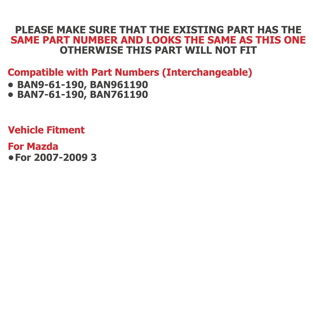 OEM Climate Control Module For 2007-2009 Mazda 3 IMPORTANT NOTES (FOR THIS PART TO WORK BOTH CONDITIONS BELOW SHOULD APPLY) Please make sure that the existing unit: Has the same button combination as this unit; otherwise, it will not work Has the same number of pins/terminals on the back as this unit; otherwise, it will not work Has the same part number as this one; otherwise it will not work Part Condition Used item Please check all listing photos for more details on item condition Part Details Placement on vehicle: front, dashboard Control type: manual Connector quantity: 2 Pin/Terminal count: 22+6 Compatible with Part Numbers (Interchangeable) BAN9-61-190, BAN961190 BAN7-61-190, BAN761190 Package Contents 1x Used OEM HVAC control module Returns and Refunds Policy If you have a problem with the items you purchased from us, or if you have any questions or concerns, please contact us before leaving any type of feedback, and we will do our best to make things right for you Buyers have 60 days (unless mentioned otherwise in the listing) to return their item for a refund or exchange (if applicable) We do not offer refunds for installtion costs in the event of unsuccessful installation by a local technician or dealership Disclaimer All product names, brands, logos, and or other trademarks within our sales information are the property of their respective owners. These are used to simplify the identification of the proper replacement part. None of the companies or trademarks affiliate with, endorse or sponsor us or our products