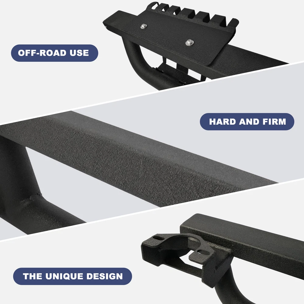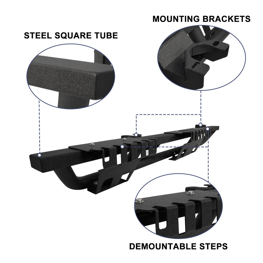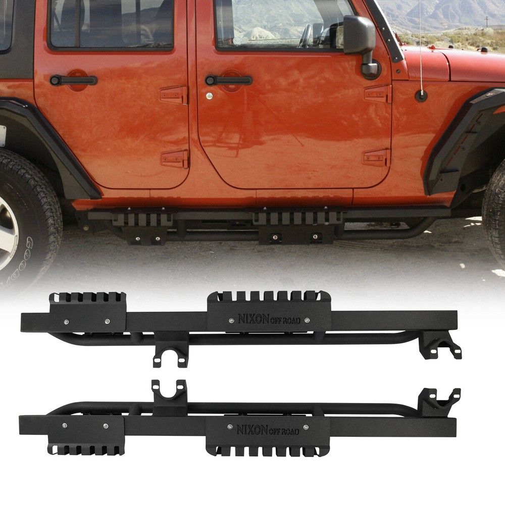 Side Steps Nerf Bar 2PC for 2007-2018 Jeep Wrangler JK 4DR Running Rock Slider Features Demountable and adaptable running boards - Apply to Daily Use & Off-road Use. Perfect for off-road use - These Nixon Offroad Rock Slider Side Steps provide excellent protection for the side and undercarriage of your Jeep while rock crawling. The durable non-slip step pads ensure an easy entrance and exit from your Wrangler JK. Easy installation - package includes installation manual for your reference, direct bolt-on installation. High quality built - applied cold rolled steel with a textured black powder coat for corrosion protection and durability. 100% Brand New in the box with manufacturer packaging, never been opened or installed before. Fitment Compatible for 2008-2017 Jeep Wrangler JK 4 Door Only Specification Material: Textured Black Powder Coated Steel Features: Mounting Hardware Included, Designed in USA Product Dimensions: 70.47 x 7.01 x 5.14 Inches Package Includes 2* pcs of Rock Sliders Side Steps 1* set of Mounting Accessories 1* Installation Manual Payment Delivery details Terms of sales About us Contact us Payment π We accept PayPal (Recommended), credit card, VISA, Google Pay & Discover etc. π Please submit your payment within 7 days after your purchase. π If not, eBay will automatically open an Unpaid Item Dispute on our behalf if the item(s) are not paid within 7 days. Delivery details π Please double check your delivery address and contact information. π All items will be shipped within 1 business days after payment received. π Tracking numbers will be easily accessible ASAP they are created and processed. Terms of sales π Free 60 days Return, we will cover the return post fee. π If a defective product was received, please do not hesitate to message us via eBay message. π We will response in 24 hours in business to resolve the problem π We stand behind our products. Items can be returned for exchange or full refund within 60 days from the date you receive. About us π Wolfstorm has a huge warehouse and office located in the United States. π All US domestic 48 states customers are able to benefit from the FREE SHIPPING services. π Our experienced, professional customer service representatives offers prompt and courteous service. π Best quality products, outstanding services and professional experience keep our customers. Contact us π Please feel free to contact us if you have any problems. π Emails will be replied within 24 hours in working days. π After hours emails will be replied on the next business day.