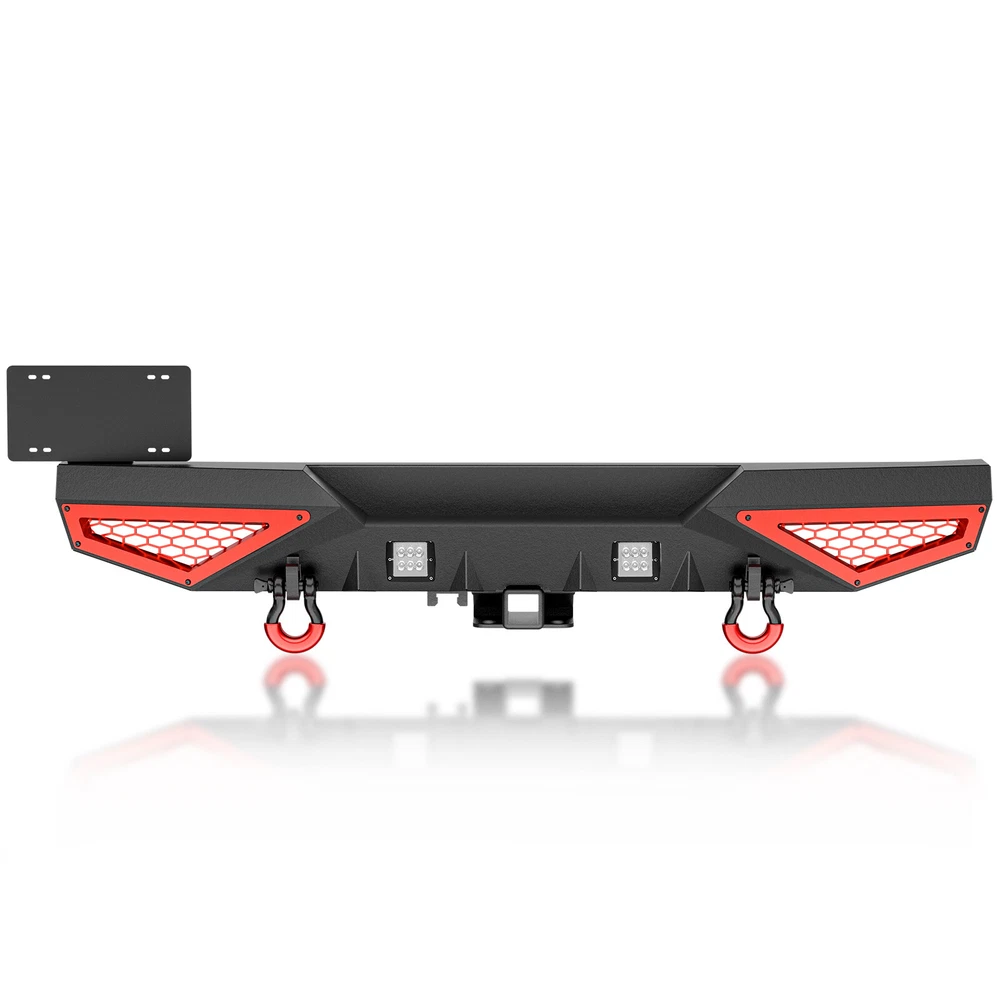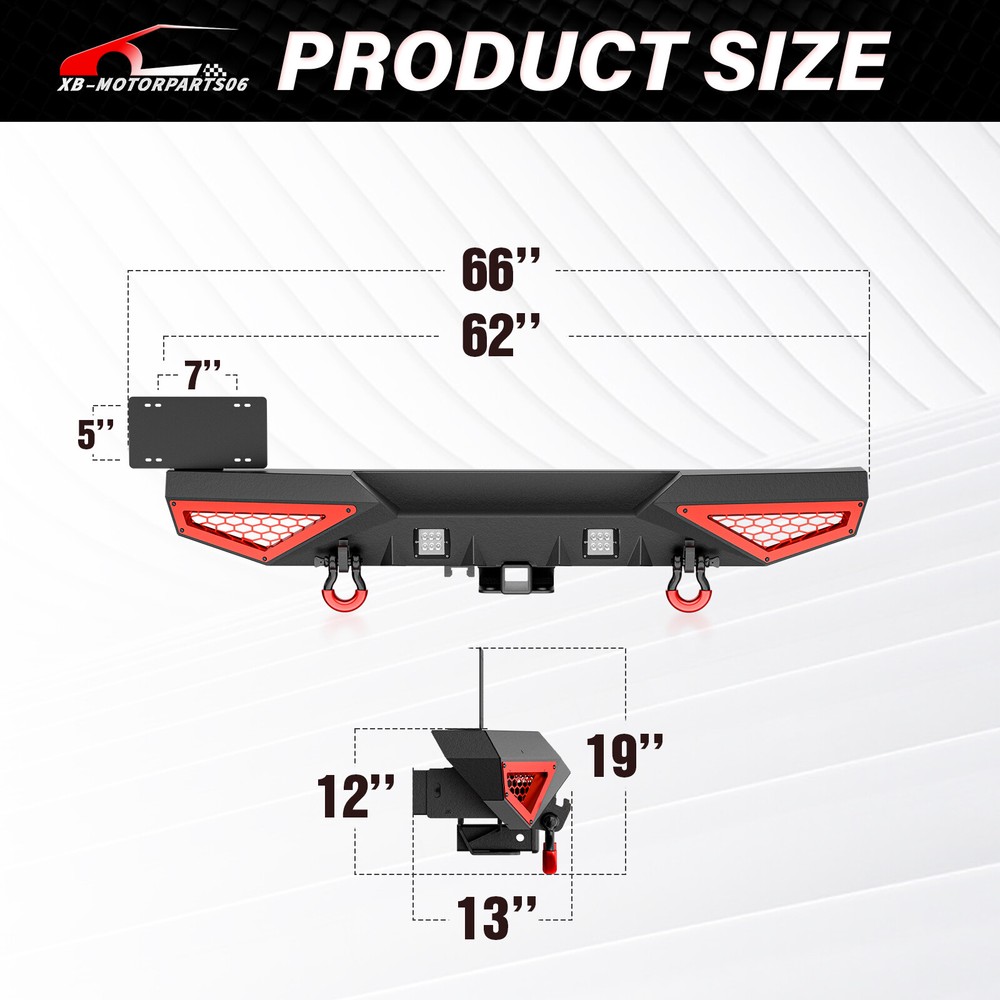 Rear Bumper W/ Detachable License Plate Frame For 2007-2018 Jeep Wrangler JK JKU For safety reasons, we strongly recommend that you seek professional installation services Suitable Models : Compatible with 2007-2018 Jeep Wrangler JK JKU Unlimited 2/4 Doors Package Includes: 1 x Rear Bumper, 2 x D-rings, 2 x LED Lights, 2" Hitch Receiver, 1 x manual, License Plate Frame, Paintable Decor, screw fittings Product Information: Product Dimensions: Please see the size picture Installation mode: Bolt-On With Sensor Holes: No Steel thickness: 3mm Placement on Vehicle: Rear Item Weight: 65 Pounds Material: Carbon Steel Color: Black (hand measurements may have an error of 2-3 mm/0.078-0.118 in) Feature: ① This bumper includes 4.75-ton capacity D-rings (rated at 9500 lbs.), 2X upgraded LED lights for illumination, Universal License Plate Bracket and a standard 2" receiver hitch. It offers customizable detachable decor to match your vehicle; ② High-strength steel, durable rear bumper. Textured black powder coating resists rust for long-lasting performance and appearance; ③ The package comprises mounting hardware and user-friendly installation instructions for a straightforward bolt-on installation—no drilling needed; ④ Durability, Waterproof, Rust-proof; Warranty Period: 2 year Standard Shipping (FedEx Ground or FedEx Home Delivery) Will usually ship within 3 business days of receiving cleared payment For safety reasons, we strongly recommend that you seek professional installation services Suitable Models : Compatible with 2007-2018 Jeep Wrangler JK JKU Unlimited 2/4 Doors Package Includes: 1 x Rear Bumper, 2 x D-rings, 2 x LED Lights, 2" Hitch Receiver, 1 x manual, License Plate Frame, Paintable Decor, screw fittings Product Information: Product Dimensions: Please see the size picture Installation mode: Bolt-On With Sensor Holes: No Steel thickness: 3mm Placement on Vehicle: Rear Item Weight: 65 Pounds Material: Carbon Steel Color: Black (hand measurements may have an error of 2-3 mm/0.078-0.118 in) Feature: ① This bumper includes 4.75-ton capacity D-rings (rated at 9500 lbs.), 2X upgraded LED lights for illumination, Universal License Plate Bracket and a standard 2" receiver hitch. It offers customizable detachable decor to match your vehicle; ② High-strength steel, durable rear bumper. Textured black powder coating resists rust for long-lasting performance and appearance; ③ The package comprises mounting hardware and user-friendly installation instructions for a straightforward bolt-on installation—no drilling needed; ④ Durability, Waterproof, Rust-proof; Warranty Period: 2 year