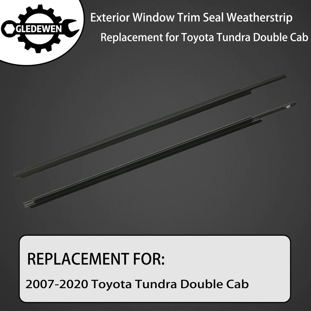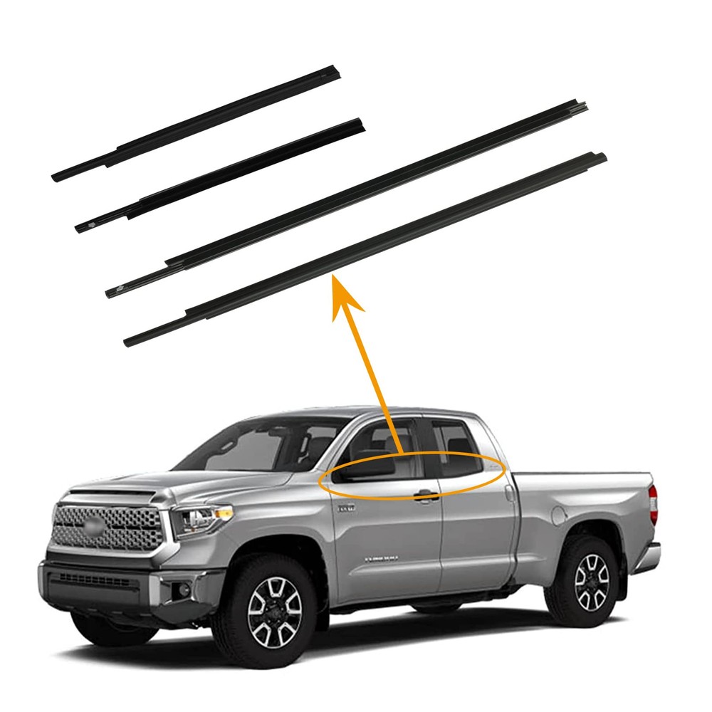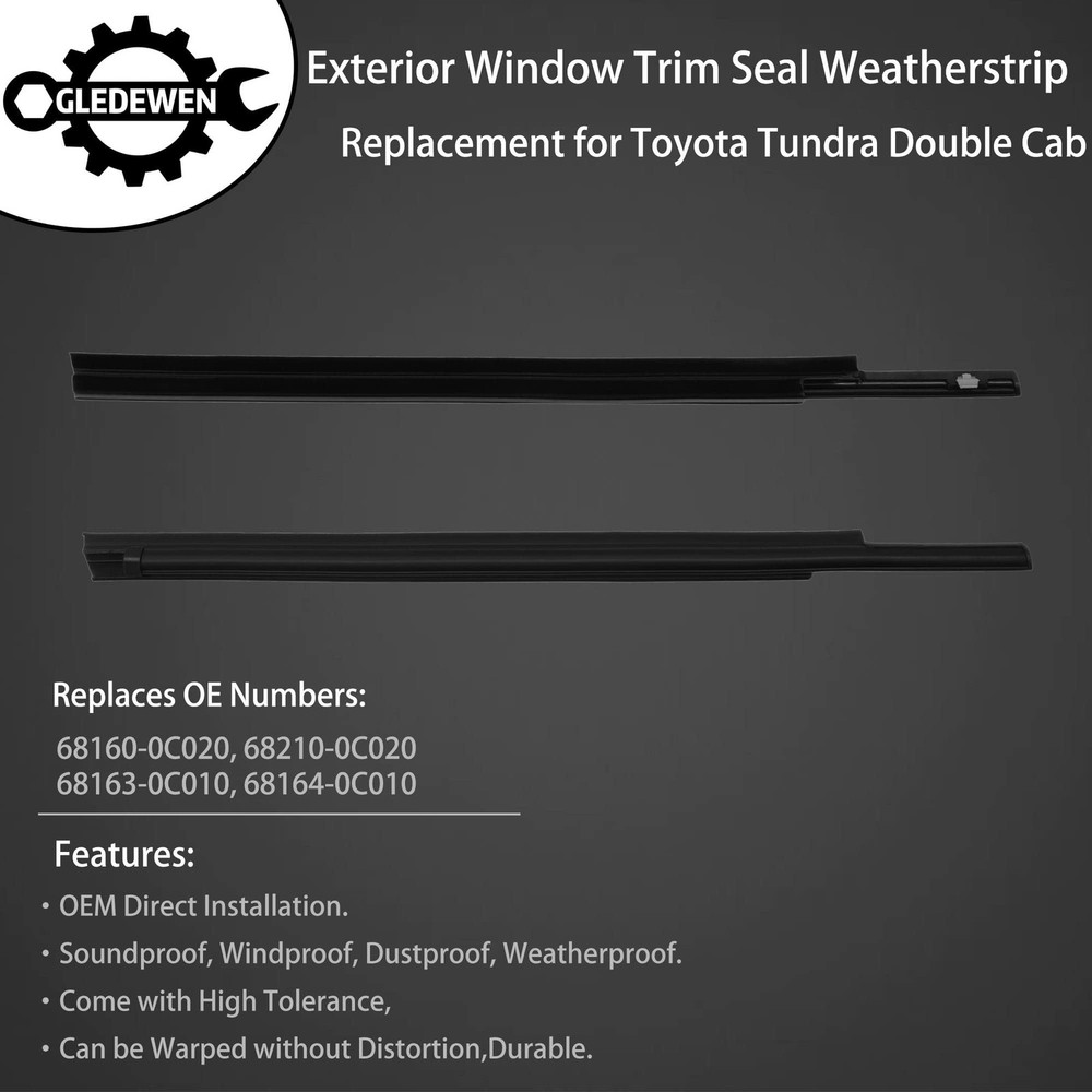 Packing List: 4 x Automotive Weather Stripping Accessories Conditin: New Compatible with: 2007-2020 Toyota Tundra Double Cab (Not Crew Max) Precise Fit Part Numbers: 68160-0C020 68210-0C020 68163-0C010 68164-0C010 Function:With the passage of time, the car window seal will gradually be worn and then broken. At this time, harmful water and debris will enter the door. It is recommended that you replace window weather seal in time. Replacing a new window trim seal moulding can prevent the occurrence of water accumulation, avoid the noise of car window glass knocking, and provide you with long-term stability and excellent performance. This door moulding kit meets or exceeds the oem standard, and has been tested in the factory, perfectly matching the original car, and can be installed directly We are a factory direct saler. Customers can spend a small amount of money and get high quality brand new automotive exterior accessories. This replacement door trim seal provides excellent value at the cheapest price. Own it now. 【Easy Installation】This outside window trim molding set is manufactured to the OE specification to provide factory appearance and direct-fit, just takes 15 minutes to replace the old door trim rain seal. 【Premium Quality】Long life-span matters, that is why our window gasket is made of high-quality rubber, ensures the accuracy of size matching, and achieve the functions of sealing, leakage prevention and sound insulation. 【Fit For】2007-2020 Toyota Tundra Double Cab (Not Crew Max). Door glass weather strip assembly remains soft at extremely low temperatures, and it also maintains elastic properties at extremely high temperatures. 【Replace OE NUMBER】681600C020,682100C020,681630C010,681640C010. The outer window felt has went through vehicle try-on testing, means you will get a fairly reliable tundra accessories. Works just like OEM, half the price. 【24-Month Warranty】If for any reason at all, you are not satisfied with the tundra weather stripping adhesive, you can contact us through amazon message to apply the service of carefree REPLACEMENT or REFUND.
