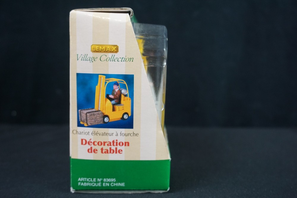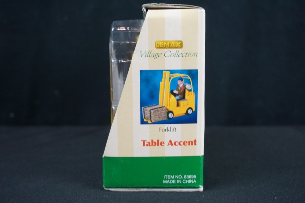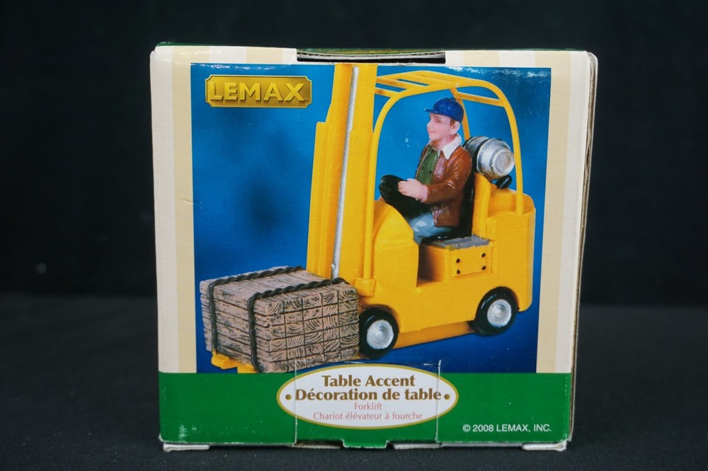 The Lemax Village Collection Accessory Forklift Table Accent 83695 is a medium-sized, figural piece suitable for any room, particularly perfect for Christmas villages. Manufactured in 2008, this American-style village accessory features a colorful, painted finish and is made of mixed materials including resin. It depicts a worker character in a construction theme, making it a unique and realistic addition to your Lemax village display. This retired collectible comes boxed and is part of the Village collection, adding character and detail to your holiday decor.