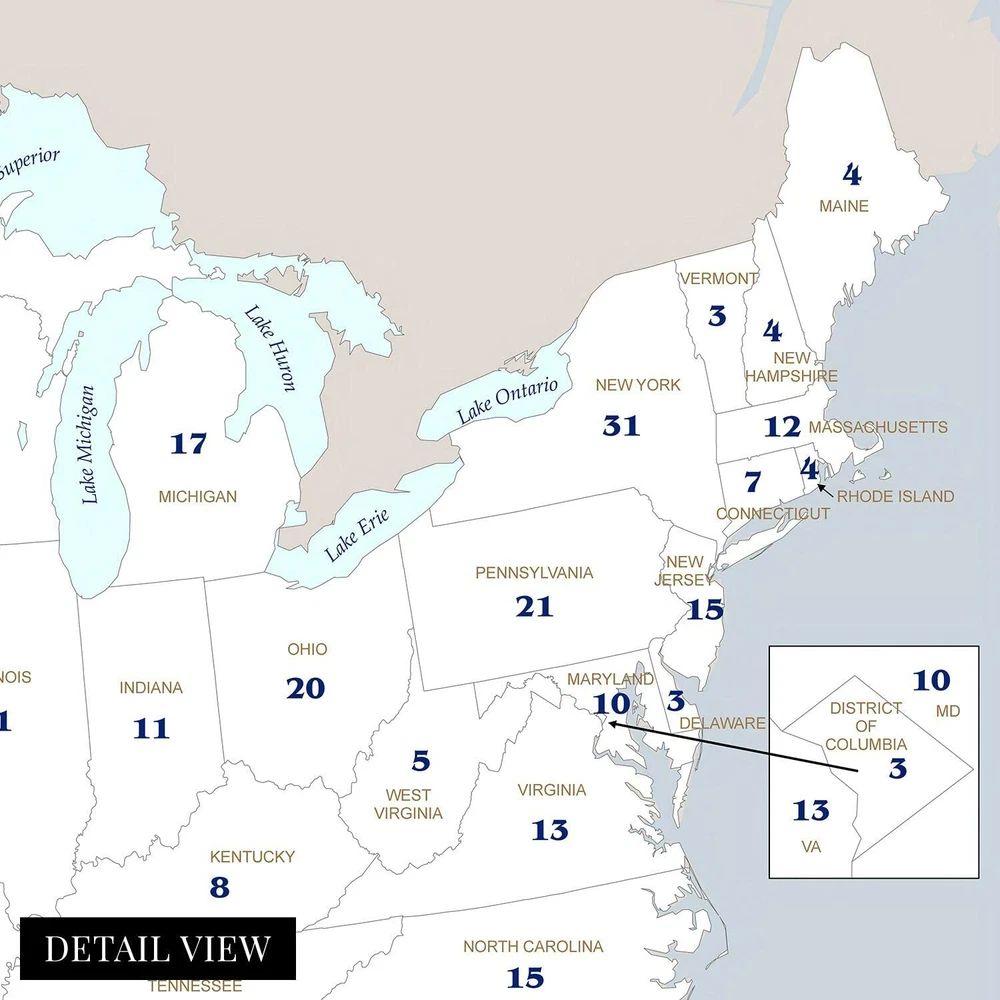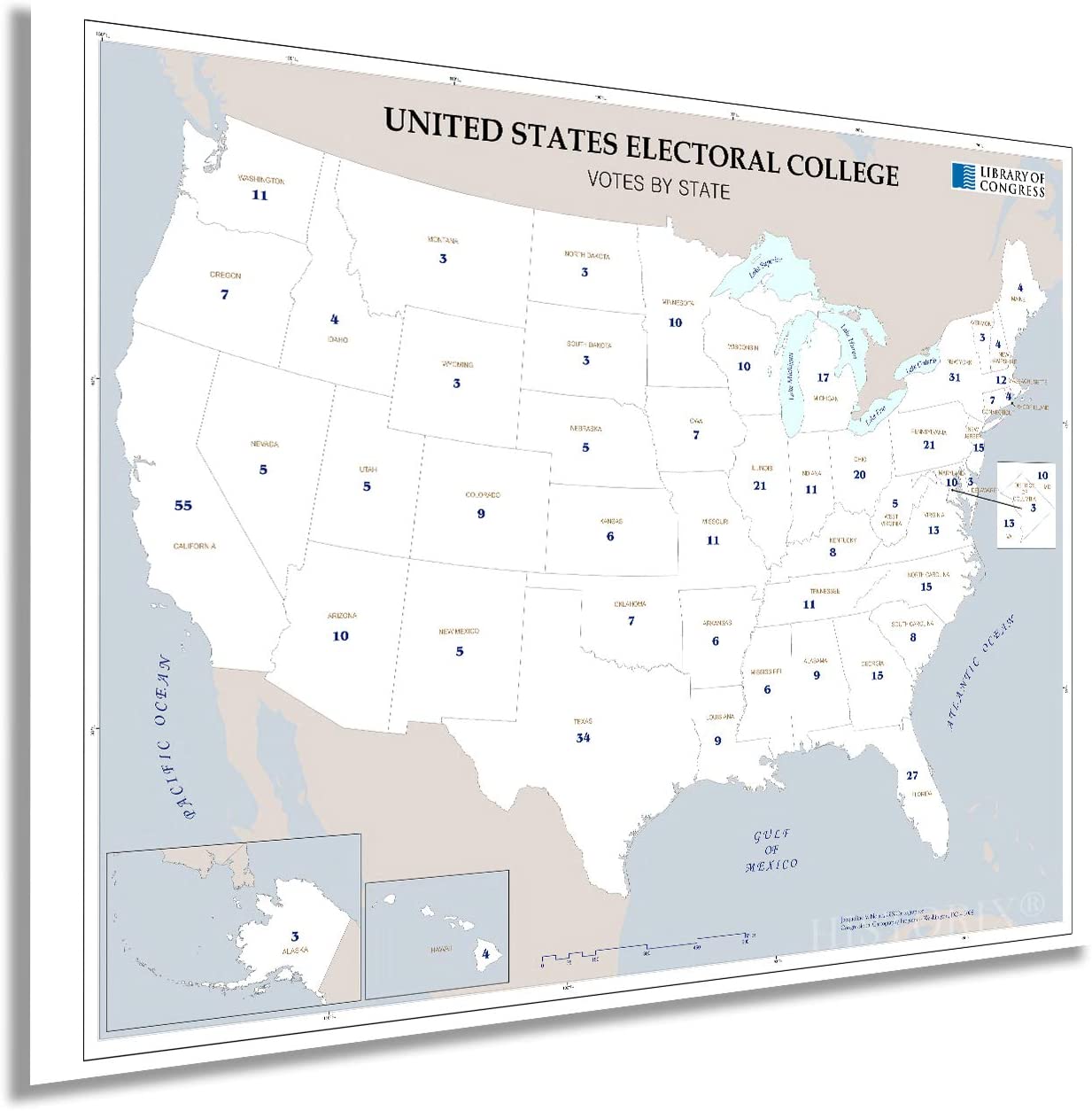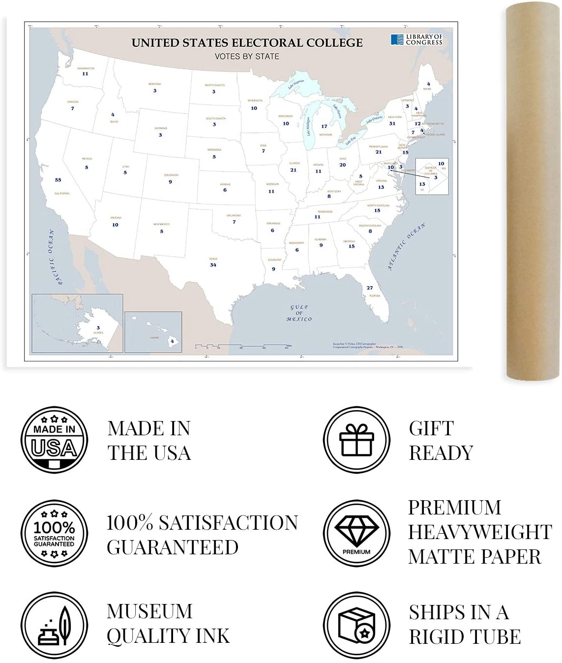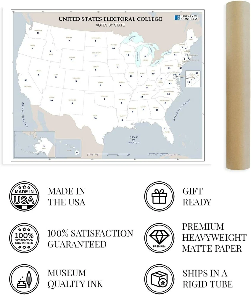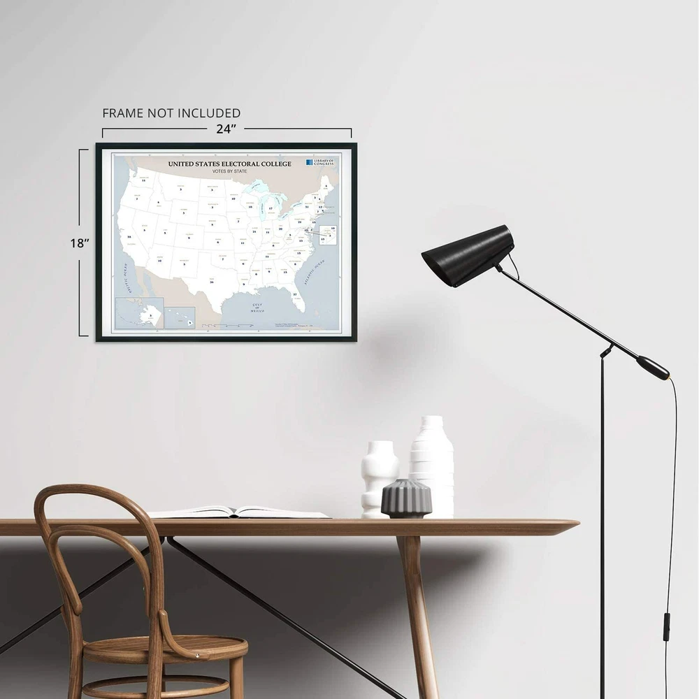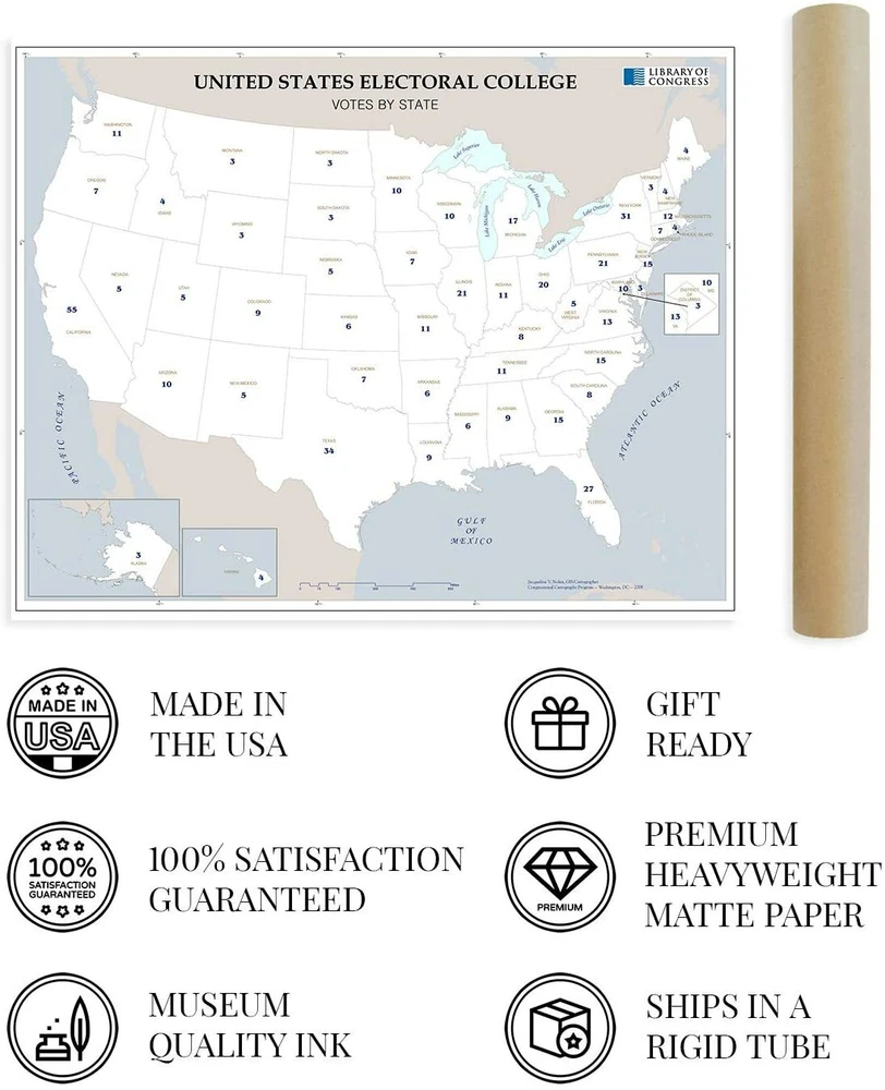 Feature Points HISTORIC PRINTS: You’ll love this high quality map of United States Electoral College Votes by State Map Poster. Our museum quality maps are archival grade, which means it will look great and last without fading for over 100 years. Our print to order maps are made in the USA and each map is inspected for quality. This beautiful artwork is a perfect addition to your themed decor. Maps look great in the home, study or office. They make a perfect gift as well. MUSEUM QUALITY: This high quality map print will be a great addition to your wall art. Don't waste money on cheap-looking, thin paper posters. We use thick, fine art print quality matte paper. Our professional’s choice matte paper displays artwork in high detail without glare. The color is vibrant and text is easy to read. When framed, this map looks absolutely stunning. ACCURATE MAP: This United States Electoral College Votes by State Map Poster is from an original found in the maps and geography division of the US Library of Congress. A true piece of history. See our product description section for more fascinating information about this historic map and its significance. READY TO FRAME: This print includes a 0.2 inch border for a perfect frame fit and look. Our maps are designed to fit easy-to-find standard frame sizes, saving you money from having to pay for a custom frame. Each map is inspected for quality and shipped in a rigid tube. Shipping is fast and free. HISTORIX: We love history and art. Sometimes old maps have tears, folds, separations and other blemishes. We digitally restore and enhance maps while keeping its historical character. All our maps are proudly made in the USA. We stand behind our products with a 100% satisfaction guarantee. Customers all over the world love our historic maps and we know you will too. Additional Information Produced in 2008, this electoral college map illustrates the number of electors from each state that will elect the President and Vice President of the United States. The college was formed with the idea that the President should be elected by the people and that representation between urban and rural voters should be mitigated. With 538 total electors, the election process requires a majority of 270 votes for a candidate to become President. The states choose their slate of electors based on political lines and are convened every four years before the general election. The college is subject to an ongoing debate with supporters arguing that it as a fundamental part of American federalism. Critics say that candidates that in the popular vote should not lose the general election due to a lack of majority in the college. The latter has only happened five times in US history. The college never meets as one central body instead, joining in their respective state capitals on the Monday after the second Wednesday in December. While each state has a slight variation in the process, the college is generally conducted in the same manner. The twelfth amendment requires the Congress to count elector votes then, thus determining the victor. Though it is widely assumed the electors will faithfully vote along party line, there can be faithless electors who break with their party and vote for their political opponent, though these cases have been rare with just over 150 since 1789. Our museum quality giclee print comes printed with archival ink on premium heavyweight matte paper. Shipped in a sturdy cardboard tube your print will arrive ready to be framed. This eye-catching vintage map print makes the perfect gift for anyone that loves history and imagery.