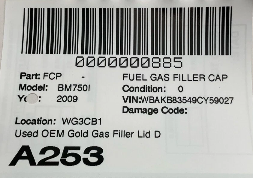 HK Auto Salvage HK Auto Salvage Montebello, CA Business Hours (PST/PDT) Mon - Fri 8am - 5pm Saturday 8am - 2pm Closed Sat & Sun Fuel Gas Filler Cap Year: 09 Model: BMW 750I Side: Type: Used Category: Condition: 0 VIN: WBAKB83549CY59027 Vehicle Stock #: A253 Part Stock #: 0000000885 Vehicle Info: GOLD Additional notes: Used Oem Gold Gas Filler Lid Door Like New Condition See Pictures Interchange: Also fits: Search for more parts from this donor vehicle Search for more parts for BMW 750I Airbag Notification If the item above is an airbag, I certify this airbag is not subject to recall and will be shipped in accordance with hazmat shipping requirements . Payment We accept credit cards through eBay Managed Payments only Sales tax collected by eBay where applicable COD available for orders placed for delivery to local businesses; please contact us prior to purchase to arrange Pay on pickup available for orders placed for local pickup Shipping We ship by FedEx, UPS, and USPS. Most items ship within 24 hours of payment; items paid for on the weekend or holidays ship on the following business day. Any free shipping we offer is for the continental United States only. If you are from Hawaii, Alaska, or a Territory of the United States, please request a shipping total before bidding and we will do our best to keep the cost low. Local delivery and local pickup options are also available. Warranty & Returns 30-day standard warranty on all general parts 90-day standard warranty on engines and transmissions Please verify fitment independently prior to purchase, as the information in the "compatibility" section above is generated by eBay Motors and not from us. If you have questions or concerns about fitment, please contact us prior to purchase. Contact Us If you have any questions regarding an eBay item, please CONTACT US via eBay messaging before you make the purchase. Please verify fitment independently prior to purchase, as the information in the "compatibility" section above is generated by eBay Motors and not from us. If you have questions or concerns about fitment, please contact us prior to purchase. After you have received your product in satisfactory condition, please leave us positive feedback. If there is a problem with your purchase, do not leave neutral or negative feedback: CONTACT US so that we can help you to resolve your issue to your satisfaction. Powered by Checkmate
