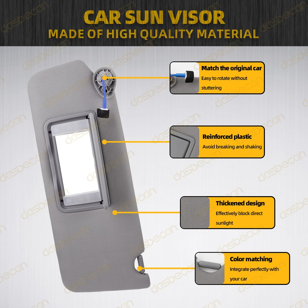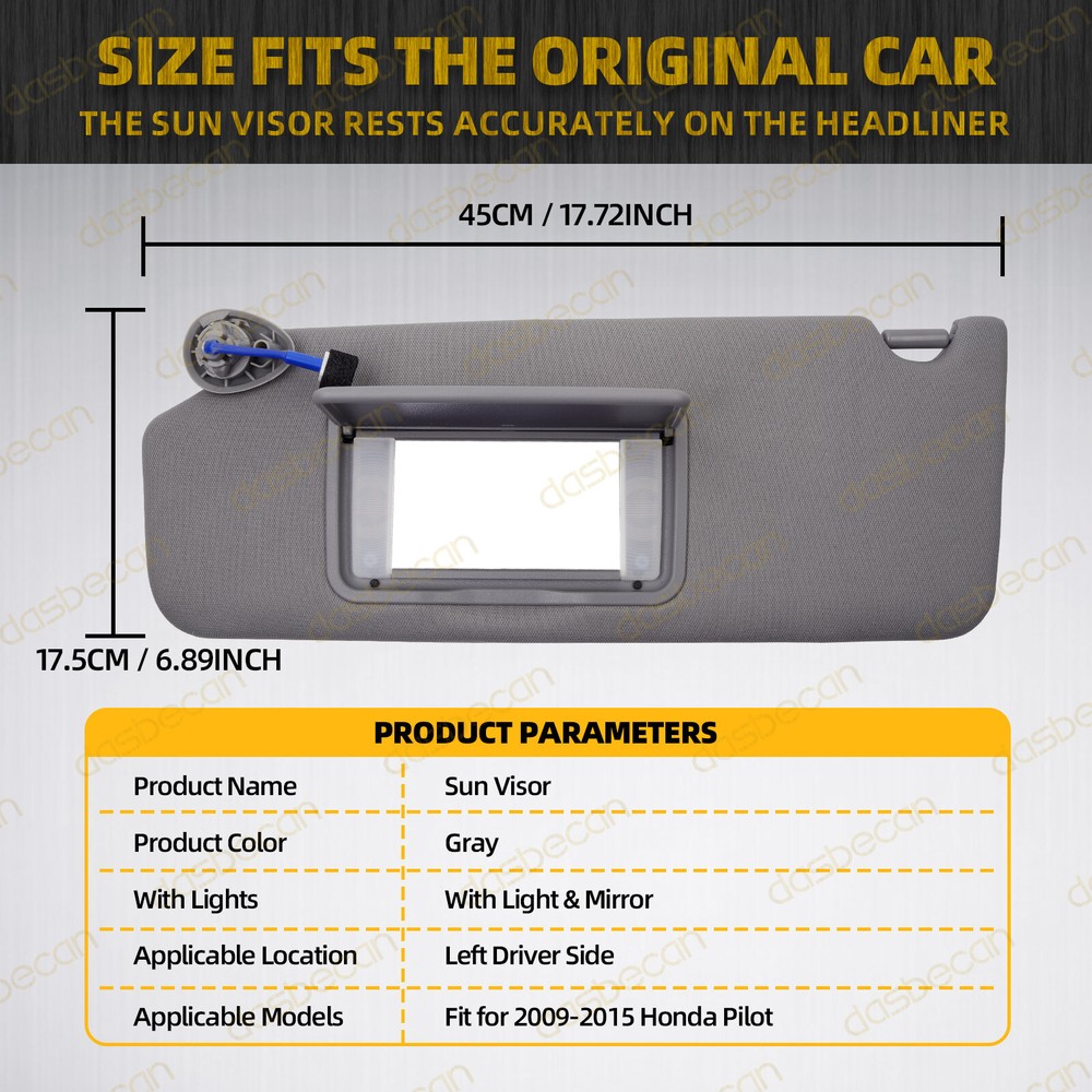 Features & details 【 Compatible With 】 2009-2015 Honda Pilot Please check if the picture and part number in the link are the same as your original part. 【Replace OE Number】 83280-SZA-A01ZA, 83280SZAA01ZA 83280-SZA-A02ZA, 83280SZAA02ZA 83280-SZA-A04ZA, 83280SZAA04ZA 【 Description 】 Material: High Quality ABS Plastic + Cloth Type : Sun Visor Color: GRAY , As Pictures Shown Installation: Direct Replacement Place on Vehicle: Front, Left, Driver Side 【 Features 】 Extendable According to the original factory specifications. 100% brand new and high quality guaranteed. Decorate your car charming luxury vivid. Easy to use and to operate at affordable prices. Perfect cover that is useful, helpful and so practical. Made of light weight & top-grade durable ABS plastic + cloth material. Will dramatically improve the sporty appearance for your car. The product can avoid the sun glare to protect the driver's vision and ensure driving safety. Non-destructive installation:The sun visor replacement procedure is simple,precise mounting holes and snaps,no drilling,just snap the sun visor bracket with the car bracket cover parts in the correct position. 【 Package Included 】 1x Sun Visor Left Driver Side As Pictured ( With Mirror & Lights ) This item doesn't come with manual installation. 【 Note 】 Before installation and disassembly. It is necessary to keep the latch of the sun visors in the open state. Professional installation is highly recommended. 【Service & Warranty】 Purchase from DASBECAN, enjoy 1 year no worries-warranty, whenever you met issue when installing or using, please contact us via eBay Message, and we will reply within 24 hours and help solve the problem. Customer Question & Answers Q1: Will This Part Fit My Vehicle? We list all the compatiblity, if your vehicle does not show up on the compatibility table at the top of our listings, welcome you to contact us for free consulation before purchasing a product. Q2: Does they come with warranty? All of our product comes with 1-year warranty, but some times you need to pay the shipping fee. Q3: How to use it? If you don't know how to install this accessory, welcome to contact us, we will provide you with a video guide. Payment Shipping Warranty & Service Returns/Exchanges Contact us Payment Most of the payment methods are available, such as Paypal, Payoneer, Credit Card. Within 1 day of receiving your payment, we will start processing your order. Shipping All Items Will Be Ship Within 1working Days, and We Will Ship out All Orders As Soon As Possible After Payment Verified, Please Allow up to 1-6 Business Days for Delivery. Why Choose the Us Stock? 1. Us Local Shipping, No Extra Customs Cost. 2. Fast Delivery: 1-6 Working Days Delivery. Warranty & Service All the product in our store come with a 1-year-warranty. If there is a problem with the product you purchased within 1 year, please contact us, we will provide you with after-sale protection. Our job is not complete until each customer is satisfied! Receiving positive feedback is extremely important to us. We give all our buyers positive feedback as soon as payment is received Negative feedback and bad ratings do not solve the problem! If you contact us via eBay, we will be more than happy to work with you! Returns/Exchanges If you received an incorrect, damaged, defective, or item not as described , contact us for a partial/full refund or replacement on our costs. If we shipped you the wrong part, we pay for the return shipment and send you the correct part. If you ordered the wrong part, contact us for a return address and simply return it,give us a tracking number. We will send you the new item as soon as the returned package is received; If you simply don't want the part, ship it back and give us a tracking number. After we receive the item, we will refund the item price minus shipping costs. All returns must be done within 30 days after receiving the package. Parts must be new and unused in the original condition: including box, packaging and all other accessories,or we will charge you a partial costs. Contact us If you encounter any problems during purchase or use, please contact us via eBay message directly. On May 5, 2025 at 01:25:31 PDT, seller added the following information: