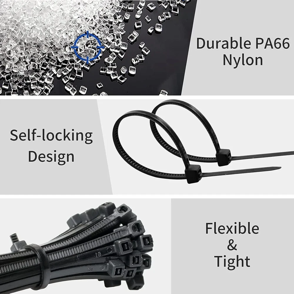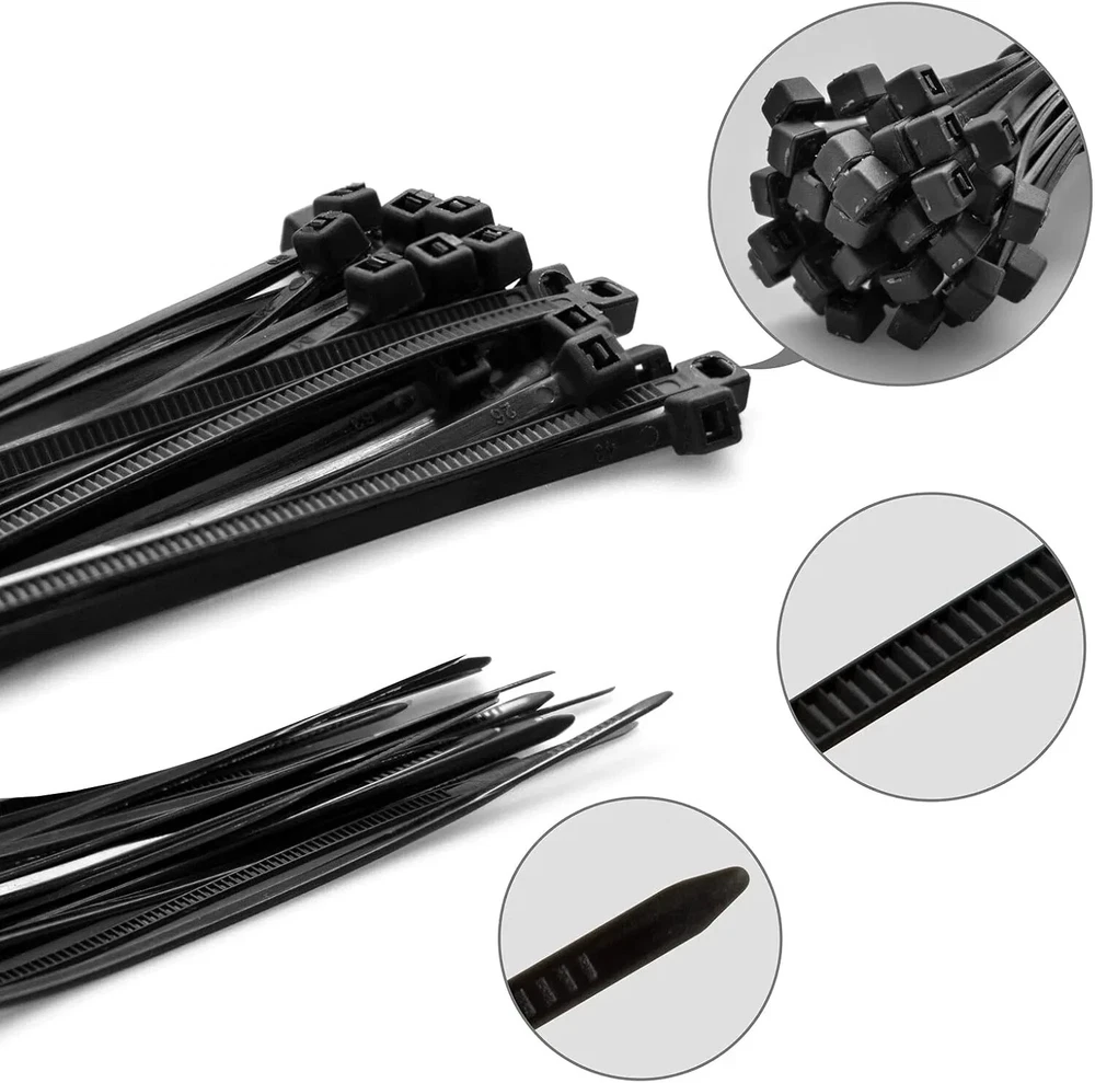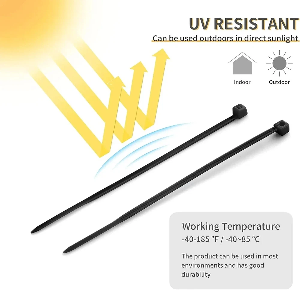 Multi-Purpose Nylon Zip Ties 200 Piece. Self-locking Fastener Design With Ultra Strong Plastic 8 Inch. The tensile strength of zip ties is 40lbs. Black zip ties heavy duty can be used with various applications for home, garden, organizing electrical cable ties , indoor and outdoor use