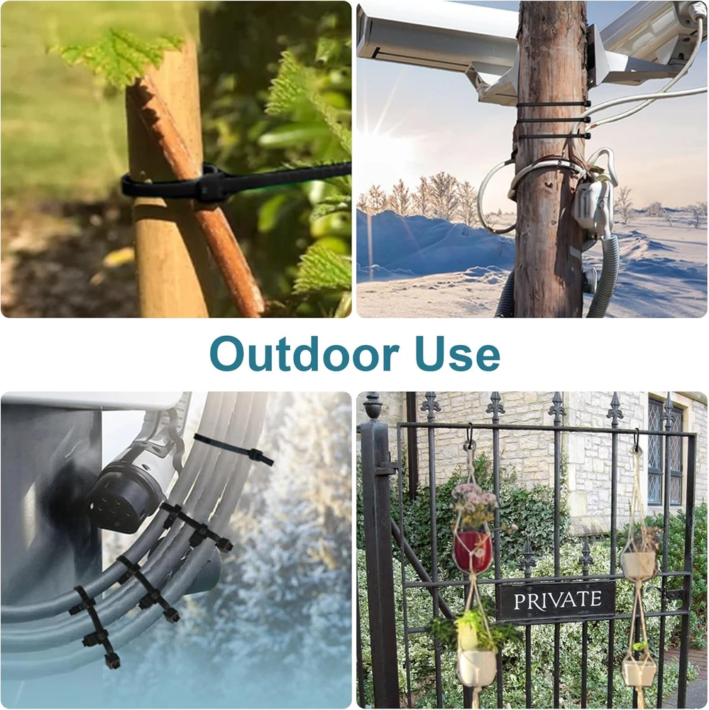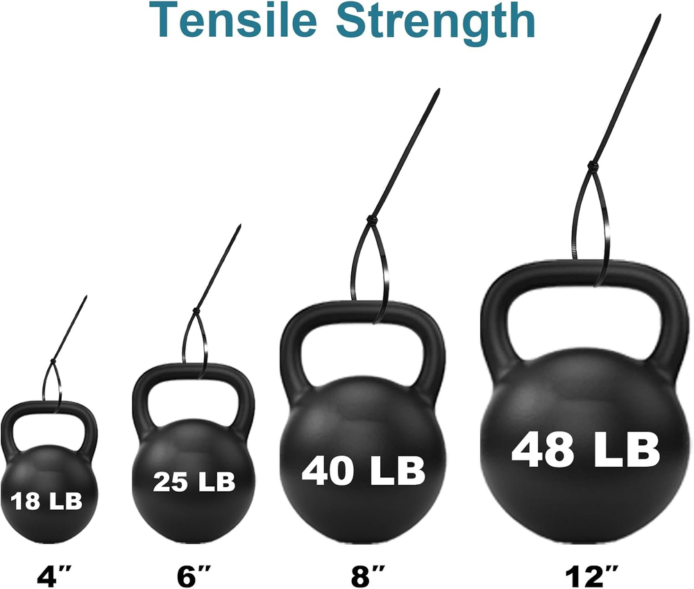 4 Sizes: 4", 18 lb , 50 Pack| 6", 25 lb , 50 Pack| 8", 40 lb , 50 Pack| 12", 48 lb, 50 Pack Multi-purpose Use: LOCKLOCK plastic ties multiple sizes and tensile strength are suitable for various situations High Quality: LOCKLOCK tie wraps are crafted from entirely new UV-resistant nylon materials, ensuring durability in both snow and direct sunlight Indoor & Outdoor: LOCKLOCK tie straps perfect for home, office, garden, garage, server rooms, and packaging Warranty: Customer will receive a 100% refund if there is any quality issue with LOCKLOCK zip ties Zip Ties Assorted Sizes 4"+6"+8"+12", 200 Pack LOCKLOCK Co.,Ltd is a professional manufacturer of nylon cable ties. We will continue to improve the product quality, provide top grade products and the best service for our customer. Make your best choice, LOCKLOCK zip ties! High Quality LOCKLOCK black zip ties are made of UV resistant halogen free nylon 66. Operation temperature is -40℉to 185℉with UL94V-2 flammability. Higher Tensile Strength The tensile strength of LOCKLOCK zip tie is 18 lb(4"), 25 lb(6"), 40 lb(8") , 48 lb(12"), higher than others. LOCKLOCK tie wraps width is 0.1in(4"), 0.12in(6"), 0.14in(8") , 0.14in(12"), wider than industry standards. You can use LOCKLOCK cable tie without worrying they will break. Self-locking Design LOCKLOCK ziptie can be easily locked in, tightly and securely. One-piece construction for consistent performance and reliability. Multi-purpose Applications LOCKLOCK plastic ties perfect for home, office, garden,garage, travel and workshop tidy. LOCKLOCK tie straps perfect for organizing electrical wires, hanging lights and banners. LOCKLOCK zipties perfect for attaching fences/net, plants, securing bike/car accessories, etc. Warranty: LOCKLOCK zip ties have a 1-year warranty period. Customer will receive a 100% refund if there is any quality issue with LOCKLOCK zip ties. Tips: 1. Please keep out of reach of the children. 2. Please keep it sealed for long-term use. 3. Please use zipties in proper temperatures. 4. Please use ziptie in proper tensile strength. Package Includes: Black Zip Ties 4+6+8+12 inch, 200 Pack.